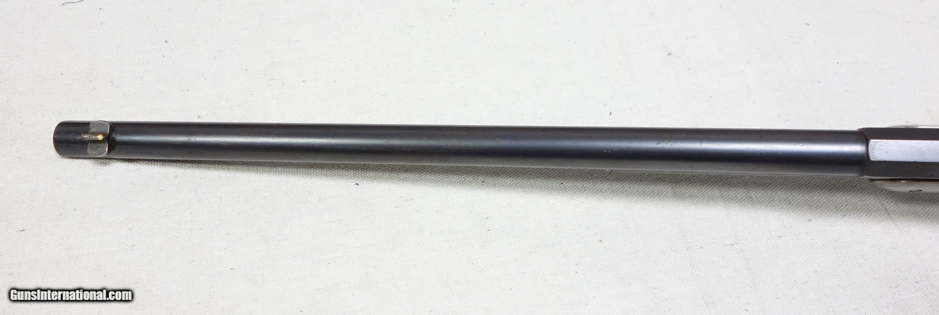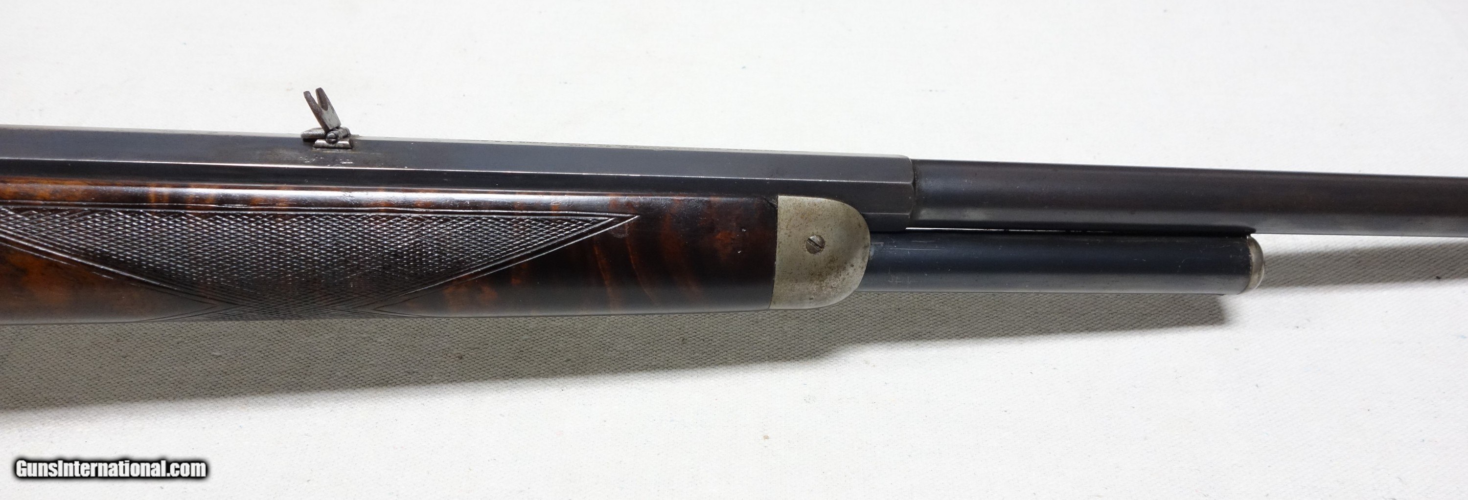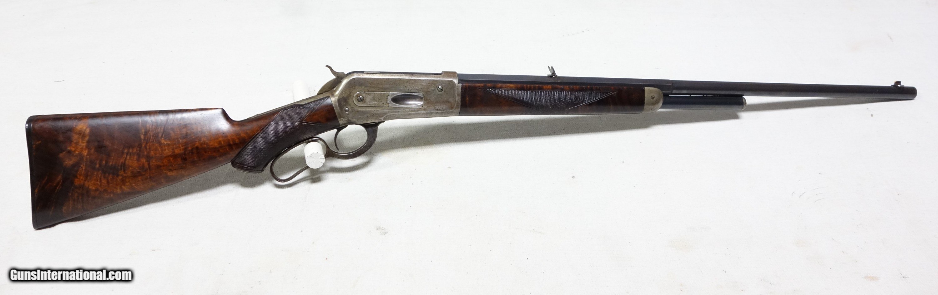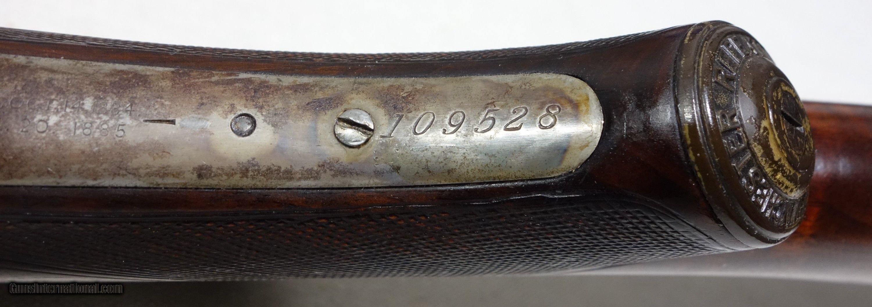 Description: ***SOLD*** Winchester 1886 Deluxe rifle in 45-70 caliber S/N 109528 made in 1896 26" half octagon barrel. Bore looks good inside front half, reflective with strong rifling, grooves are darker/rougher from midpoint to frame but still showing some bright rifling throughout. Strong original blue about 90%. Some fading case colors remain on receiver and hammer along with light surface oxidation. 2/3 length magazine tube. Beautiful 3x wood set with little to no wear showing some light surface maintenance over the years, but does not appear to have been monkeyed with otherwise. Deluxe checkering, pistol grip cap, composite buttplate with widow's peak heel. Sights consist of a Lyman ivory bead up front and a Winchester 2 leaf folding rear. Great mechanical functions. Please add $100 for expedited and fully insured shipping from Alaska in a custom cut, foam lined box for added protection. SOLD Antique: Yes Rifle Caliber: .45-70 Government |