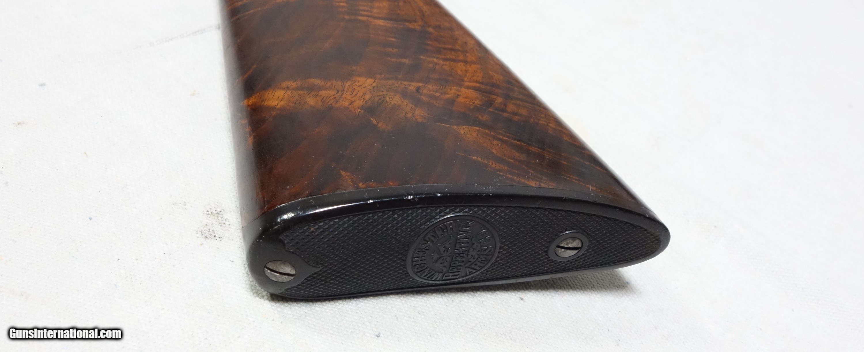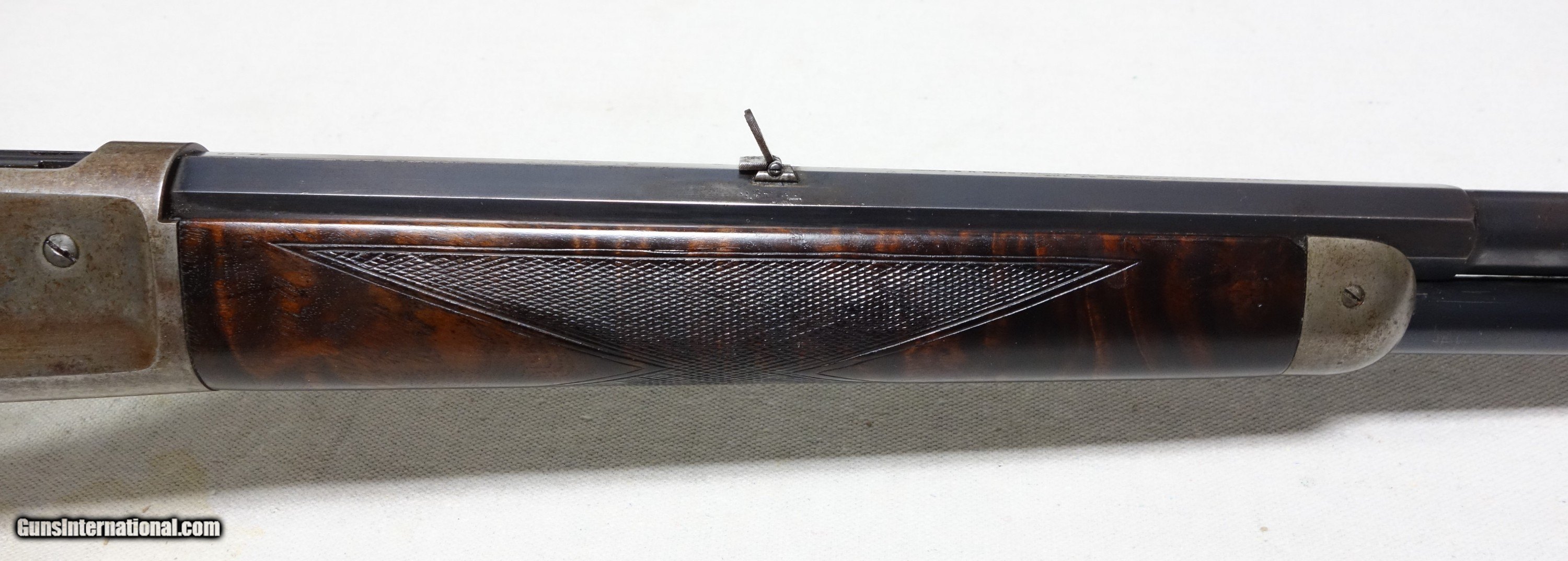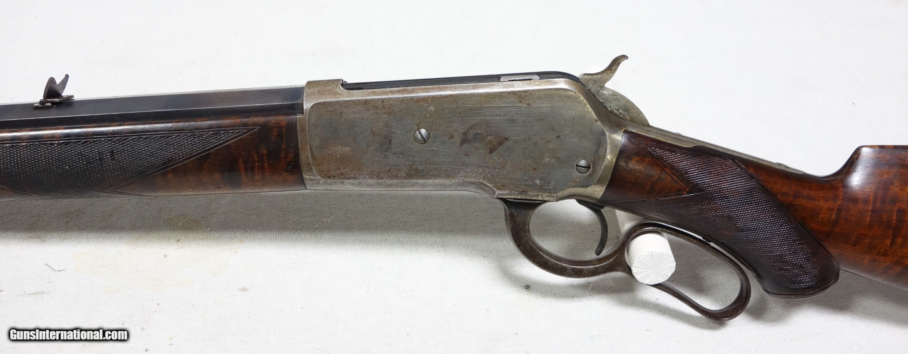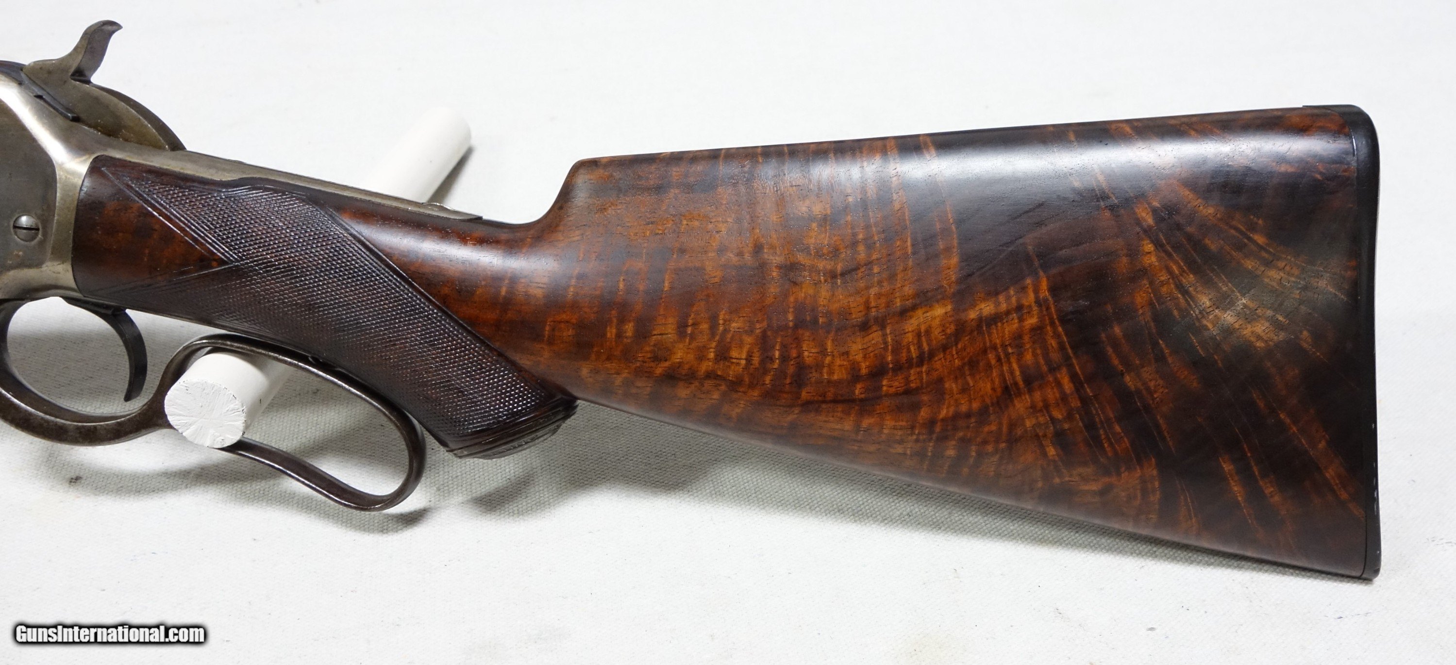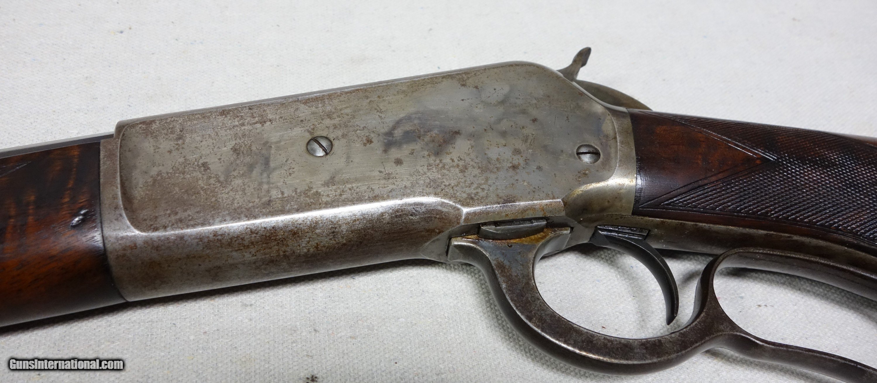 Description: ***SOLD*** Winchester 1886 Deluxe rifle in 45-70 caliber S/N 109528 made in 1896 26" half octagon barrel. Bore looks good inside front half, reflective with strong rifling, grooves are darker/rougher from midpoint to frame but still showing some bright rifling throughout. Strong original blue about 90%. Some fading case colors remain on receiver and hammer along with light surface oxidation. 2/3 length magazine tube. Beautiful 3x wood set with little to no wear showing some light surface maintenance over the years, but does not appear to have been monkeyed with otherwise. Deluxe checkering, pistol grip cap, composite buttplate with widow's peak heel. Sights consist of a Lyman ivory bead up front and a Winchester 2 leaf folding rear. Great mechanical functions. Please add $100 for expedited and fully insured shipping from Alaska in a custom cut, foam lined box for added protection. SOLD Antique: Yes Rifle Caliber: .45-70 Government |