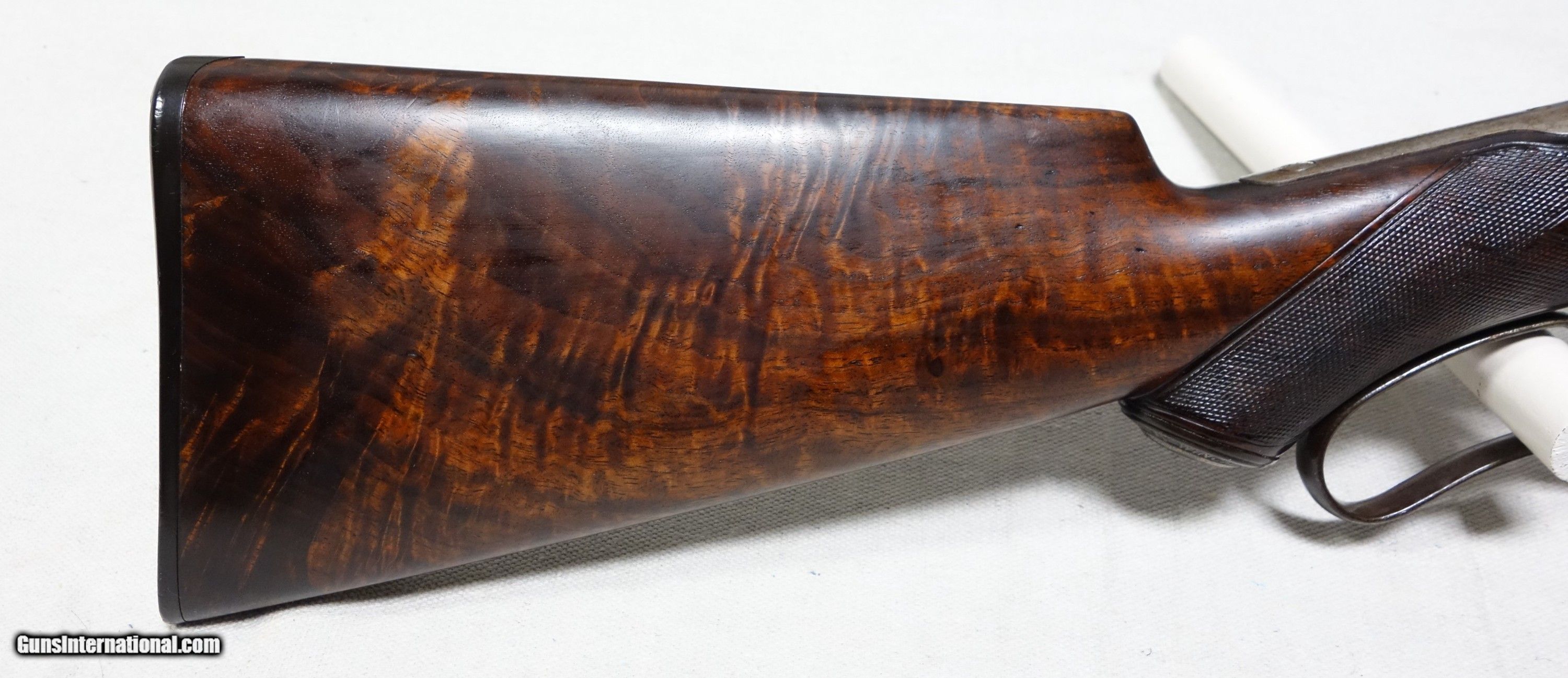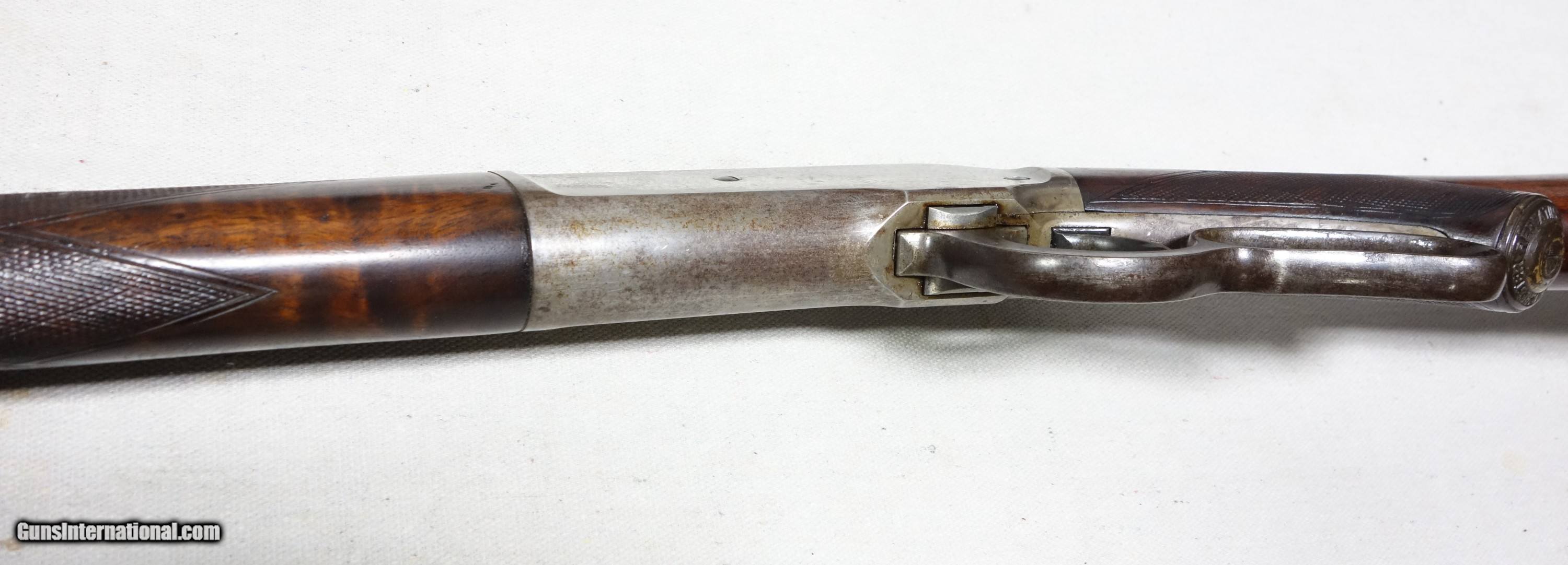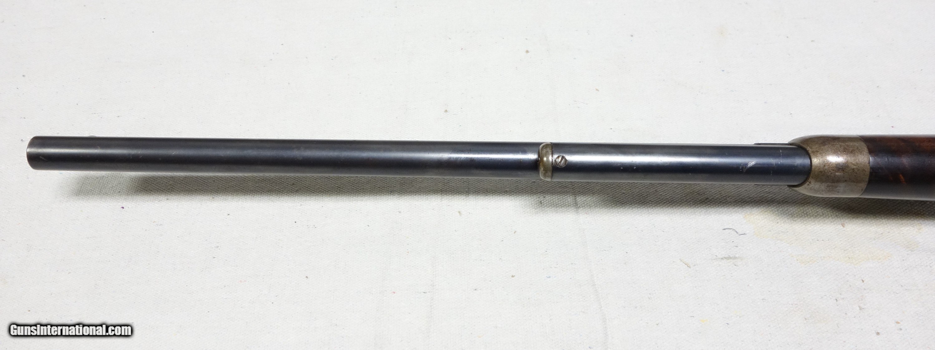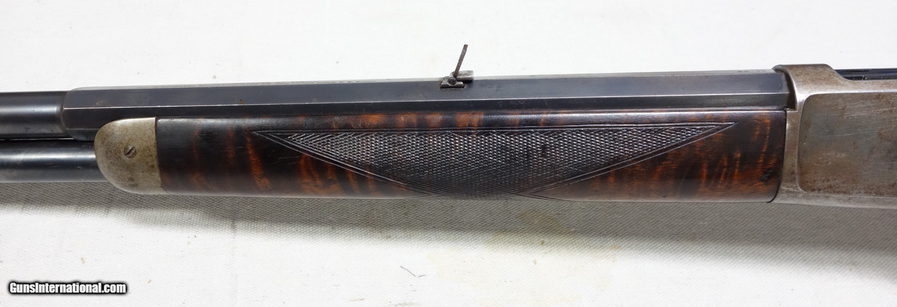 Description: ***SOLD*** Winchester 1886 Deluxe rifle in 45-70 caliber S/N 109528 made in 1896 26" half octagon barrel. Bore looks good inside front half, reflective with strong rifling, grooves are darker/rougher from midpoint to frame but still showing some bright rifling throughout. Strong original blue about 90%. Some fading case colors remain on receiver and hammer along with light surface oxidation. 2/3 length magazine tube. Beautiful 3x wood set with little to no wear showing some light surface maintenance over the years, but does not appear to have been monkeyed with otherwise. Deluxe checkering, pistol grip cap, composite buttplate with widow's peak heel. Sights consist of a Lyman ivory bead up front and a Winchester 2 leaf folding rear. Great mechanical functions. Please add $100 for expedited and fully insured shipping from Alaska in a custom cut, foam lined box for added protection. SOLD Antique: Yes Rifle Caliber: .45-70 Government |