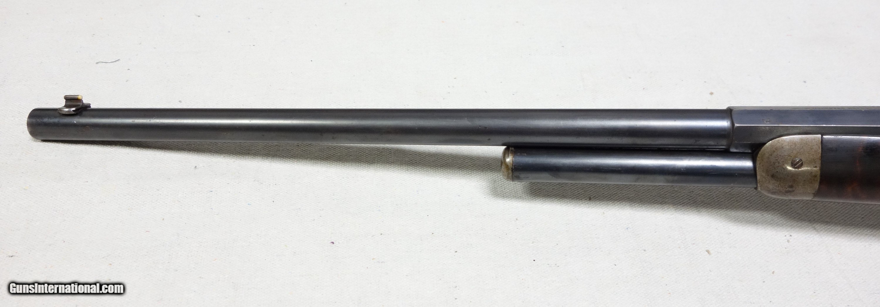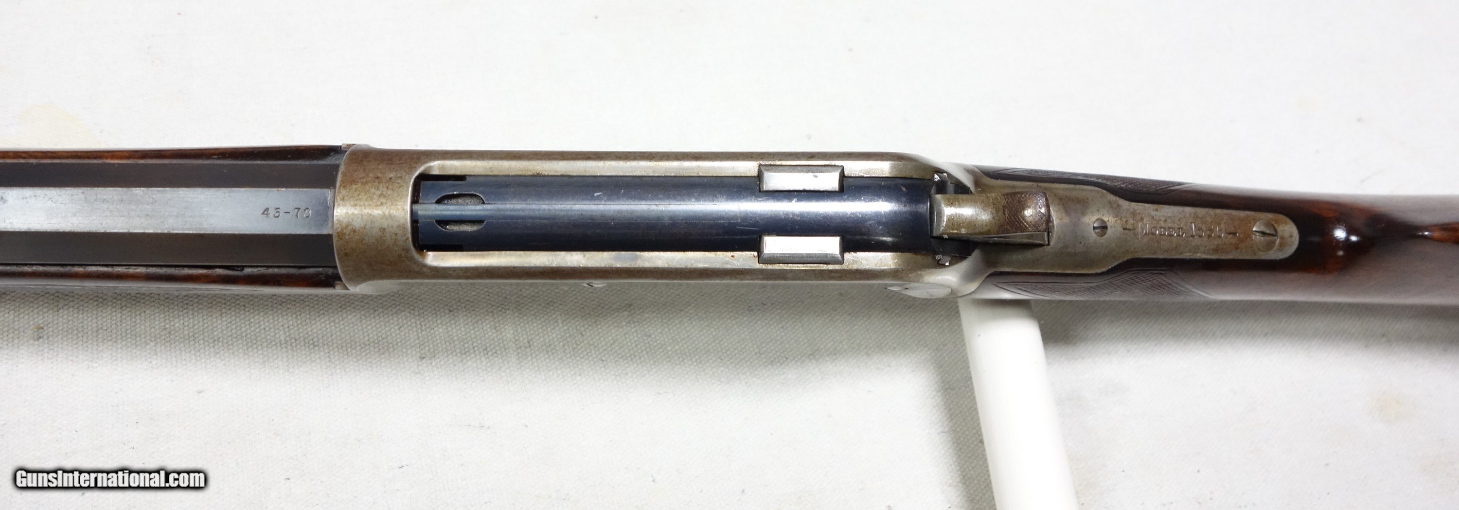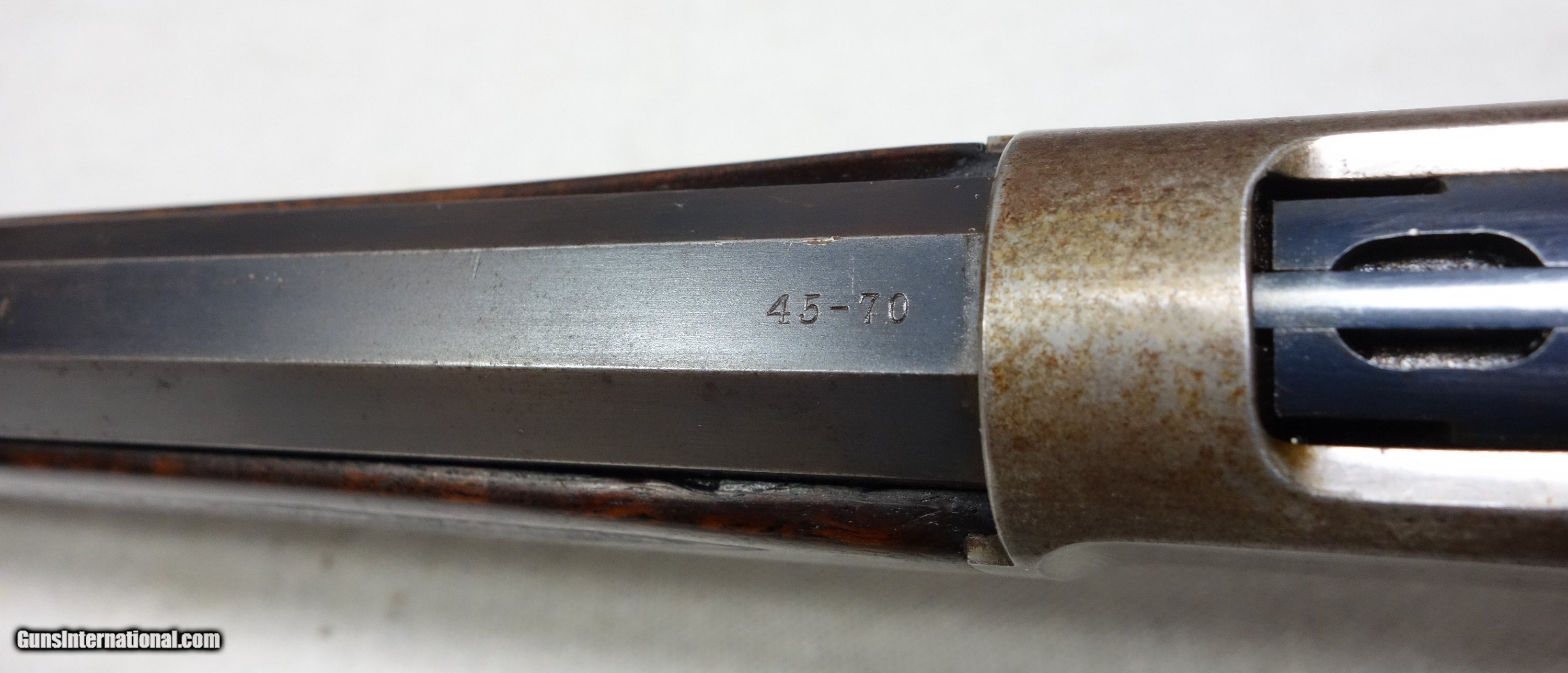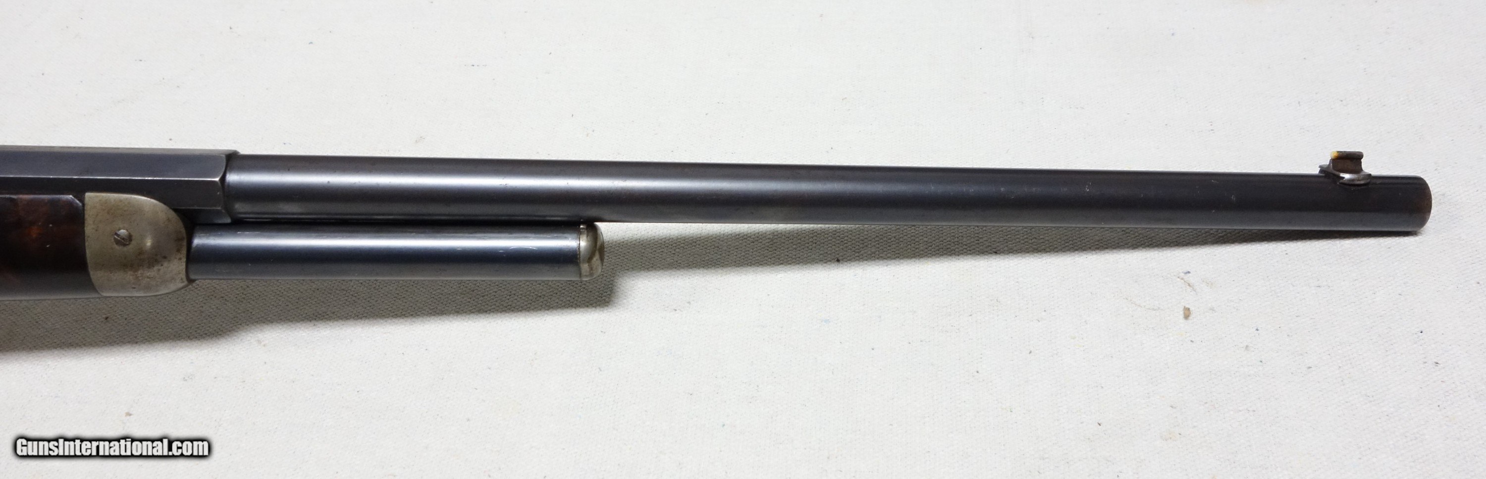 Description: ***SOLD*** Winchester 1886 Deluxe rifle in 45-70 caliber S/N 109528 made in 1896 26" half octagon barrel. Bore looks good inside front half, reflective with strong rifling, grooves are darker/rougher from midpoint to frame but still showing some bright rifling throughout. Strong original blue about 90%. Some fading case colors remain on receiver and hammer along with light surface oxidation. 2/3 length magazine tube. Beautiful 3x wood set with little to no wear showing some light surface maintenance over the years, but does not appear to have been monkeyed with otherwise. Deluxe checkering, pistol grip cap, composite buttplate with widow's peak heel. Sights consist of a Lyman ivory bead up front and a Winchester 2 leaf folding rear. Great mechanical functions. Please add $100 for expedited and fully insured shipping from Alaska in a custom cut, foam lined box for added protection. SOLD Antique: Yes Rifle Caliber: .45-70 Government |
