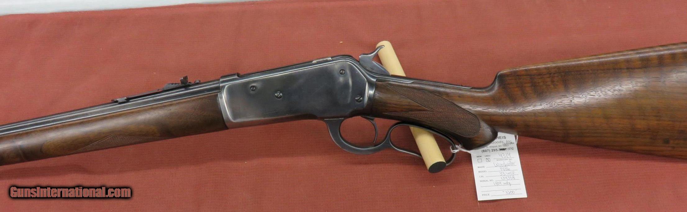 Description: Winchester Model 1886 Deluxe Lightweight Pistol Grip solid frame rifle, 33WCF, #134XXX, 1904 mfg, tow thirds magazine, Marbles rear sight, two holes on left side where a long Lyman peep sight once was, wood has been refinished and checkering recut, original composition buttplate, excellent bore, 65% blue overall. SOLD |