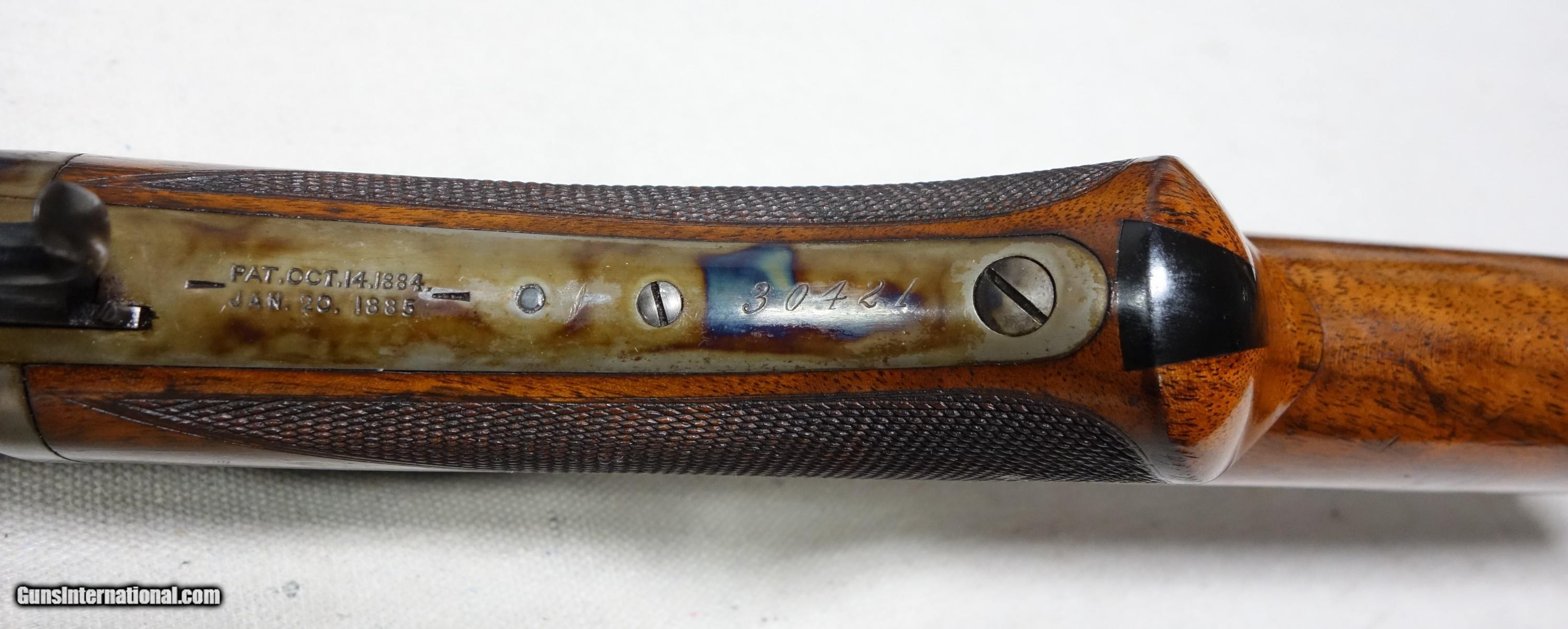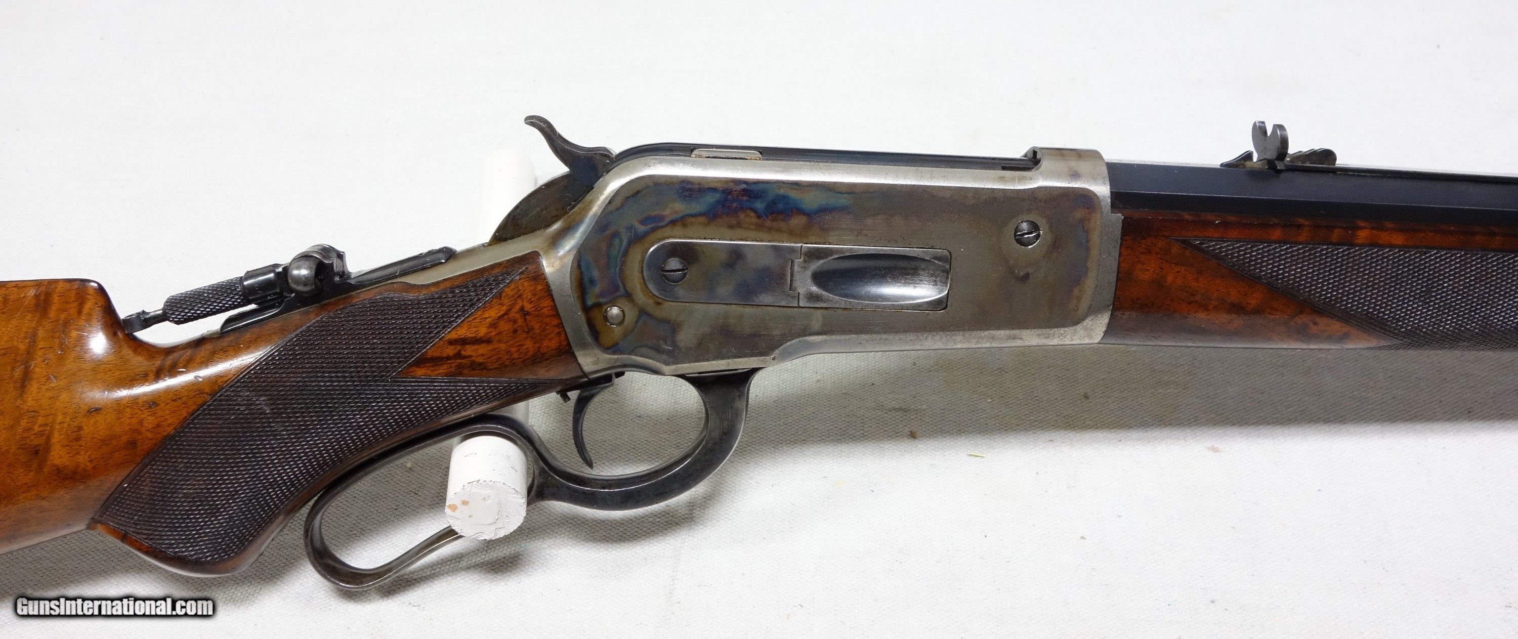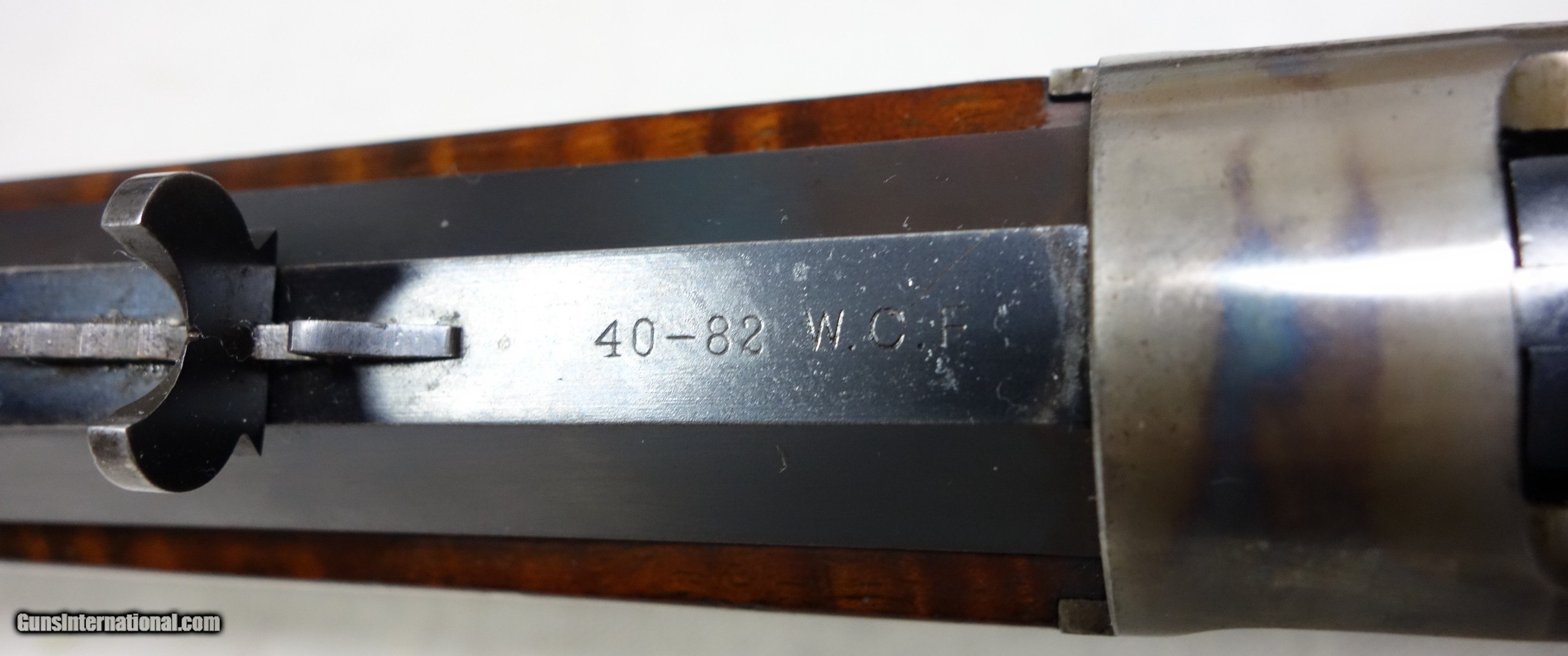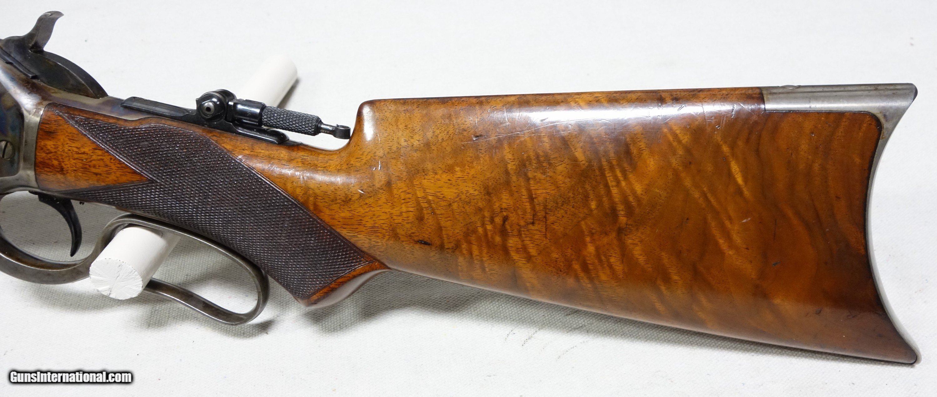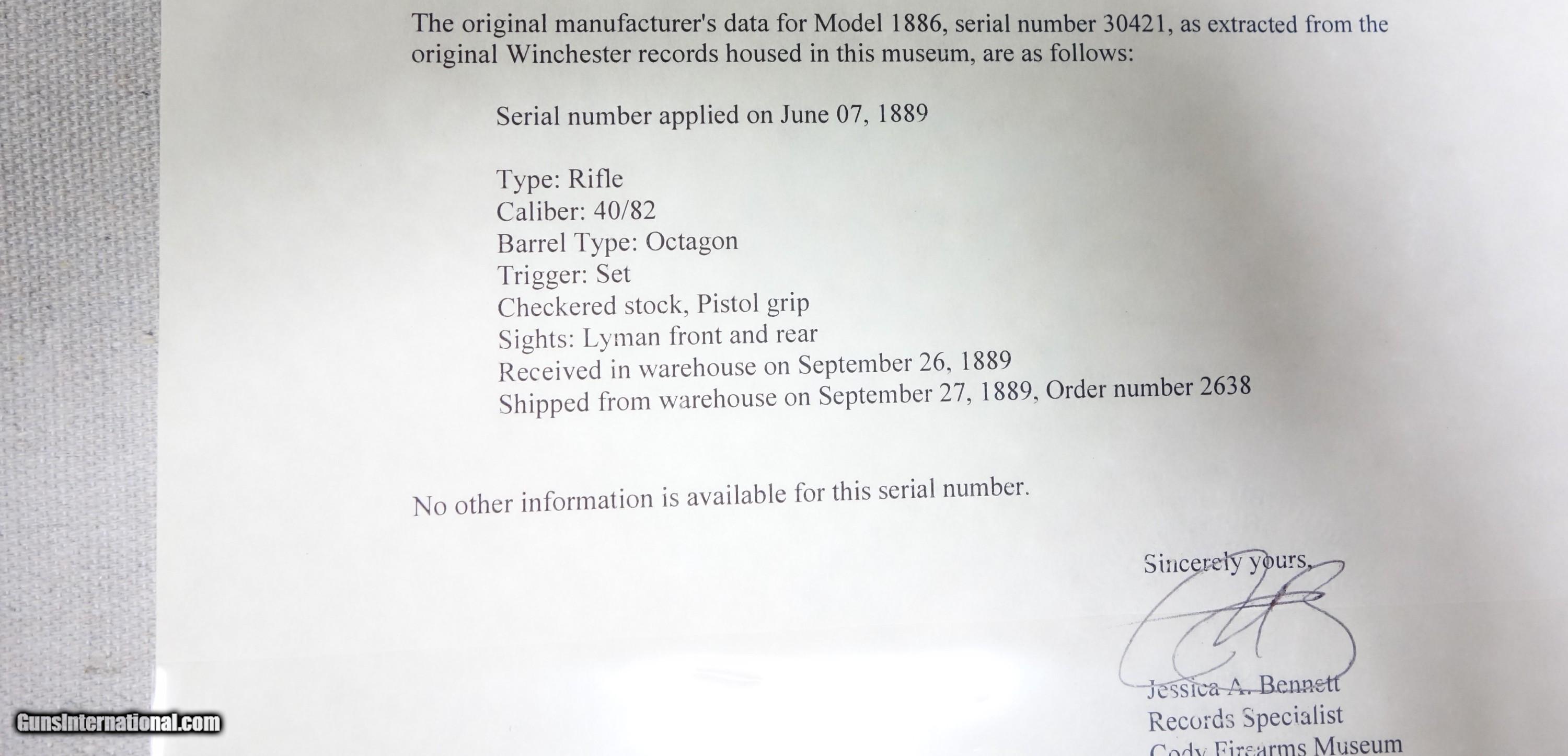 Description: ***SALE PENDING*** Excellent, collector grade Winchester 1886 Deluxe Rifle in 40-82 caliber. S/N 30421 made in 1889 (antique). 26" Octagon Barrel with full length magazine tube. VG-Exc original bluing rated at 90-95%. Some vibrant case colors remain on much of the receiver, hammer and forend cap, showing less pronounced on the lever and mostly faded on bottom surfaces and the crescent style buttplate. Beautiful deluxe wood set with very nice color and pronounced graining, original lacquer, and clean checkering panels. The inner factory stamped deluxe assembly marks are present, correct and matching. The wood shows some typical light handling marks, but has no significant mars or distractions, nor any cracks. This rifle features a factory set trigger. Sights consist of a bead front, Winchester sporting rear, and a Lyman tang sight. The mechanical functions are all excellent and crisp including the set trigger, which works perfectly. The bore is excellent throughout; bright and shiny with just a trace of light patchy frost midway. Comes with a Cody Museum letter. Please add $100 for expedited and fully insured shipping from Alaska in a custom cut foam lined box. SOLD Antique: Yes |