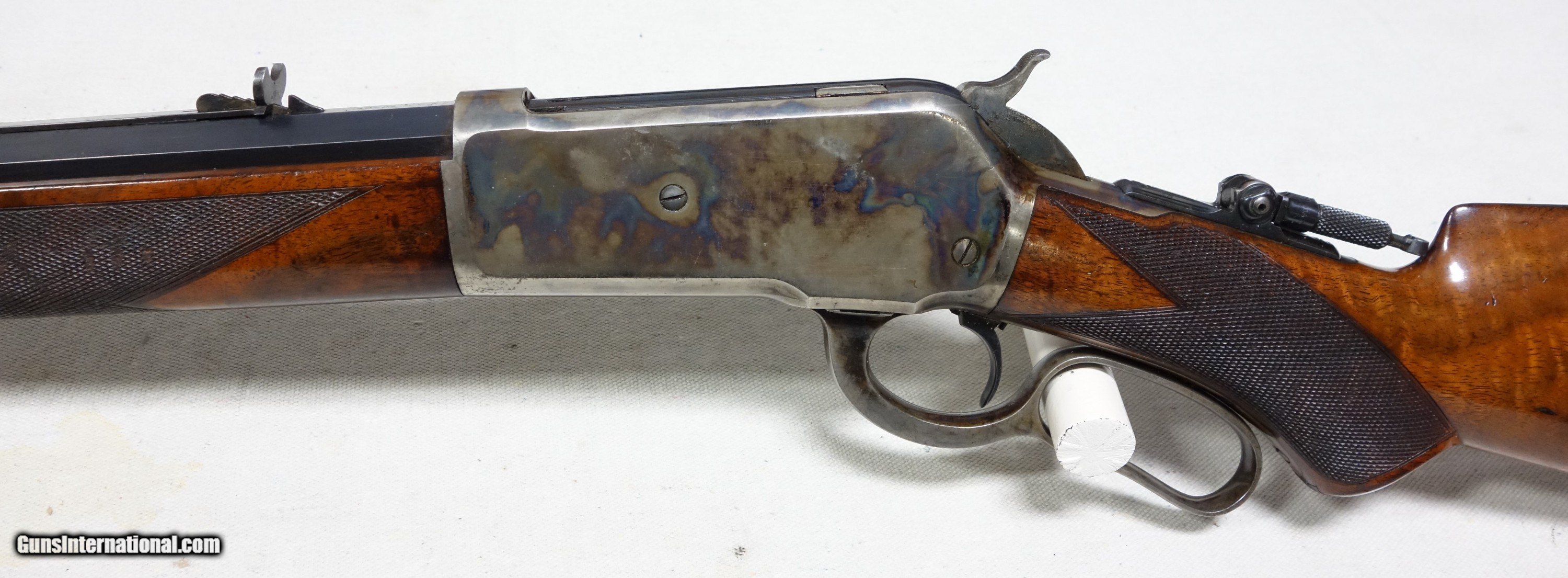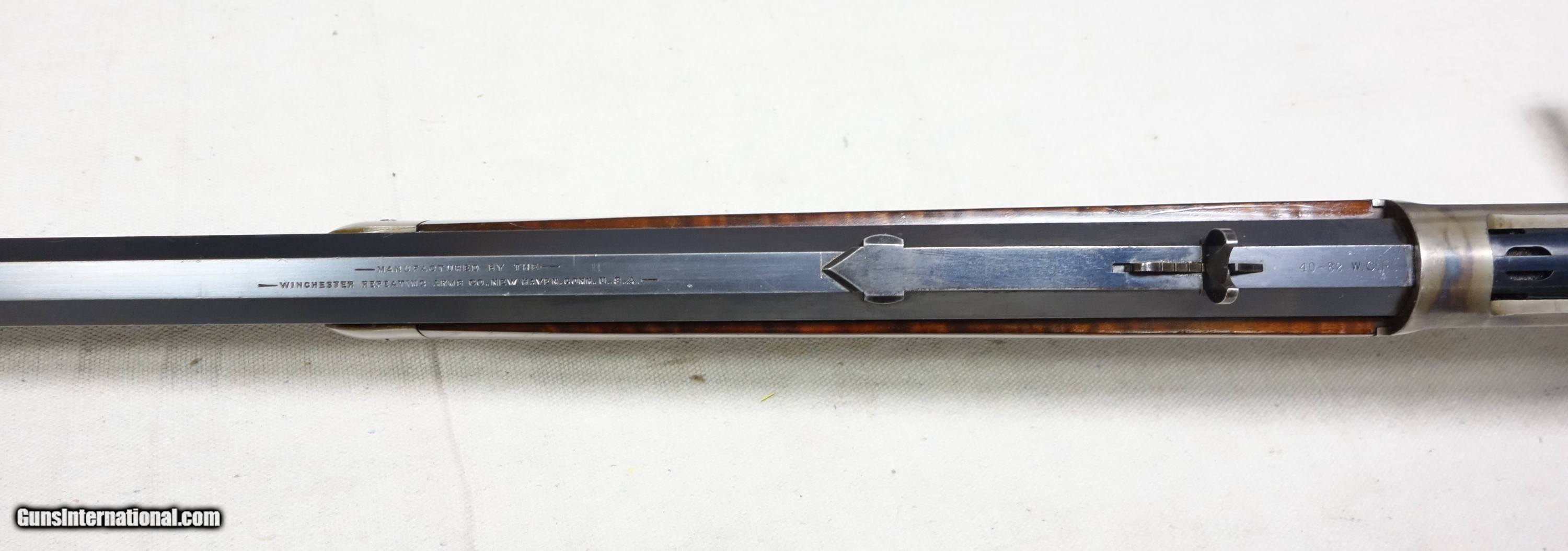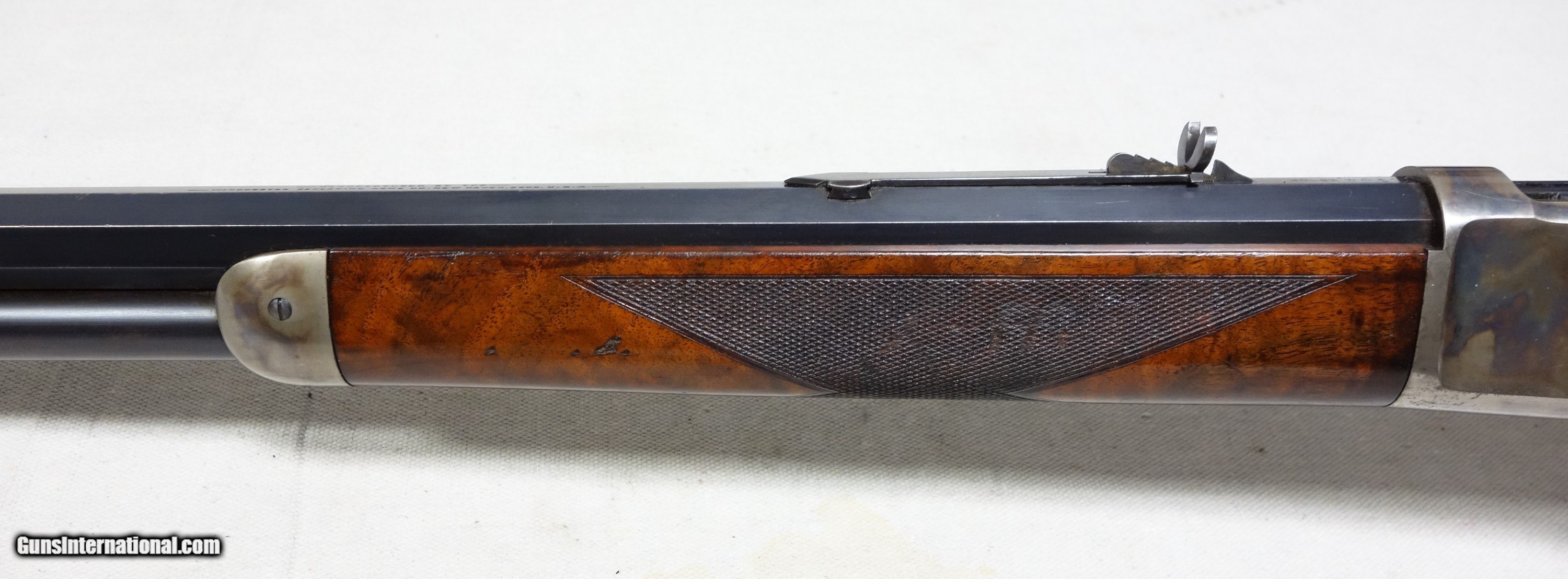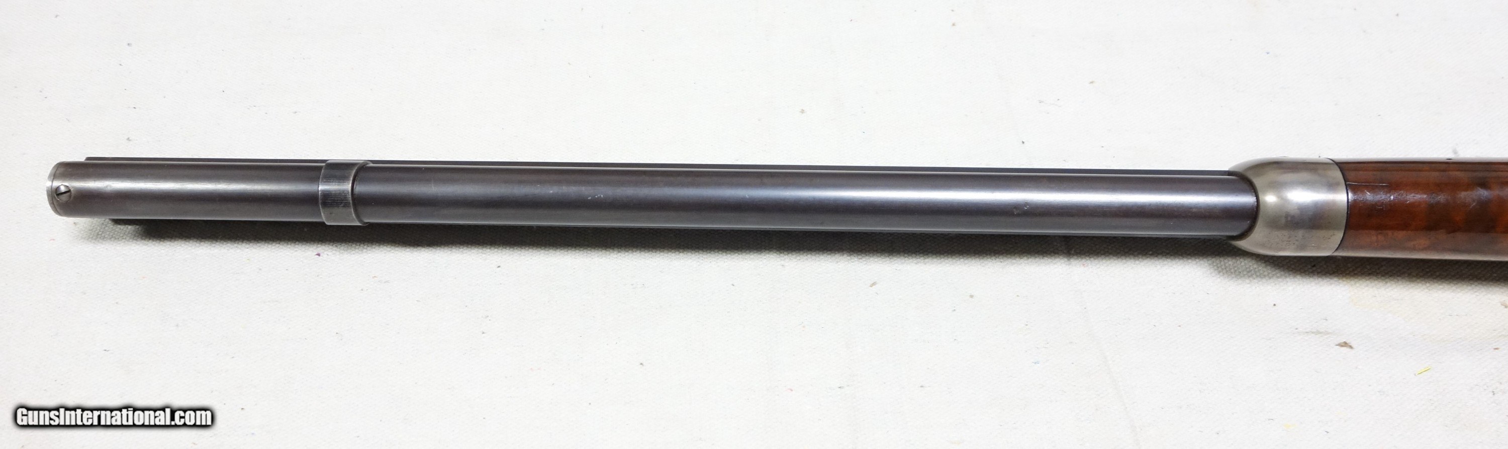 Description: ***SALE PENDING*** Excellent, collector grade Winchester 1886 Deluxe Rifle in 40-82 caliber. S/N 30421 made in 1889 (antique). 26" Octagon Barrel with full length magazine tube. VG-Exc original bluing rated at 90-95%. Some vibrant case colors remain on much of the receiver, hammer and forend cap, showing less pronounced on the lever and mostly faded on bottom surfaces and the crescent style buttplate. Beautiful deluxe wood set with very nice color and pronounced graining, original lacquer, and clean checkering panels. The inner factory stamped deluxe assembly marks are present, correct and matching. The wood shows some typical light handling marks, but has no significant mars or distractions, nor any cracks. This rifle features a factory set trigger. Sights consist of a bead front, Winchester sporting rear, and a Lyman tang sight. The mechanical functions are all excellent and crisp including the set trigger, which works perfectly. The bore is excellent throughout; bright and shiny with just a trace of light patchy frost midway. Comes with a Cody Museum letter. Please add $100 for expedited and fully insured shipping from Alaska in a custom cut foam lined box. SOLD Antique: Yes |
