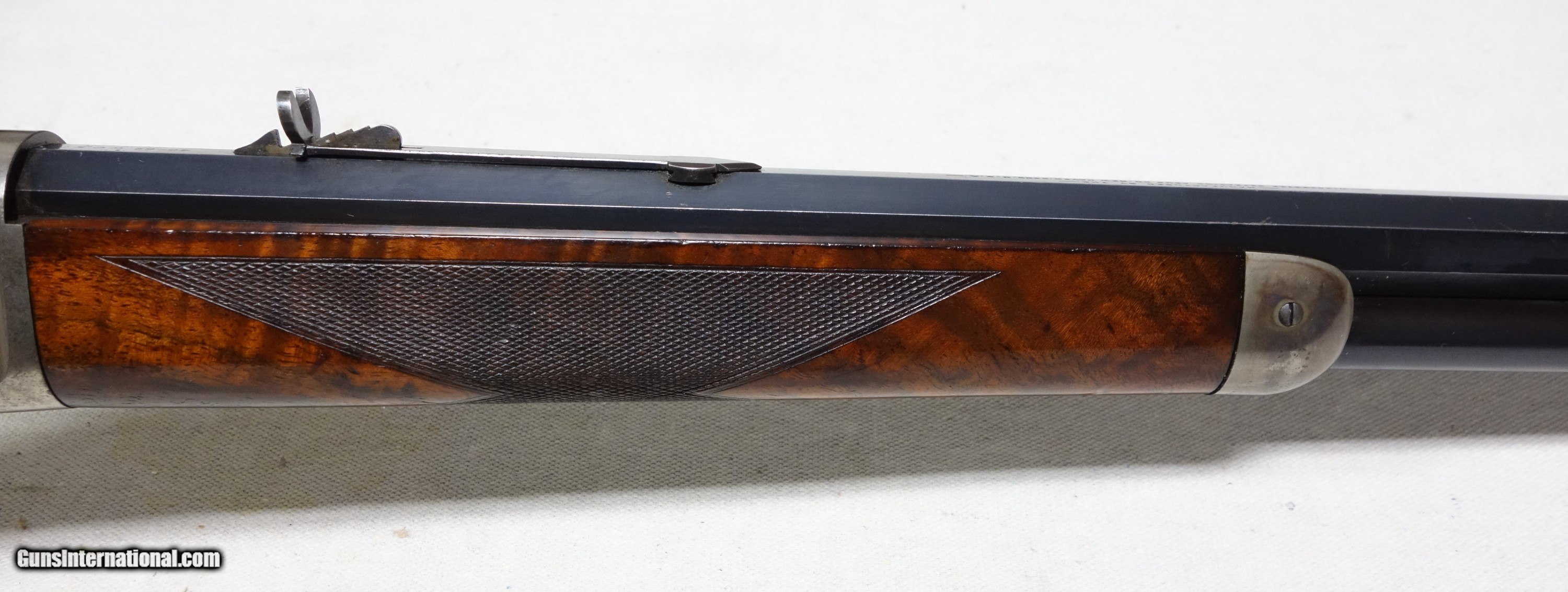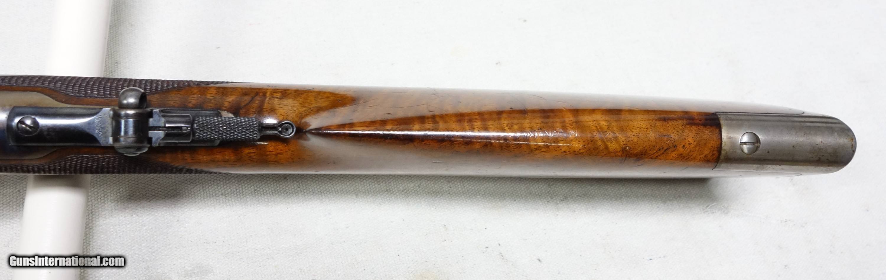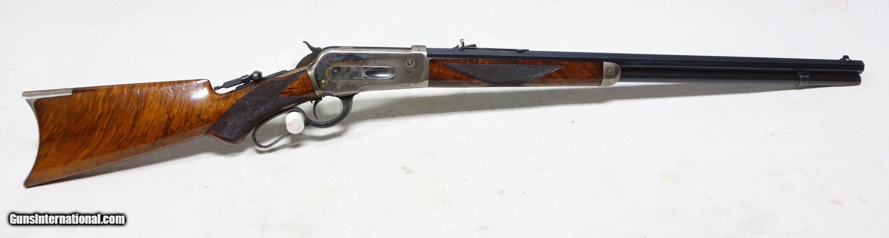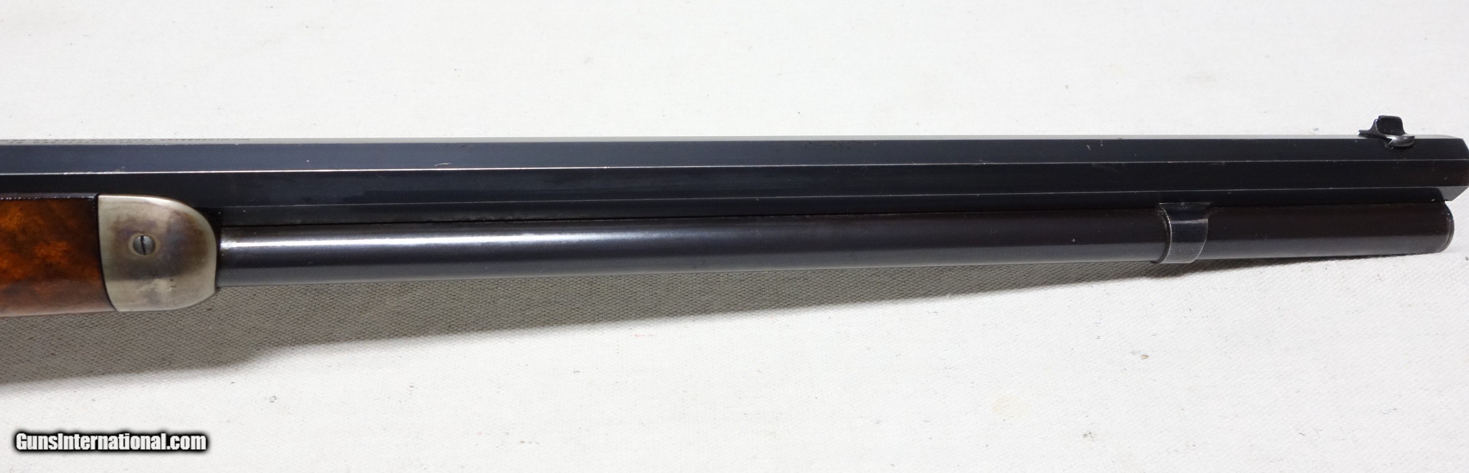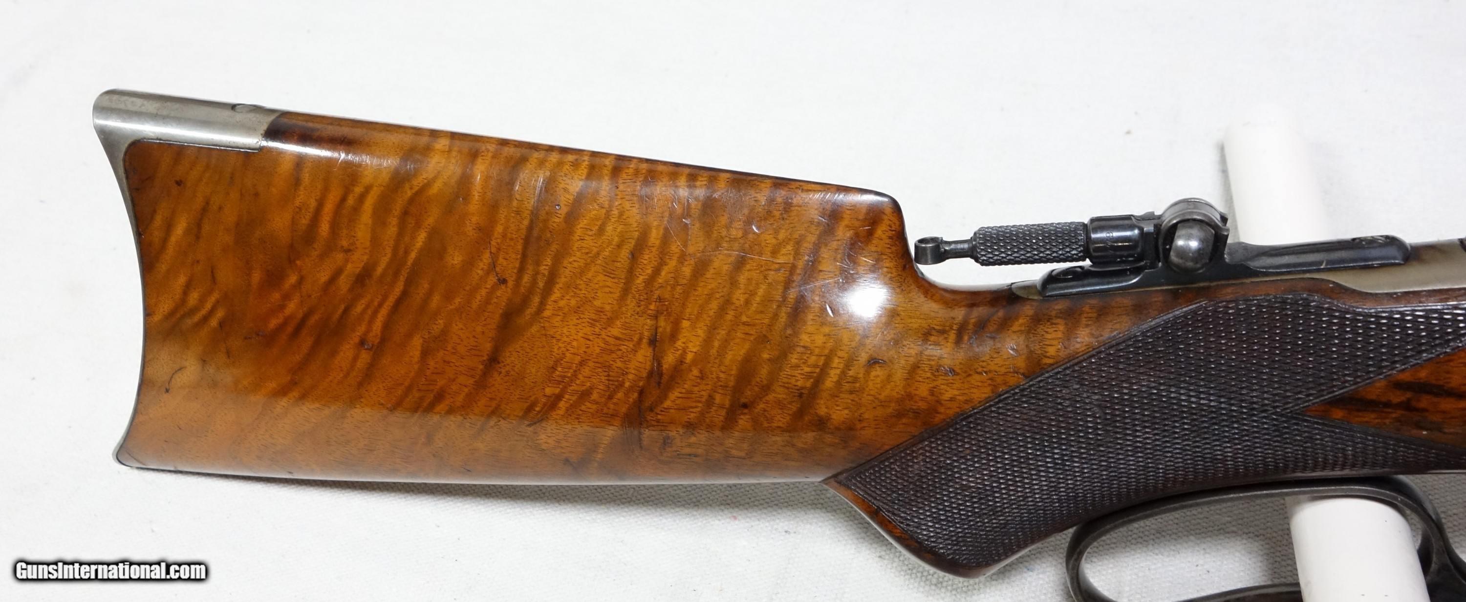 Description: ***SALE PENDING*** Excellent, collector grade Winchester 1886 Deluxe Rifle in 40-82 caliber. S/N 30421 made in 1889 (antique). 26" Octagon Barrel with full length magazine tube. VG-Exc original bluing rated at 90-95%. Some vibrant case colors remain on much of the receiver, hammer and forend cap, showing less pronounced on the lever and mostly faded on bottom surfaces and the crescent style buttplate. Beautiful deluxe wood set with very nice color and pronounced graining, original lacquer, and clean checkering panels. The inner factory stamped deluxe assembly marks are present, correct and matching. The wood shows some typical light handling marks, but has no significant mars or distractions, nor any cracks. This rifle features a factory set trigger. Sights consist of a bead front, Winchester sporting rear, and a Lyman tang sight. The mechanical functions are all excellent and crisp including the set trigger, which works perfectly. The bore is excellent throughout; bright and shiny with just a trace of light patchy frost midway. Comes with a Cody Museum letter. Please add $100 for expedited and fully insured shipping from Alaska in a custom cut foam lined box. SOLD Antique: Yes |