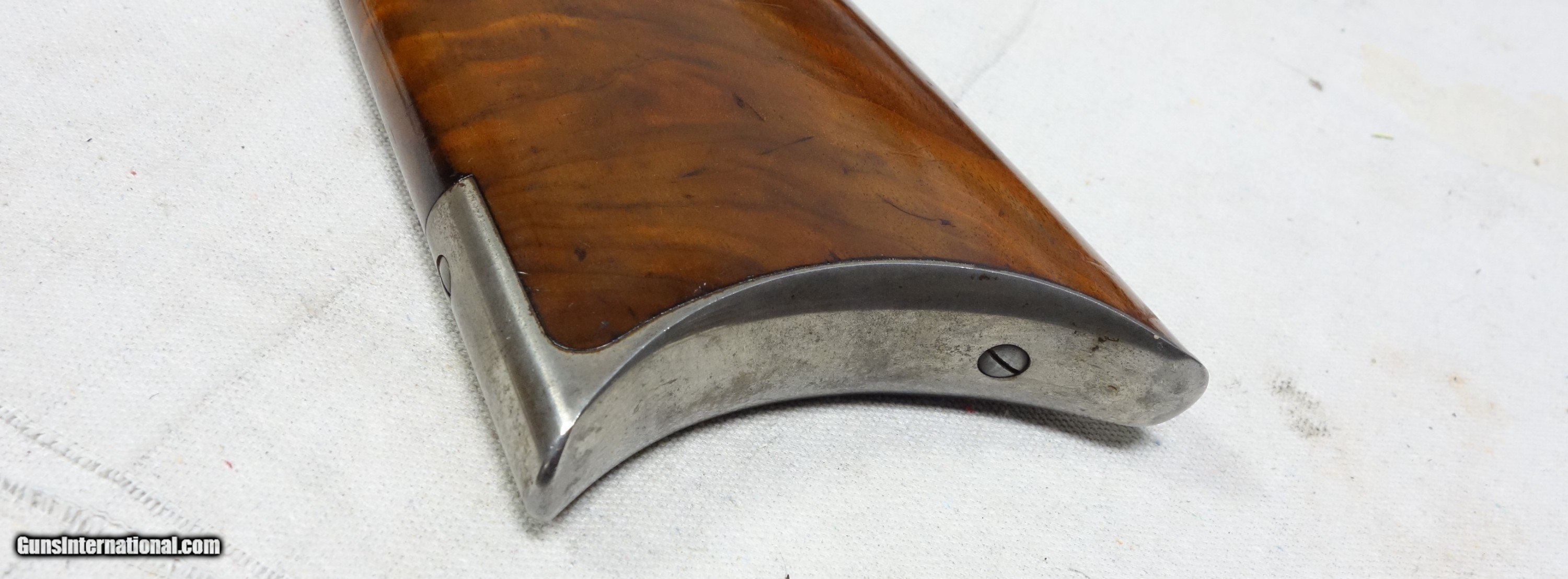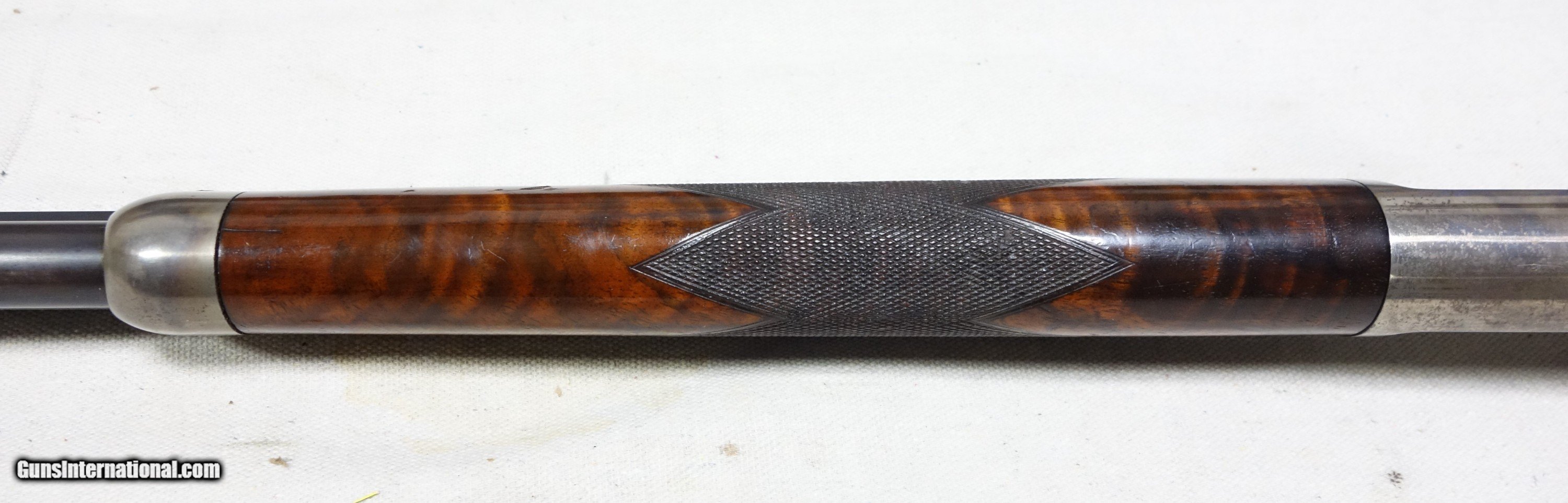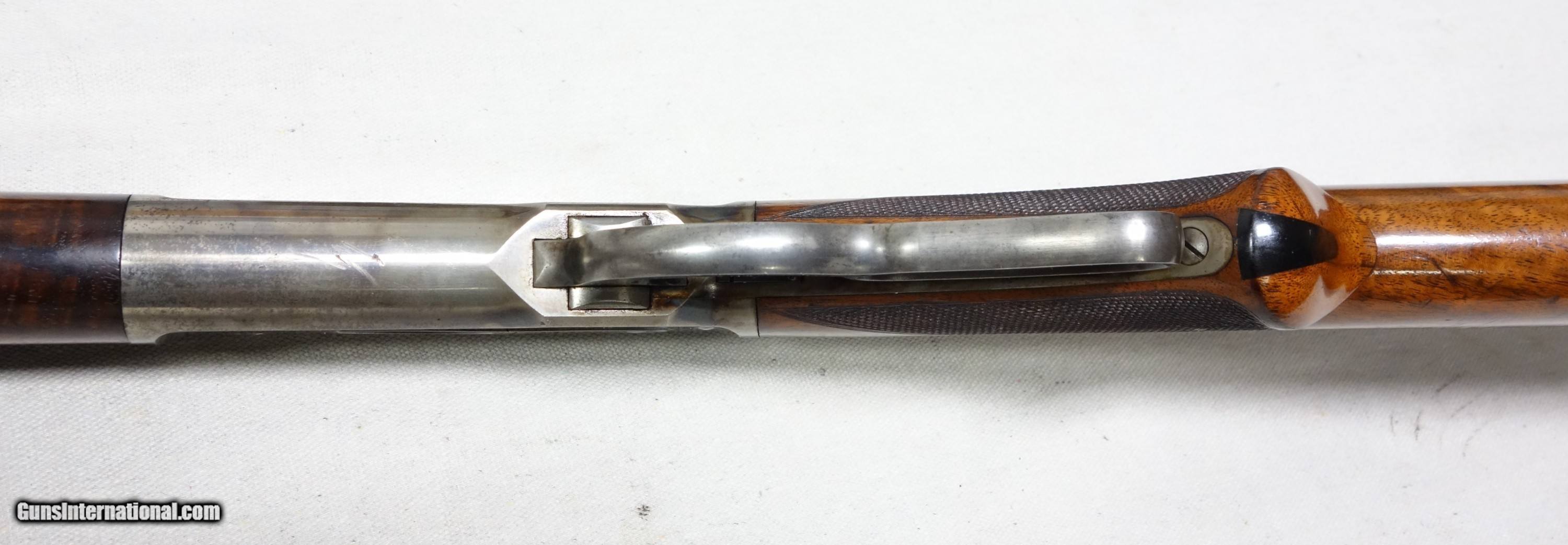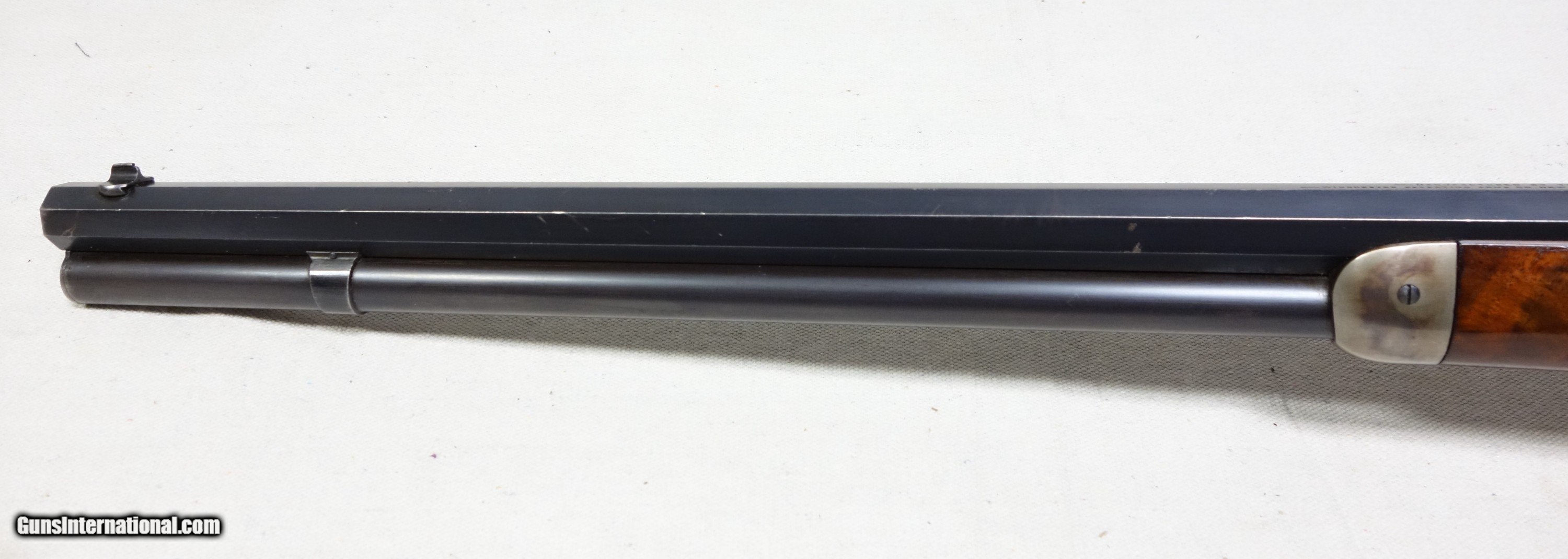 Description: ***SALE PENDING*** Excellent, collector grade Winchester 1886 Deluxe Rifle in 40-82 caliber. S/N 30421 made in 1889 (antique). 26" Octagon Barrel with full length magazine tube. VG-Exc original bluing rated at 90-95%. Some vibrant case colors remain on much of the receiver, hammer and forend cap, showing less pronounced on the lever and mostly faded on bottom surfaces and the crescent style buttplate. Beautiful deluxe wood set with very nice color and pronounced graining, original lacquer, and clean checkering panels. The inner factory stamped deluxe assembly marks are present, correct and matching. The wood shows some typical light handling marks, but has no significant mars or distractions, nor any cracks. This rifle features a factory set trigger. Sights consist of a bead front, Winchester sporting rear, and a Lyman tang sight. The mechanical functions are all excellent and crisp including the set trigger, which works perfectly. The bore is excellent throughout; bright and shiny with just a trace of light patchy frost midway. Comes with a Cody Museum letter. Please add $100 for expedited and fully insured shipping from Alaska in a custom cut foam lined box. SOLD Antique: Yes |