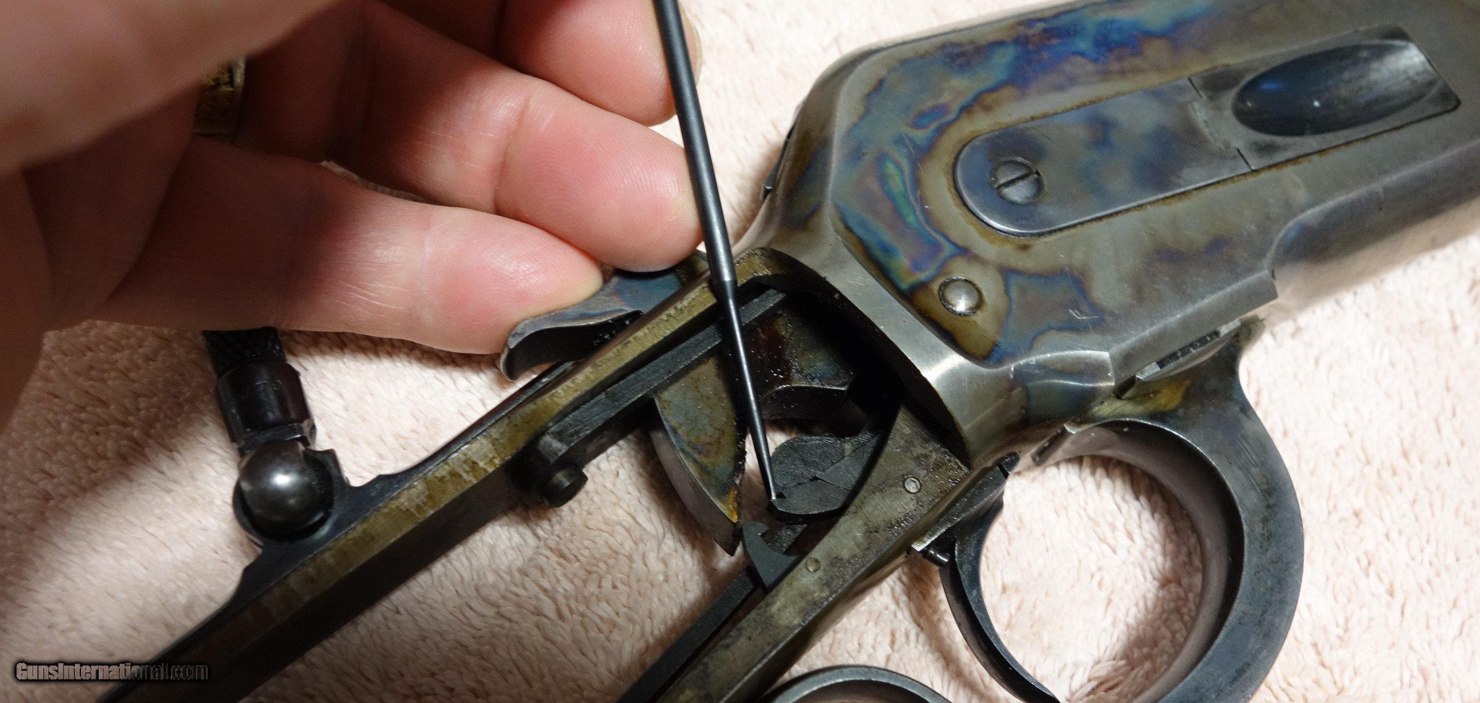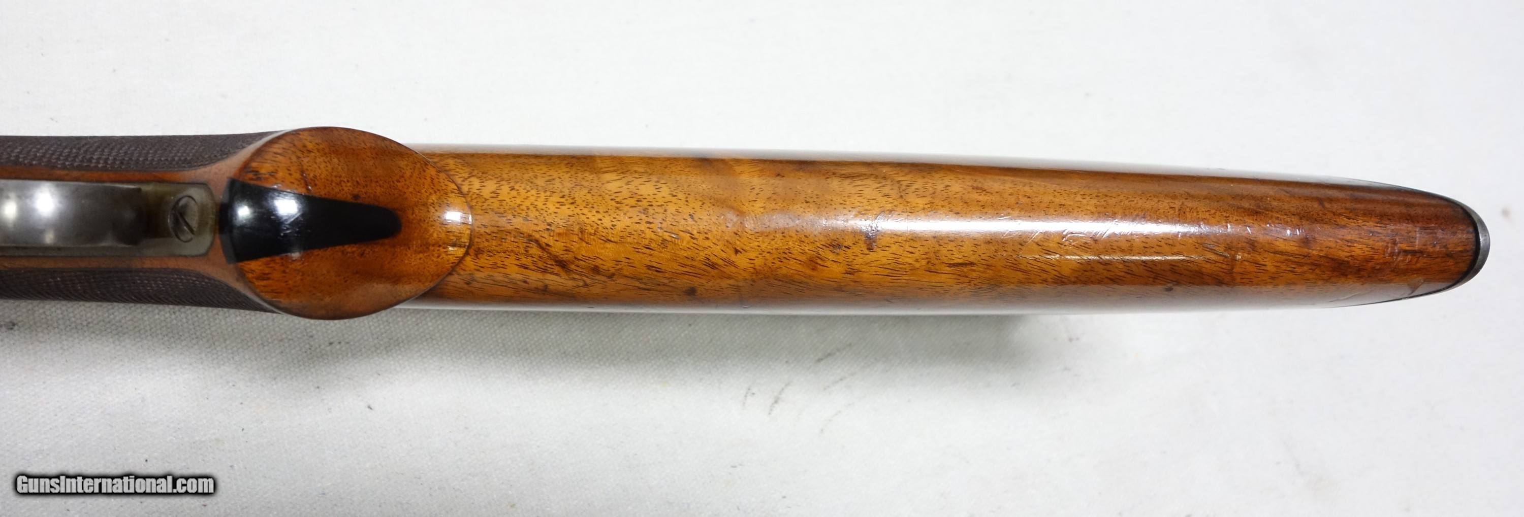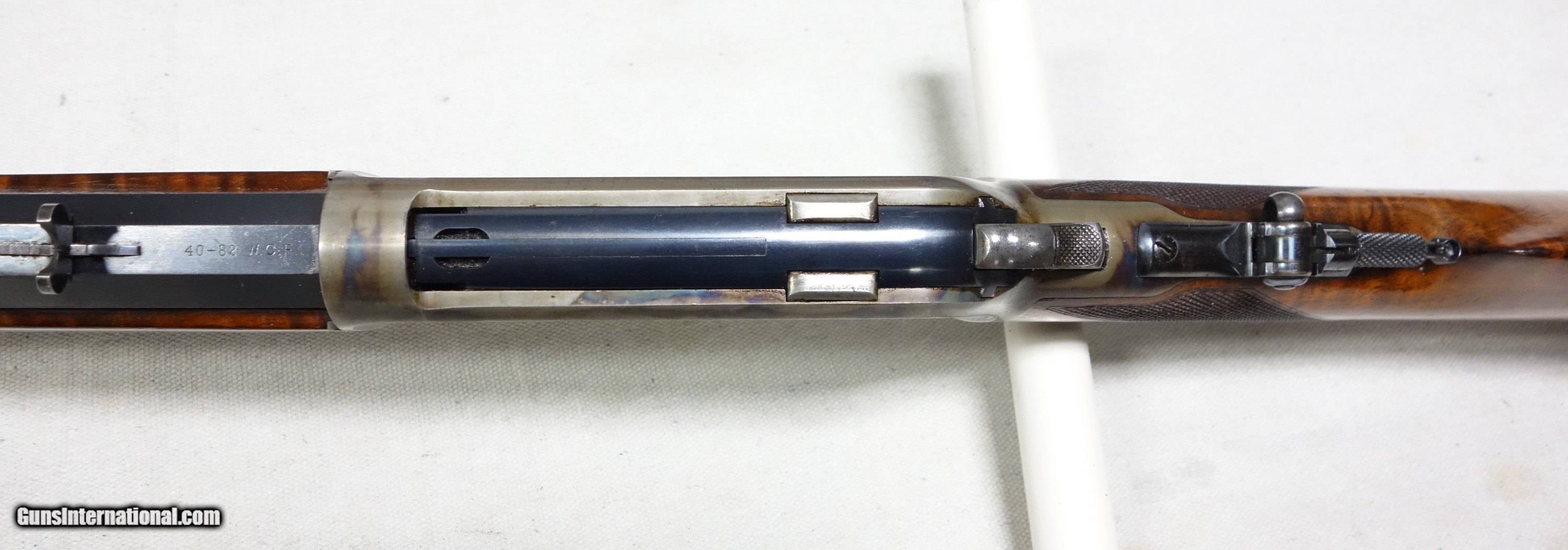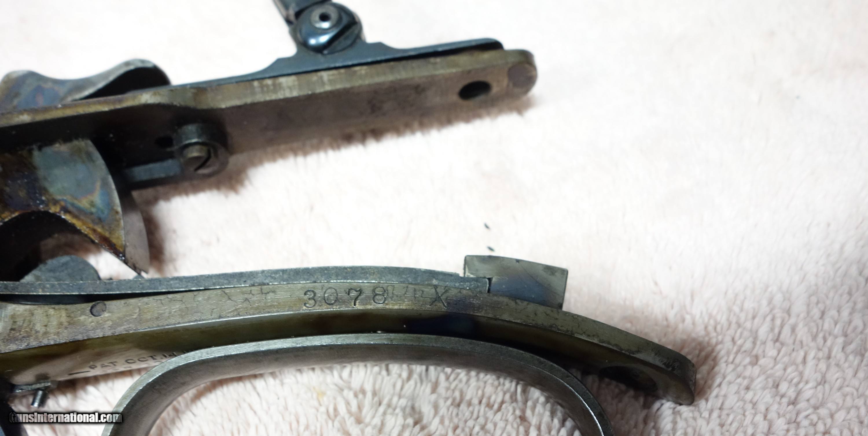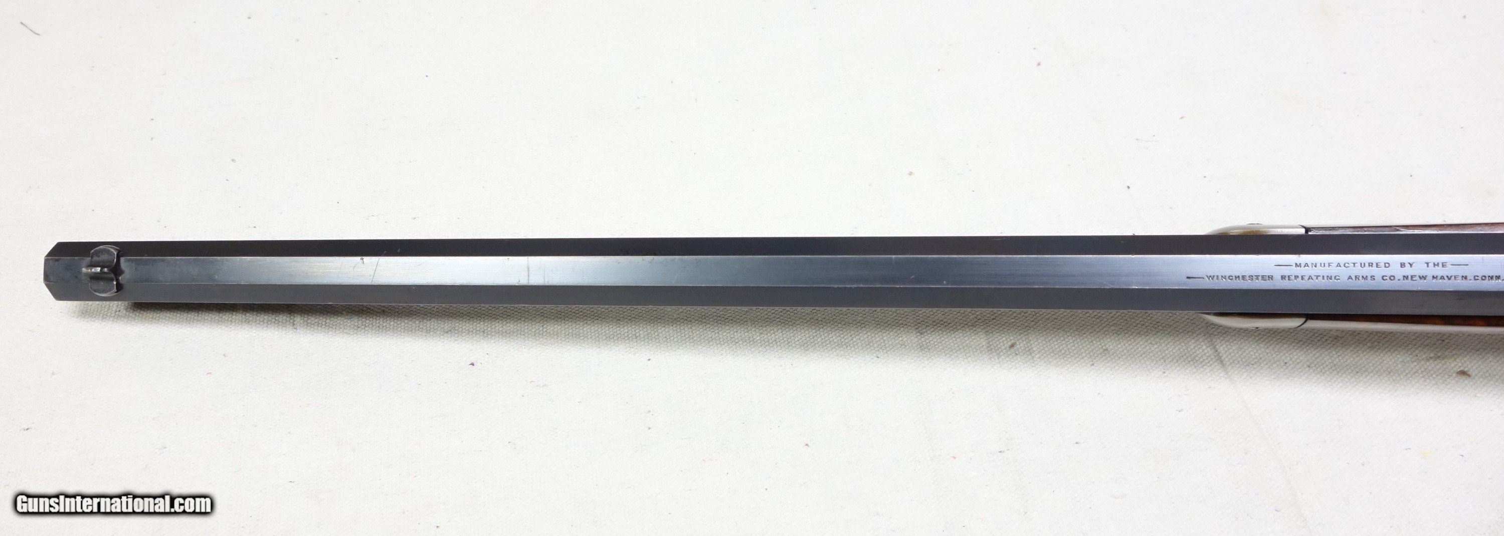 Description: ***SALE PENDING*** Excellent, collector grade Winchester 1886 Deluxe Rifle in 40-82 caliber. S/N 30421 made in 1889 (antique). 26" Octagon Barrel with full length magazine tube. VG-Exc original bluing rated at 90-95%. Some vibrant case colors remain on much of the receiver, hammer and forend cap, showing less pronounced on the lever and mostly faded on bottom surfaces and the crescent style buttplate. Beautiful deluxe wood set with very nice color and pronounced graining, original lacquer, and clean checkering panels. The inner factory stamped deluxe assembly marks are present, correct and matching. The wood shows some typical light handling marks, but has no significant mars or distractions, nor any cracks. This rifle features a factory set trigger. Sights consist of a bead front, Winchester sporting rear, and a Lyman tang sight. The mechanical functions are all excellent and crisp including the set trigger, which works perfectly. The bore is excellent throughout; bright and shiny with just a trace of light patchy frost midway. Comes with a Cody Museum letter. Please add $100 for expedited and fully insured shipping from Alaska in a custom cut foam lined box. SOLD Antique: Yes |