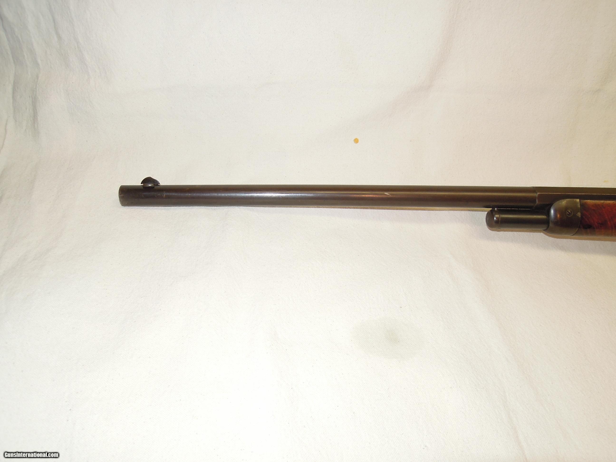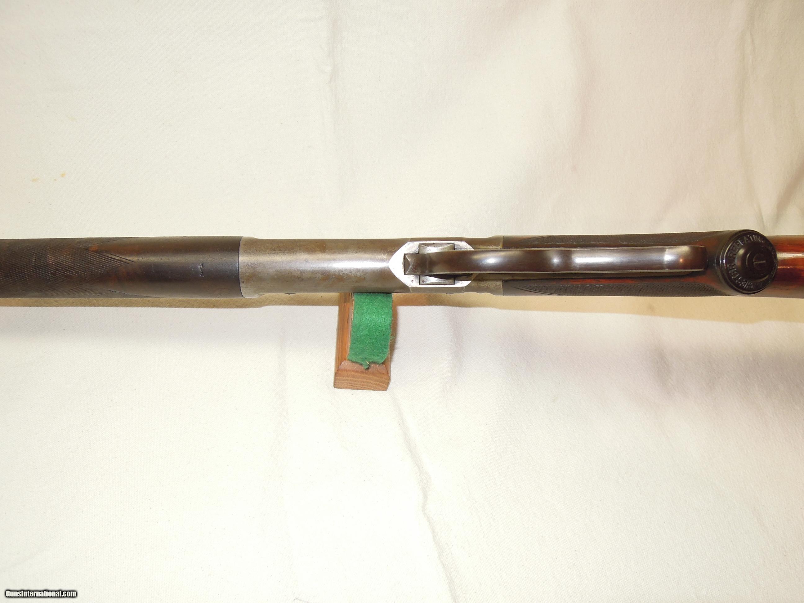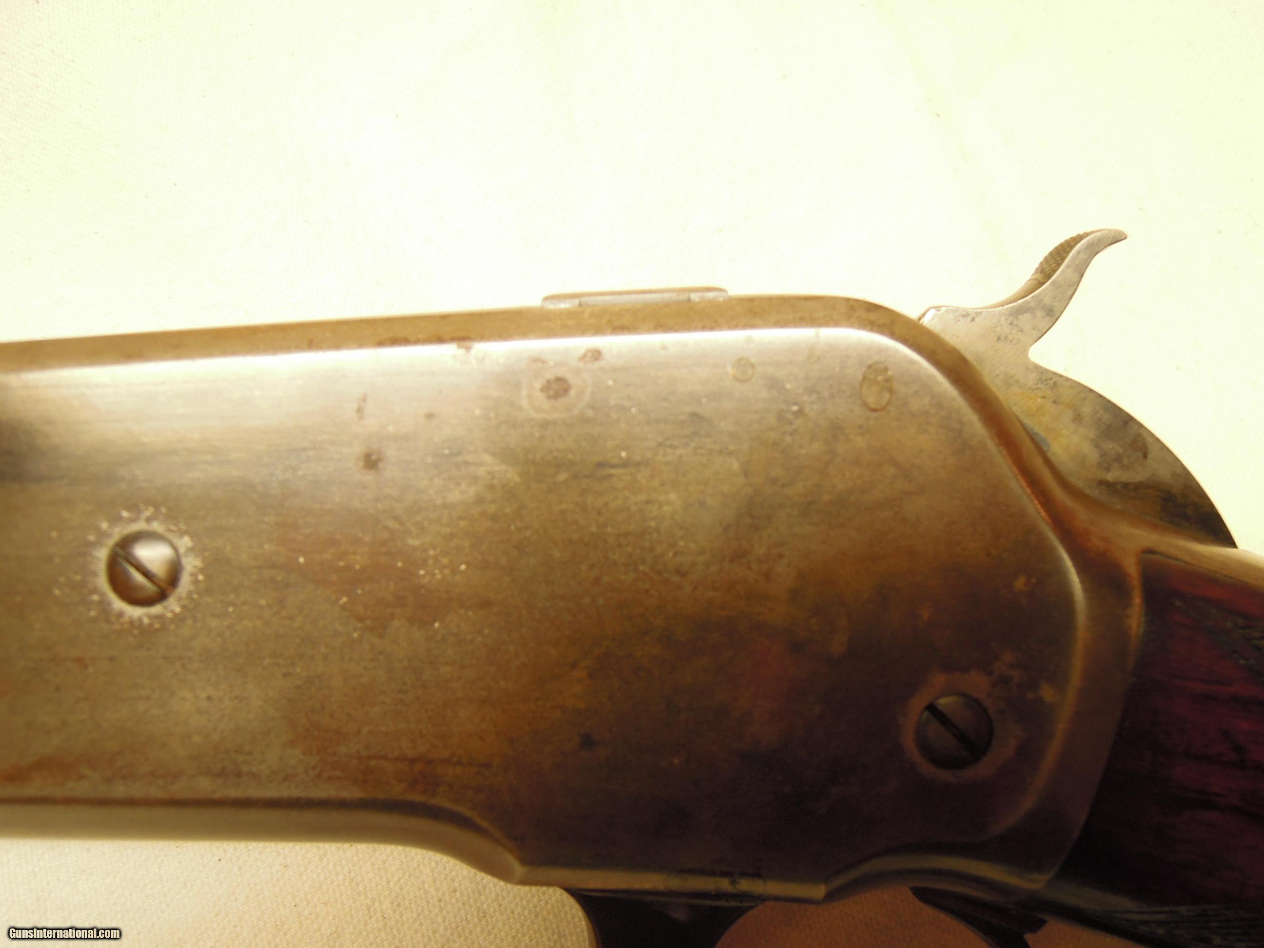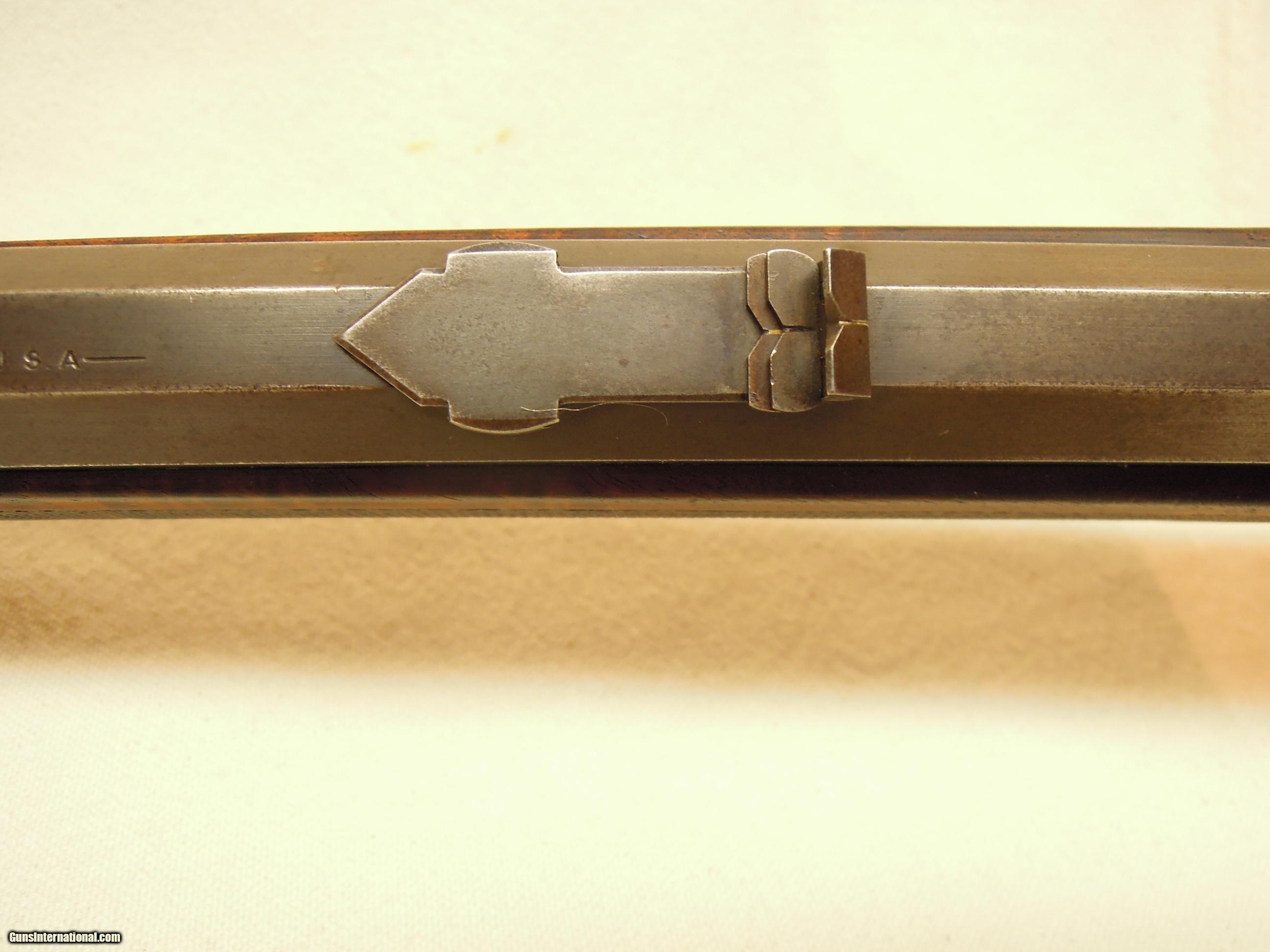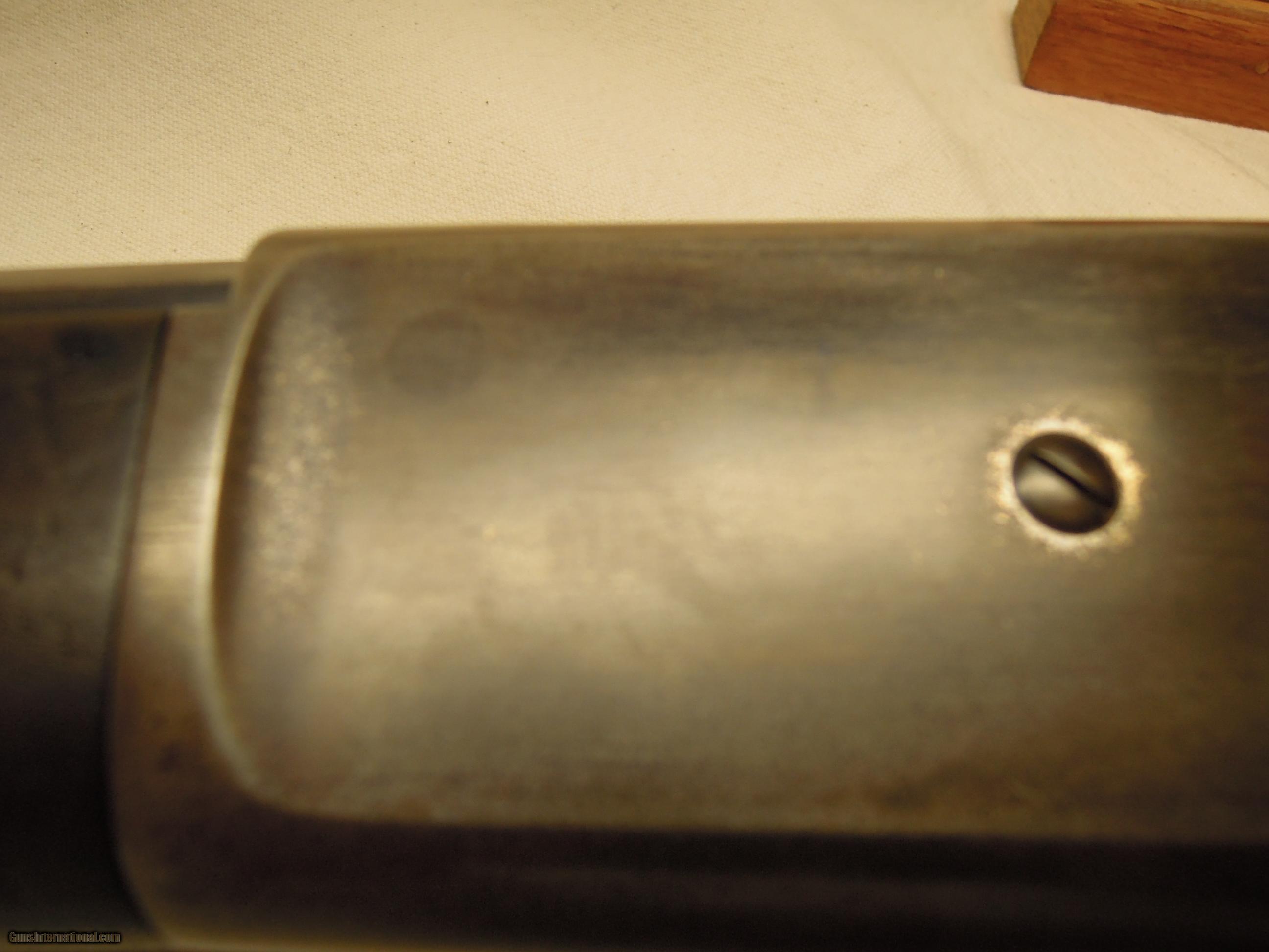 Description: Winchester Model 1886 Deluxe Rifle - Cal. .45-70 - 26" barrel - SN 106639 (1895) - Special Order 1/2 octagon barrel, Lyman ivory bead LWT style front sight, 3-leaf "express" rear sight, 1/2 magazine - 4-shot , XXX wood, checkered pistol grip stock, steel shotgun buttplate - Cody letter.. Bore shows some mild roughness but is bright with VG+ or better rifling - action is excellent with good lock-up, extraction, and ejection. Metal is excellent overall with no rust, pitting, or corrosion. Left side of the receiver was drilled at one time, most likely for a Lyman 21 receiver sight - holes have been expertly filled, smoothed and receiver lightly "toned" so repair is barely visible and not easily noticed - overall, an outstanding professional repair. Barrel retains 85% blue with some thinning - receiver has drifted off to a mottled gray patina with some light spotting. Wood is undamaged with sharp checkering, retains 80% finish and shows moderate wear with only some light surface marks from normal handling. Except for the receiver repair, this early 1886 is all original and in "Fine" or better condition overall in the very desirable .45-70 caliber and with lots of desirable special features that will make an outstanding shooter and collectible at a reasonable price considering condition and the special order options. SOLD Antique: Yes Manufacturer: WINCHESTER Model: 1886 Caliber Info: .45-70 |