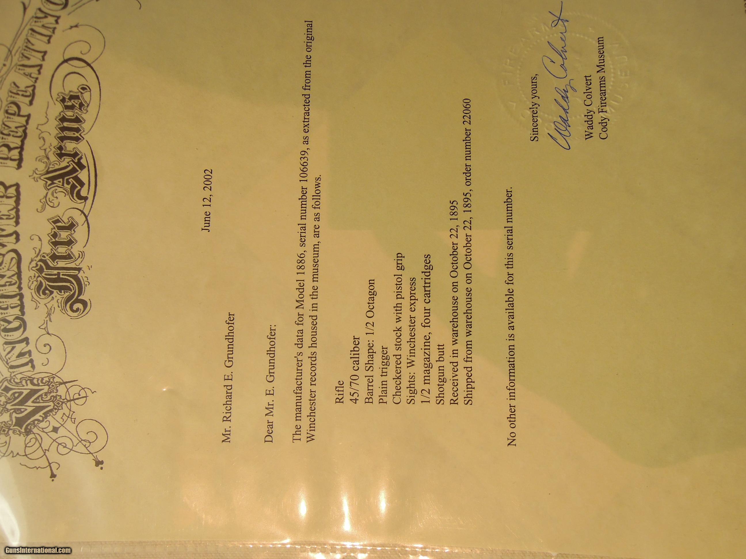 WINCHESTER MODEL 1886 DELUXE RIFLE - CAL. .45-70 - ANTIQUE - LETTER