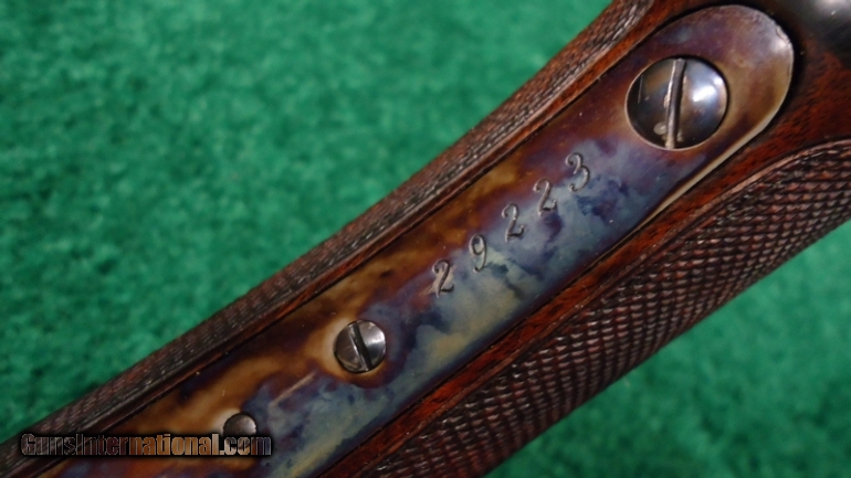 Description: Cal 45-90 with an extremely rare 32" full oct bbl and full length mag tube. Featuring the dual mag tube retaining rings, orig blade front sight, correct folding tang rear sight and orig checkered pistol grip fancy dlx wood. Wood is in excellent cond with rifle style butt and orig sling swivels. This gun letters correctly from the Cody Museum and lists all the features including Rocky Mtn front and Lyman rear sight, sling swivels and 32" oct bbl. Gun is in fantastic cond with a mint bore. It has a professional refinish done quite some time ago and retains 98%+ vivid case colors on the receiver, lever, forend tip and butt plate. Virtually all the bright glossy blue remains on bbl and mag tube. It would be hard to improve upon this truly beautiful gun! Very few 32" were ever made and even less made in a full deluxe like this one. Guaranteed correct as stated and complete with a Factory Letter. Consignment Leroy Merz Antique Firearms specializes in antique and vintage Winchesters and other fine American firearms. Since 1965 Mr. Merz has taken part in the world of firearms and has been a contributor to many well known reference books. Just recently we mailed the 124th edition of our privately-published catalog. We have hundreds of additional guns in every price range at our home online. Search for Merz Antiques in google. SOLD Antique: Yes |