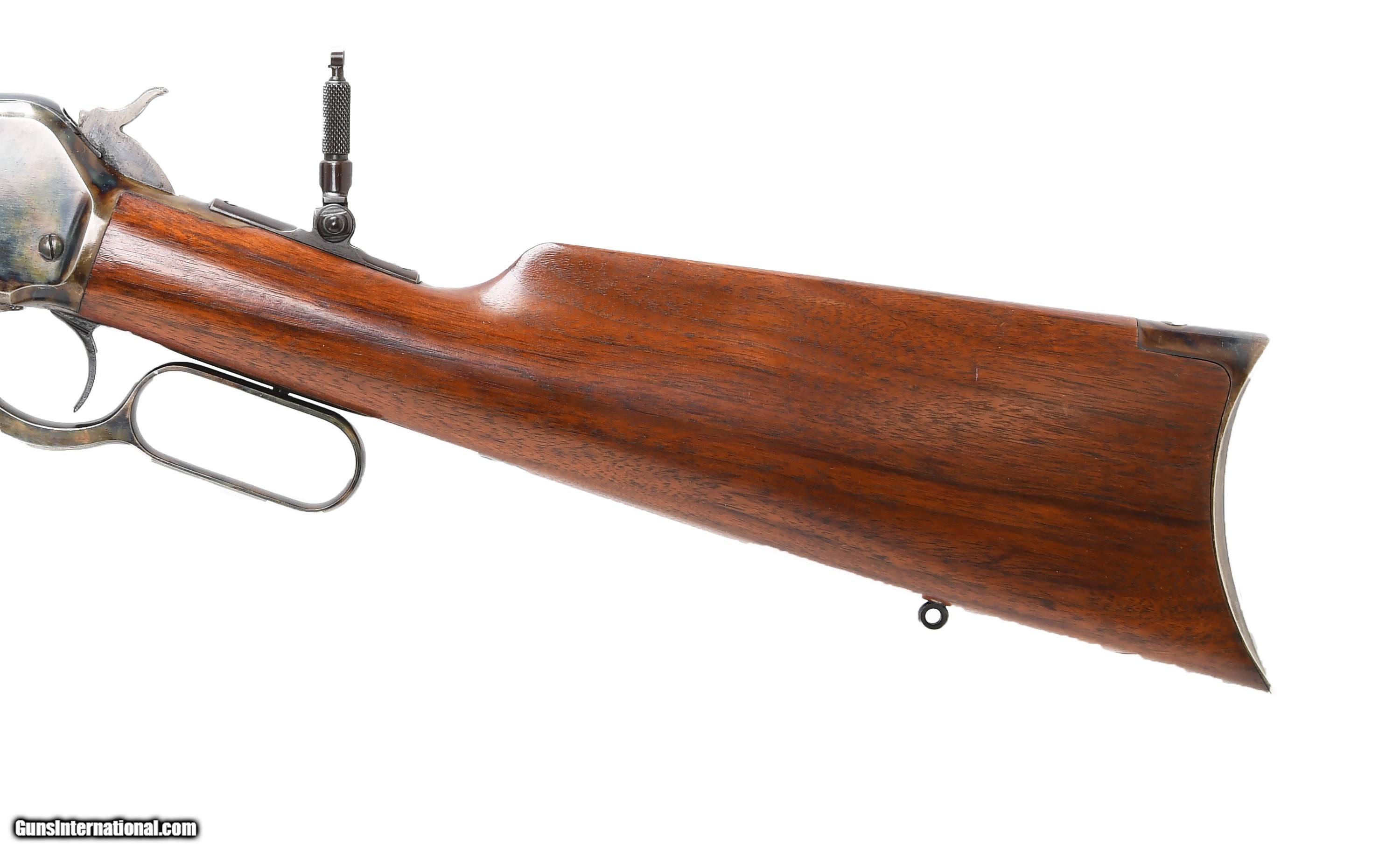 Description: As good as they get!! Winchester model 1886 rifle, chambered in .45-70 made in 1895 (see attached factory letter) This one of those let the pictures speak for themselves to describe this museum quality, completely original, '86. 24" octagon barrel, crescent steel buttplate, mirror perfect bore, 97% orginal rust blued barrel, very fine wood with the exception of the "scratch" on the right side above the lever and under the tang sight AND the spectacular original case colors. SN: 103081 SOLD Antique: Yes |