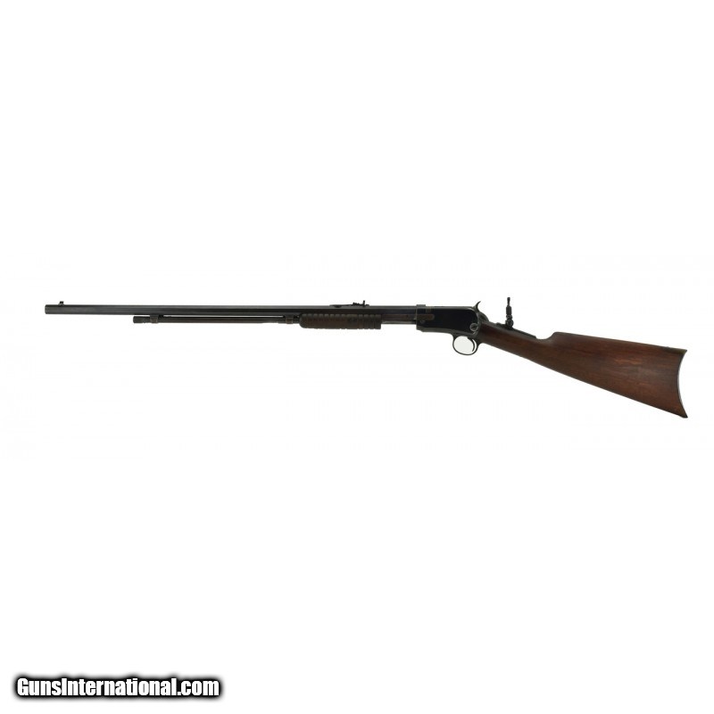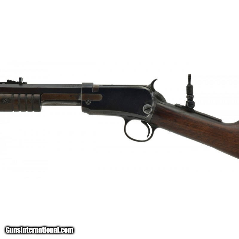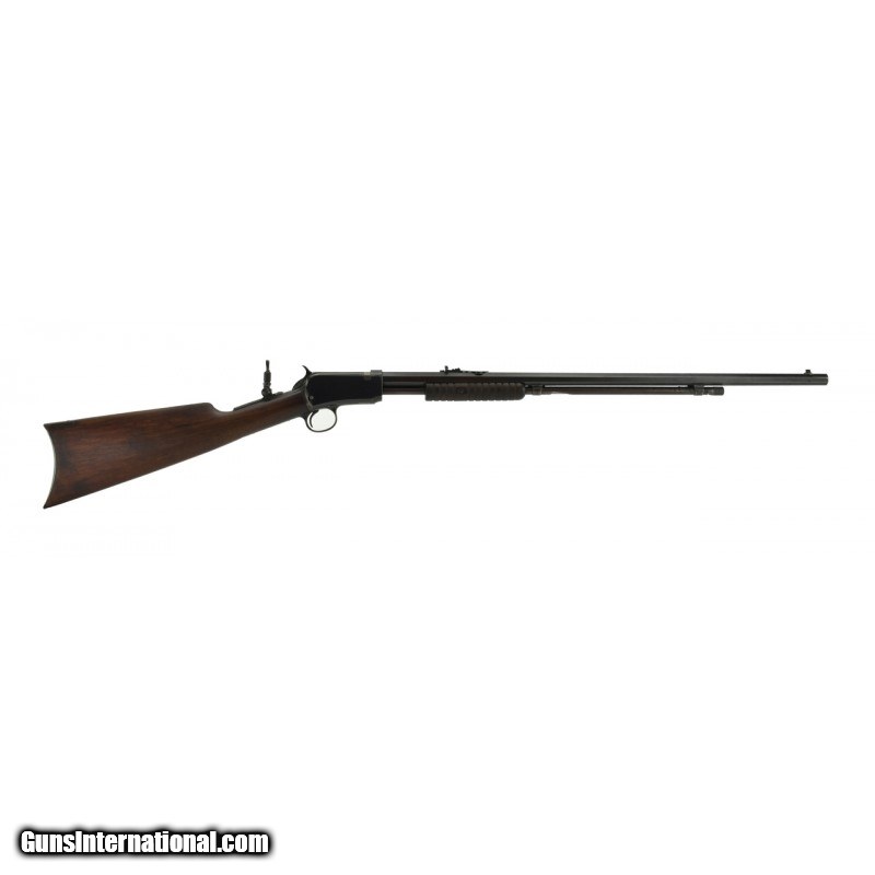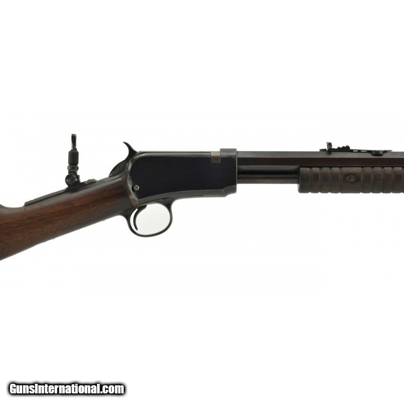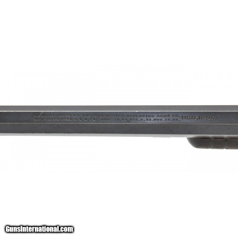 Description: "Winchester 1890 .22 S caliber rifle. Pump action rifle manufactured approximately 1908. Chambered in 22 Short. Bore has strong rifling with an area of pitting. Approximately 6" from the muzzle. Approximately 80% original blue with brown patina. Wood is good with minor nicks and dings no cracks. Good overall condition tangent rear sight. Barrel rear sight is replaced. Gun is good plus to very good overall. This is really decent condition for an 1890 as most were well used! SOLD Curio/Relic: Yes |