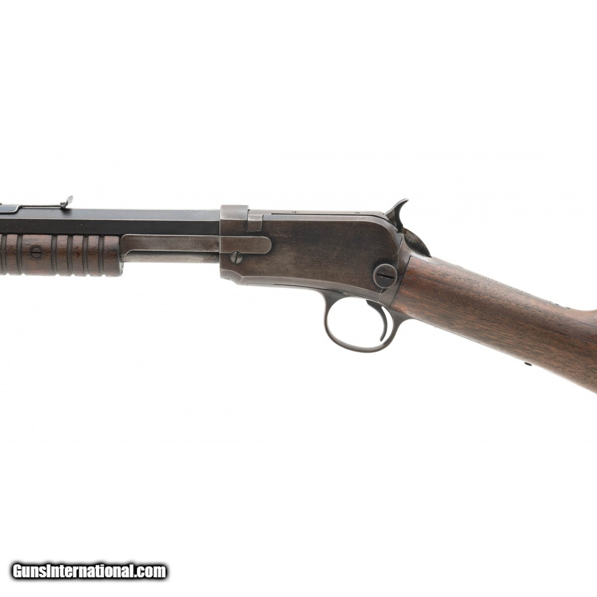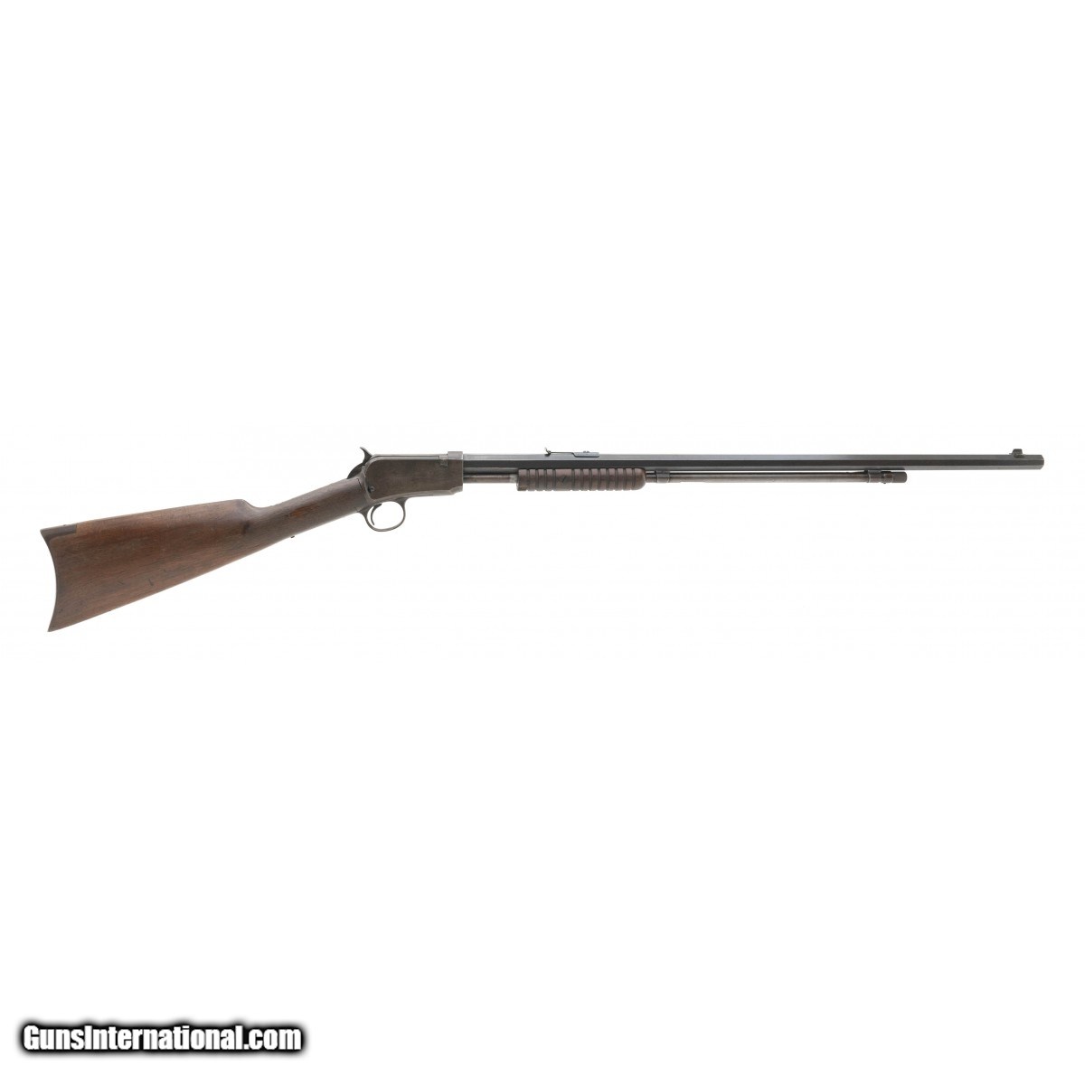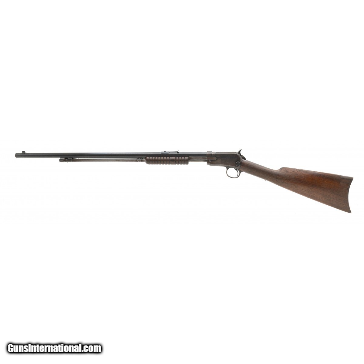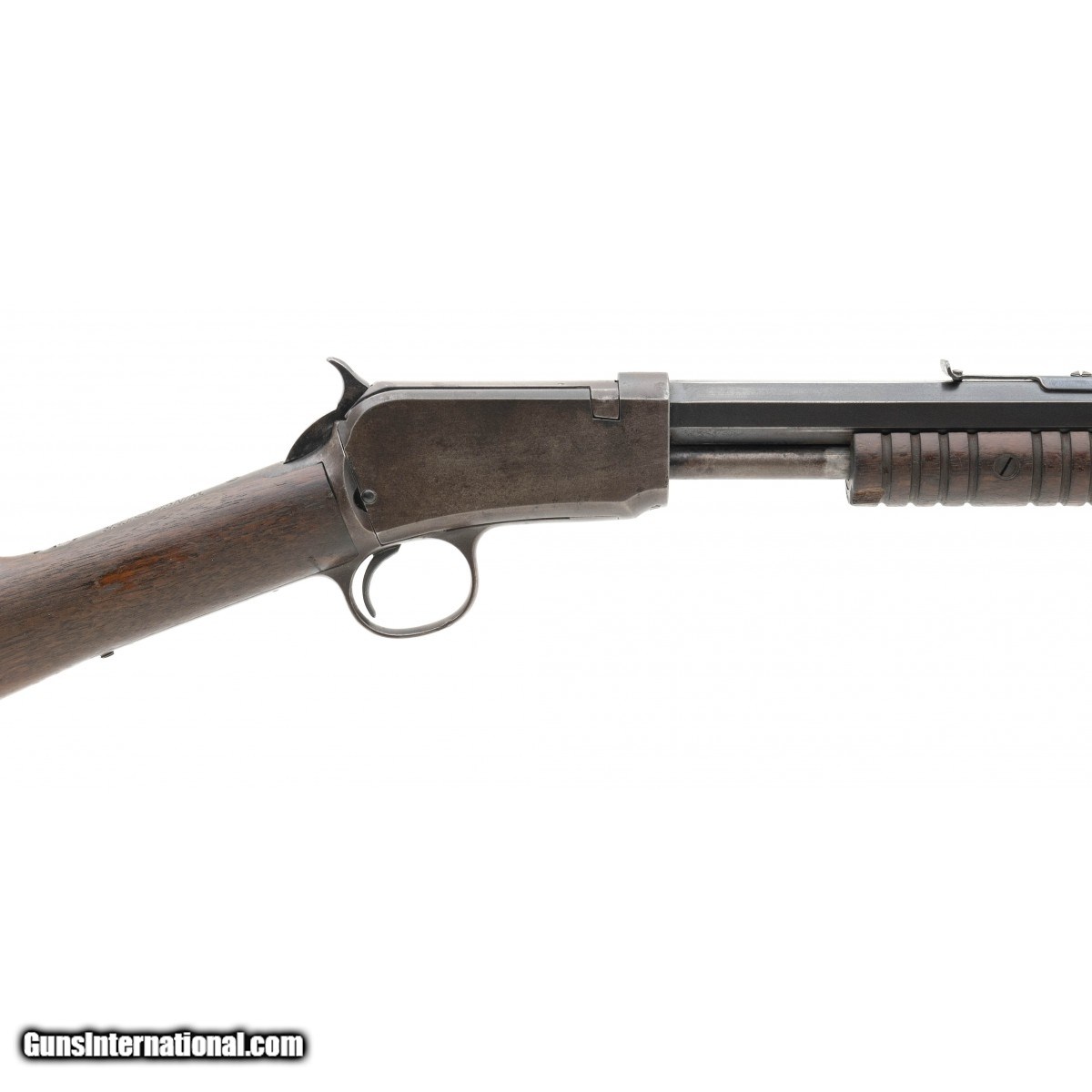 SN: 744386. Late model pump action rifle made in the 1930's. The bore is excellent. The barrel has most of the blue/brown finish, the receiver has mostly a brown patina. The wood is very good, with a chip out of the forend.
