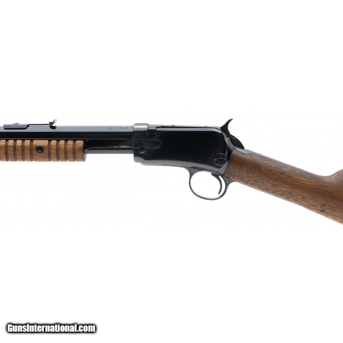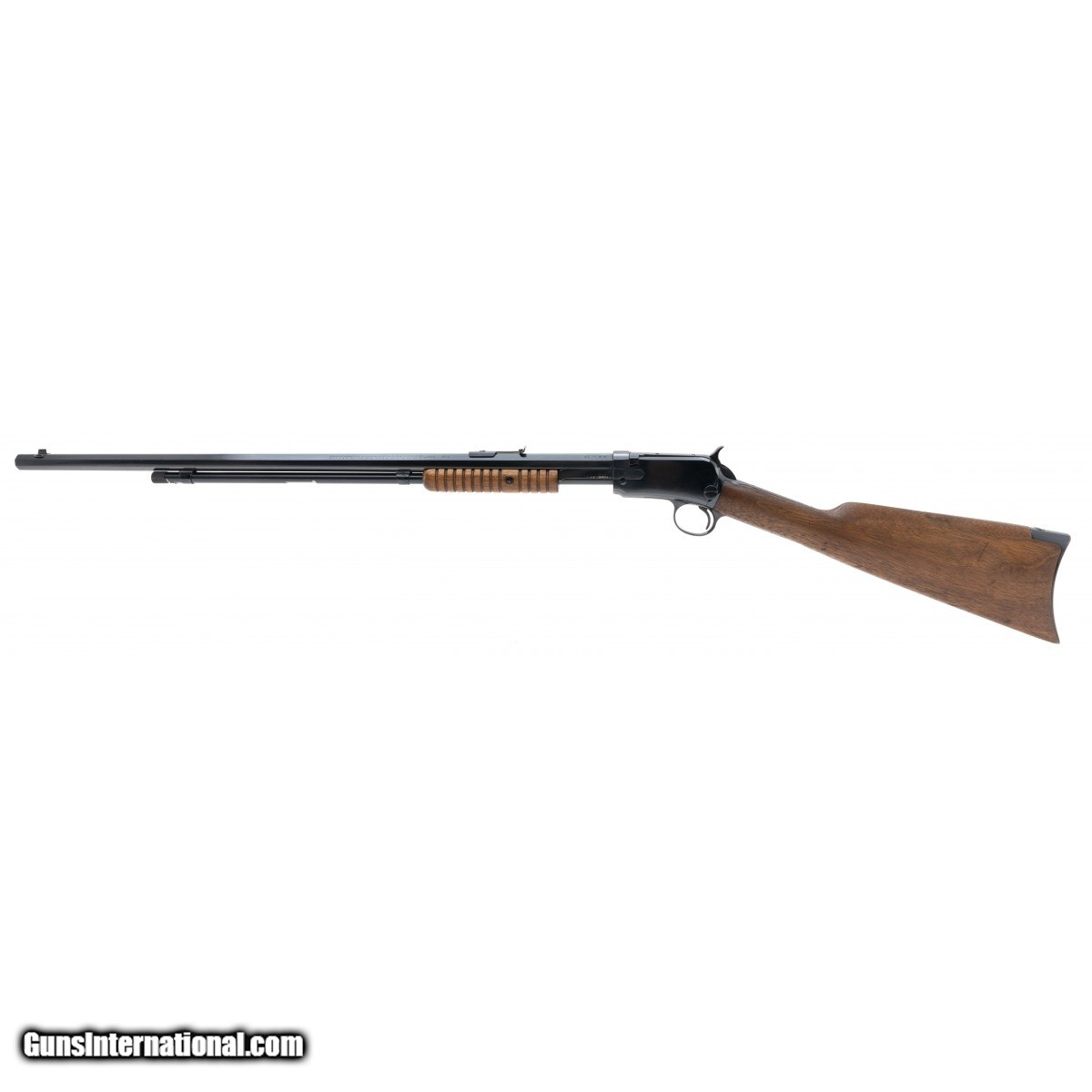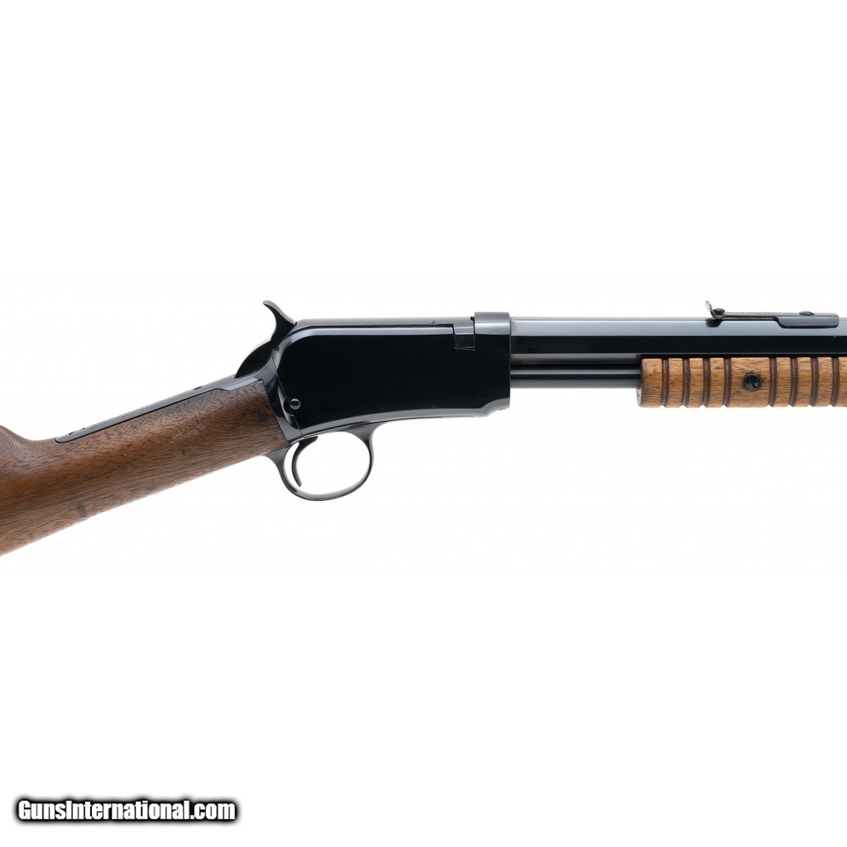 SN: 652984A. Manufactured circa 1920. Chambered in .22 Winchester Rimfire with a 24"" barrel, bore is excellent. Rimfire slide action rifle with the receiver-barrel been expertly reblued. Wood is very good with light wear. Overall very good condition.