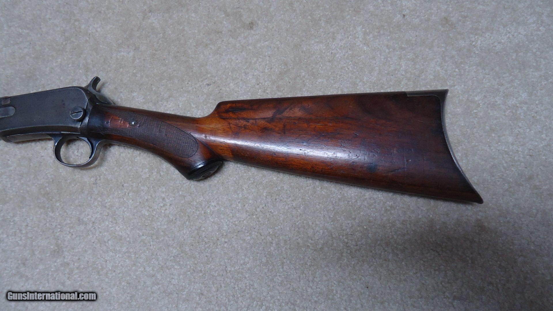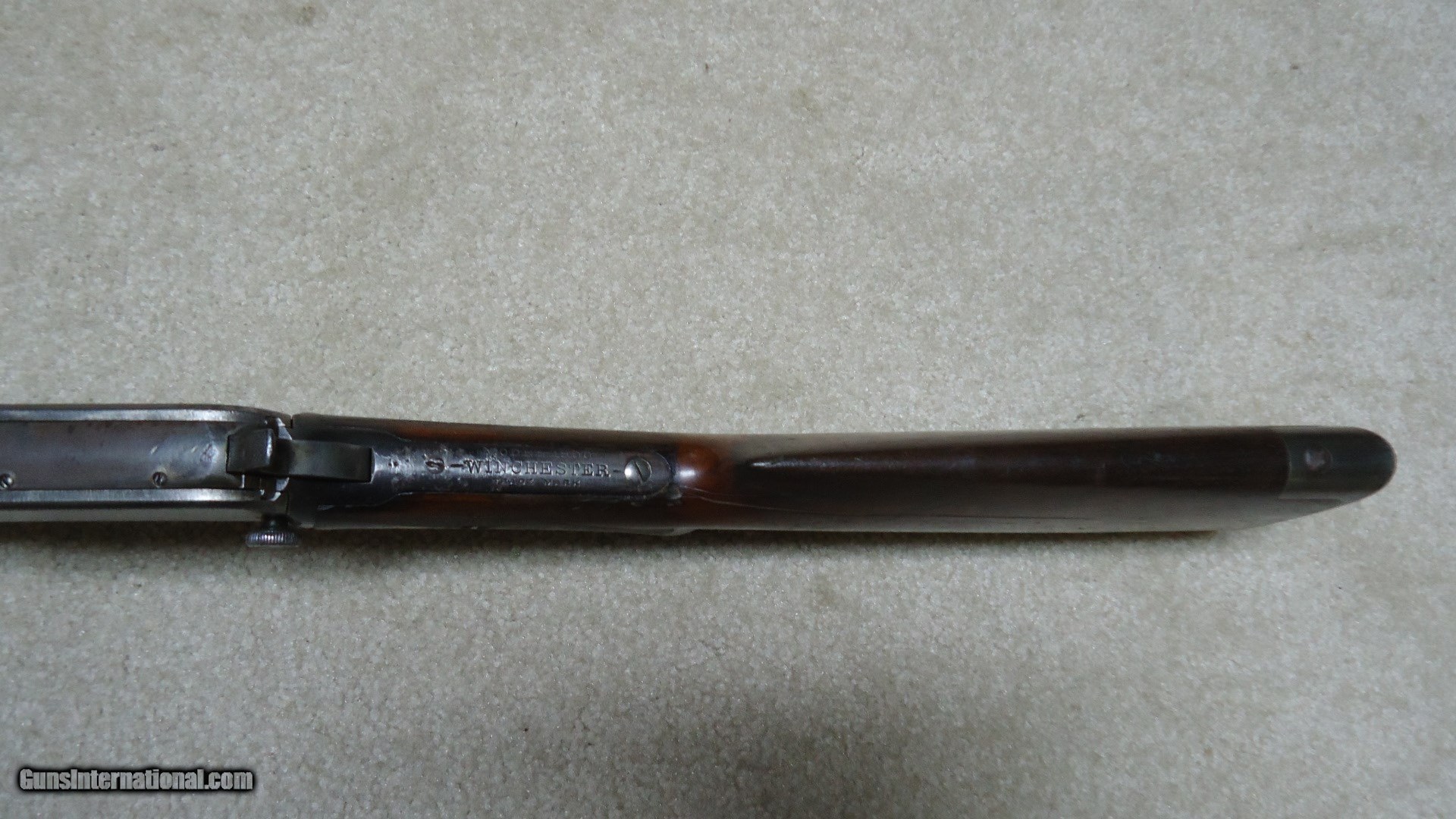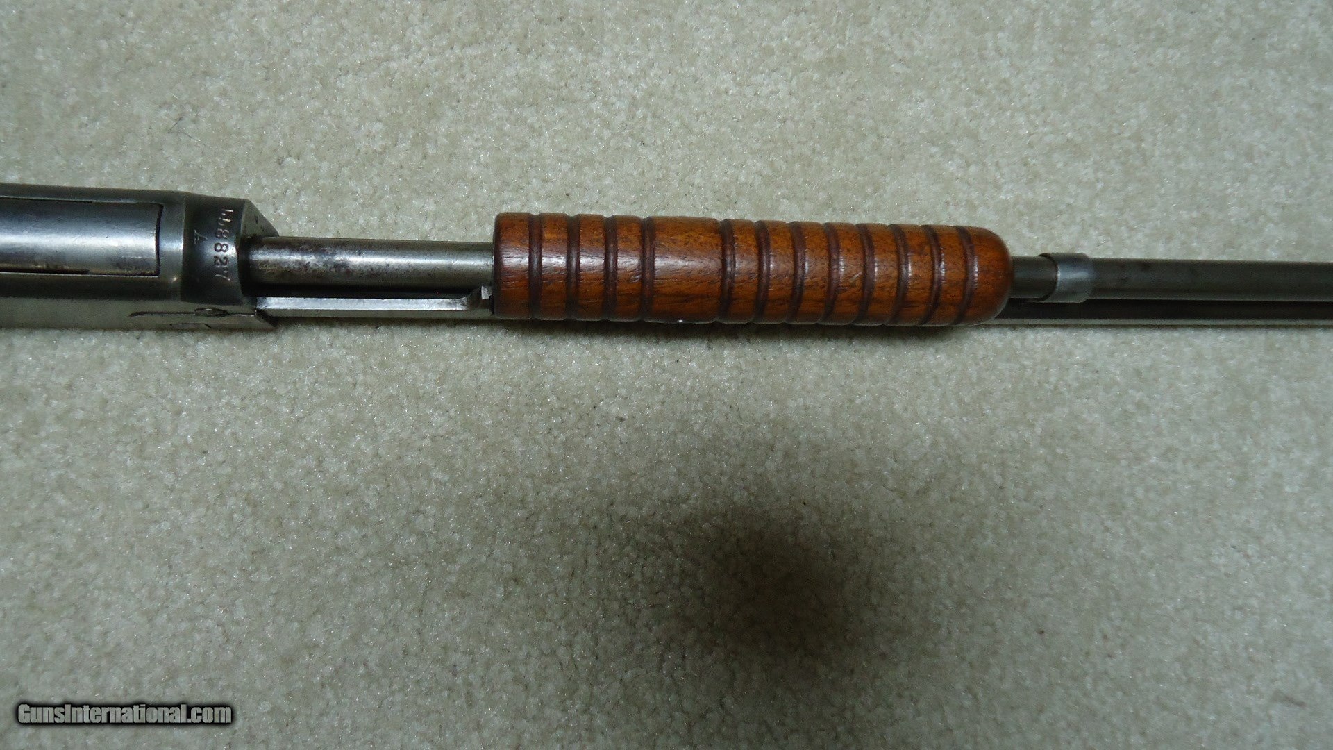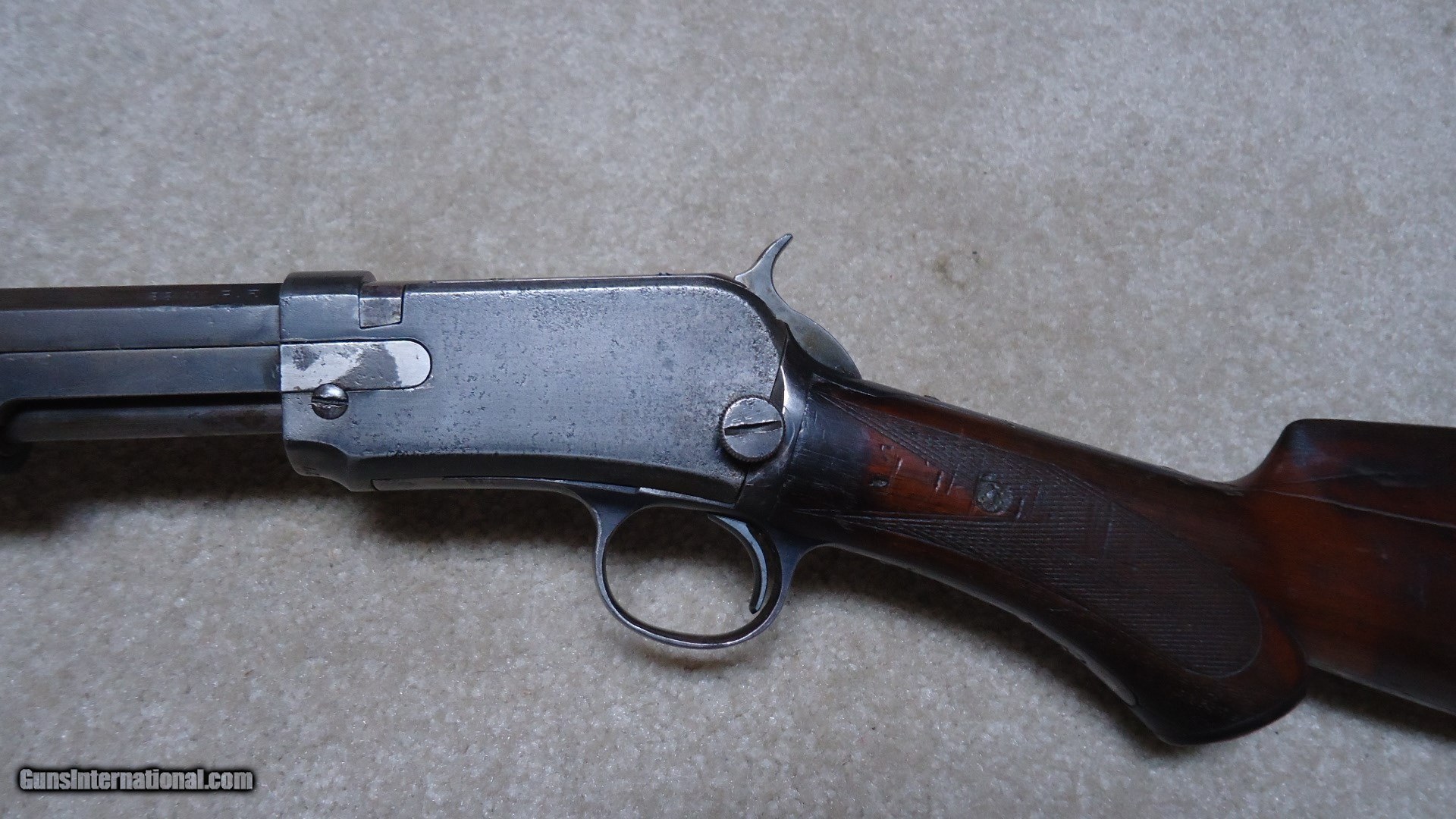Description: 1890 SEMI-DELUXE PISTOL GRIP .22 WRF CALIBER RIFLE, MADE 1916. This would make a good project gun or be a good candidate for restoration as the receiver serial number is in the 558XXX range and the mismatched rear stock and trigger assembly number is in the 246XXX range. It is a factory checkered pistol grip butt stock with correct Winchester embossed grip cap. Apparently it was reinforced fwith with a thin cross bolt at the very forward part of the checkering pattern. The rest of the stock and forearm are fine with good wood to metal fit. Retains good markings and overall is a very thin aged blue mixing heavily with gray and brown. Original sights and functions okay. Bore is dark and only fair-good at best. Like I said, a good candidate for some T.L.C. SOLD Curio/Relic: Yes Manufacturer: Winchester Model: 1890 SEMI DELUXE Serial Number: 558XXX Caliber Info: .22 WRF Condition: GOOD Barrels: 24" OCT. |