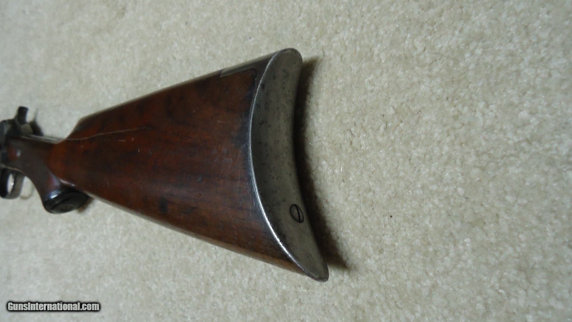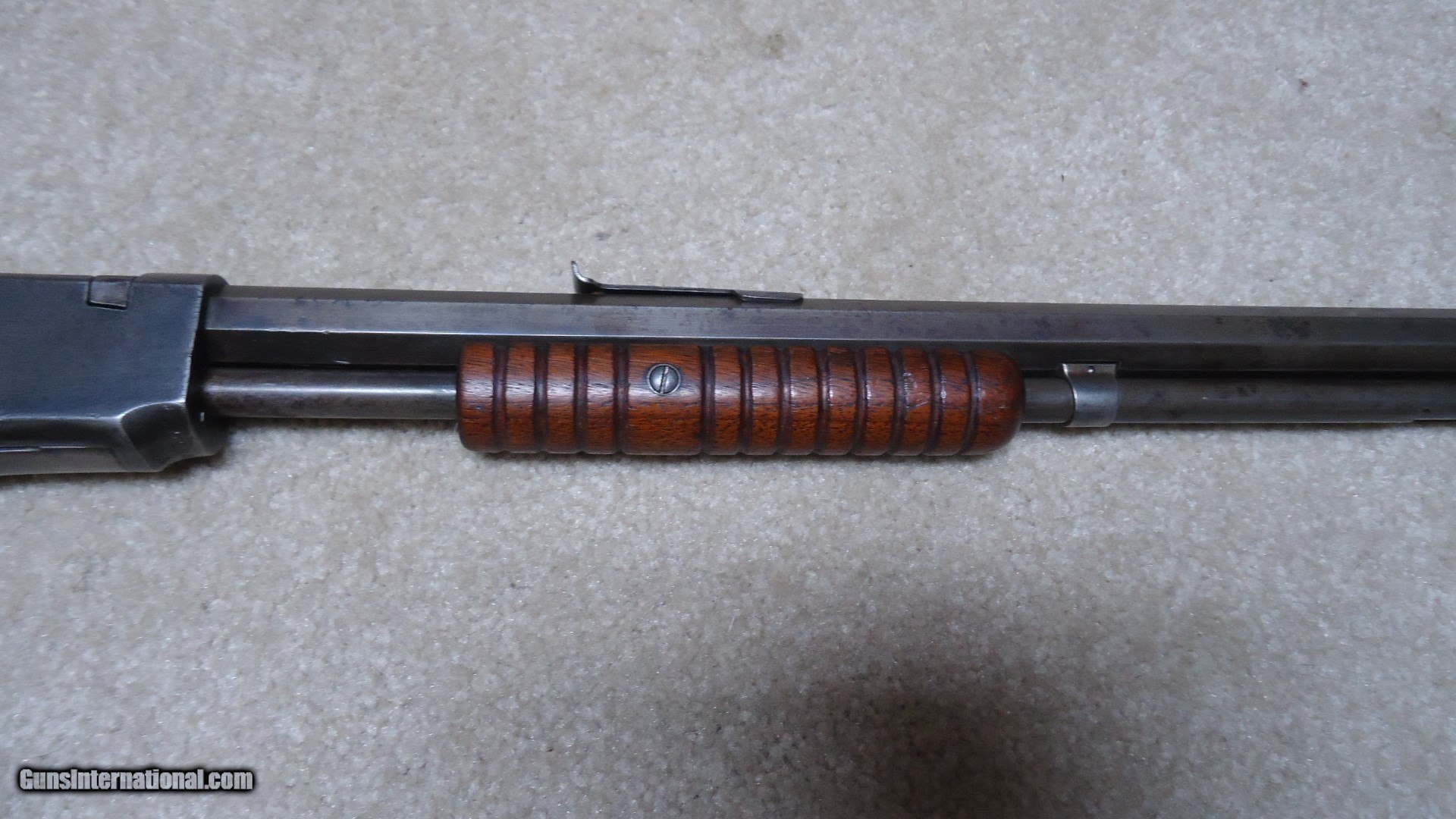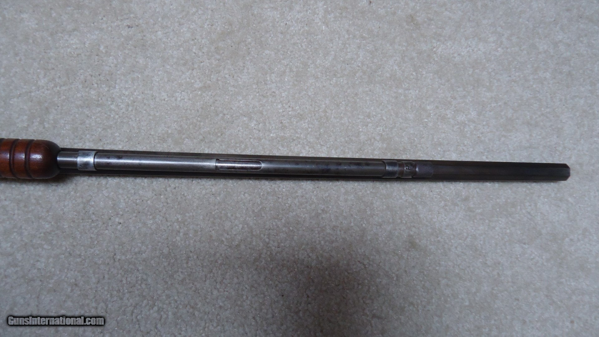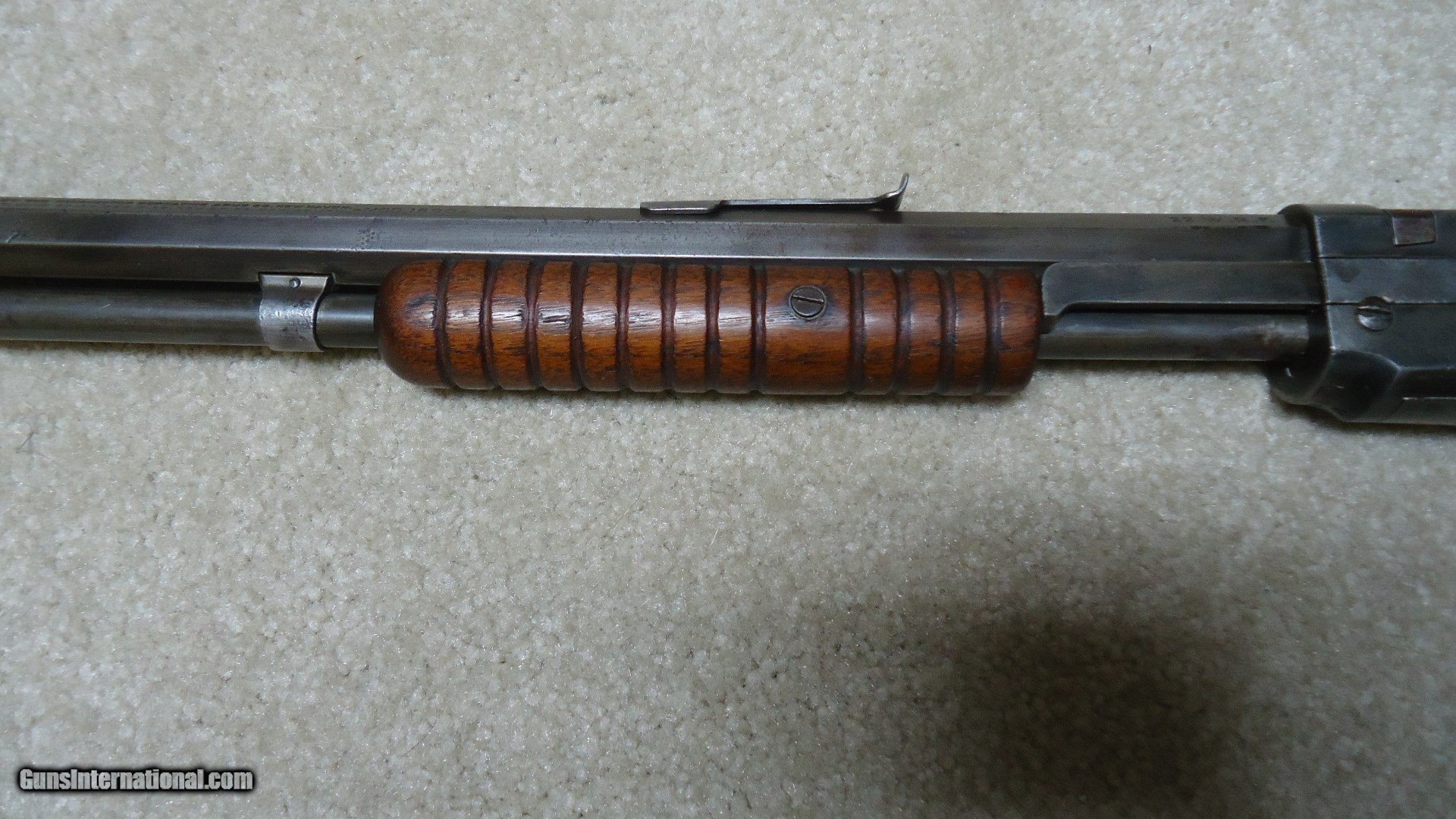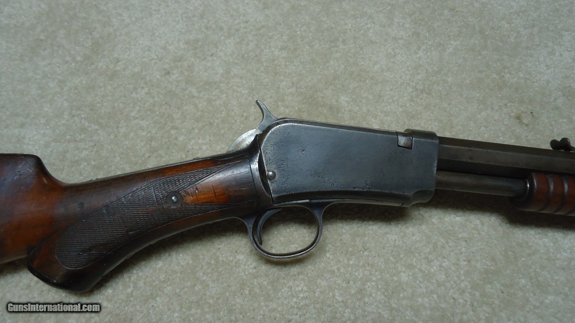 Description: 1890 SEMI-DELUXE PISTOL GRIP .22 WRF CALIBER RIFLE, MADE 1916. This would make a good project gun or be a good candidate for restoration as the receiver serial number is in the 558XXX range and the mismatched rear stock and trigger assembly number is in the 246XXX range. It is a factory checkered pistol grip butt stock with correct Winchester embossed grip cap. Apparently it was reinforced fwith with a thin cross bolt at the very forward part of the checkering pattern. The rest of the stock and forearm are fine with good wood to metal fit. Retains good markings and overall is a very thin aged blue mixing heavily with gray and brown. Original sights and functions okay. Bore is dark and only fair-good at best. Like I said, a good candidate for some T.L.C. SOLD Curio/Relic: Yes Manufacturer: Winchester Model: 1890 SEMI DELUXE Serial Number: 558XXX Caliber Info: .22 WRF Condition: GOOD Barrels: 24" OCT. |