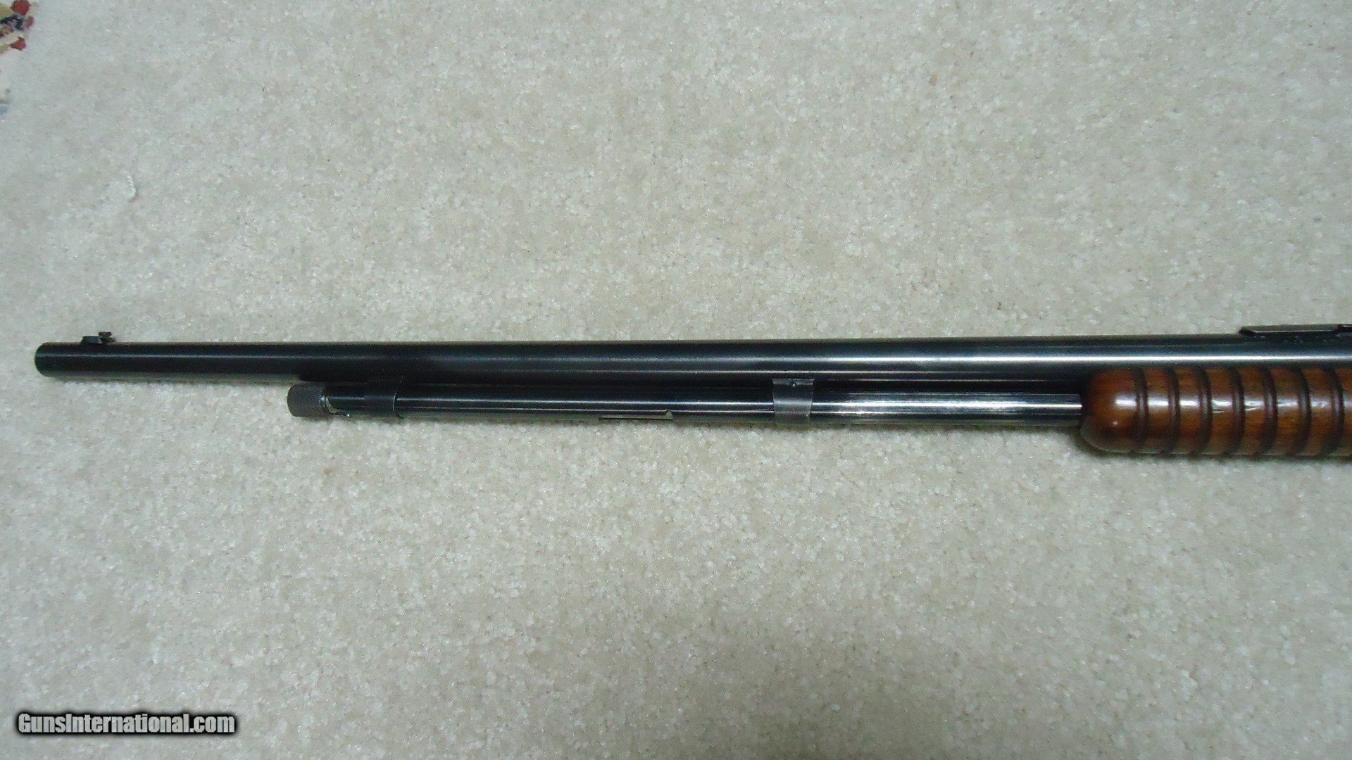 Description: EXCEEDINGLY RARE MODEL 90 IN DESIRABLE .22 LONG RIFLE CHAMBERING WITH FACTORY 23" ROUND BARREL, #800XXX, MADE JUST BEFORE THE GREAT DEPRESSION IN 1929 (The Winchester dates of manufacture books seem to suggest that serial numbers for these topped out in 1932 at about 752000 with higher numbers after this date chosen at random up to about #849100). Checking with the Winchester Collectors Association online serial number look-up, this serial number shows a manufacture date of 1929. The 23" round barrels were seldom used during the "parts clean-up" of the Model 90 and most found today also have the oval P "mail order" proof mark indicating the barrel was sold separately as a replacement. This rifle has only the normal Winchester proofs on the barrel and receiver ring. This rifle is in exceptional condition with the receiver retaining most of the original blue with only some small areas of light flaking to brown on the right side with the balance showing exc. blue with some light scratches on the left side and the lightest of wear on the bottom of the trigger guard bow. Even the upper and lower tangs retain fine bright blue. The barrel and mag tube show bright blue. Excellent correct late markings. Excellent stock and forend with tight wood to metal fit and retains about all the original wood finish. Correct rear sight with very rare an unusual front sight with "revolving blade/beads" for different bead types! Bore is minty bright. A really great and rare M-90 variant in a desirable caliber! Almost never seen like this. SOLD Curio/Relic: Yes Rifle Caliber: .22 Long Rifle Manufacturer: WINCHESTER Model: M-90 ROUND BARREL Serial Number: 800XXX Barrel Length: 23" ROUND Condition: EXCELLENT Bore Condition: EXCELLENT |