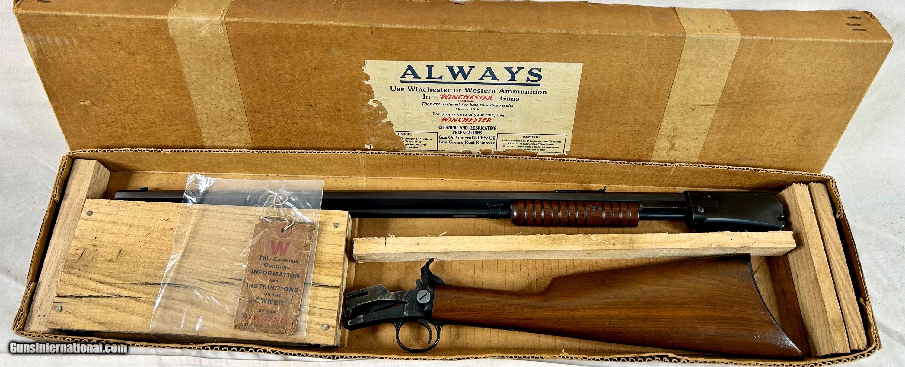 Description: *****SOLD*****Up for sale I have a Winchester 1890 that is new in its original box. This is the holy grail of slide action 22s. I have never seen an 1890 in the box. This particular gun was made in 1919 and was put up ever since. There are just a couple tiny tiny chigger bites on the wood that I photographed but other than that the gun is flat new. Included is the original Winchester envelope that came in the box. This is the centrepiece of 22 collecting and a must have to any serious collector. Shipping will be $99 and to curio and relic or FFL license holder only. Please don't hesitate to ask any questions or request anymore photos. SOLD |