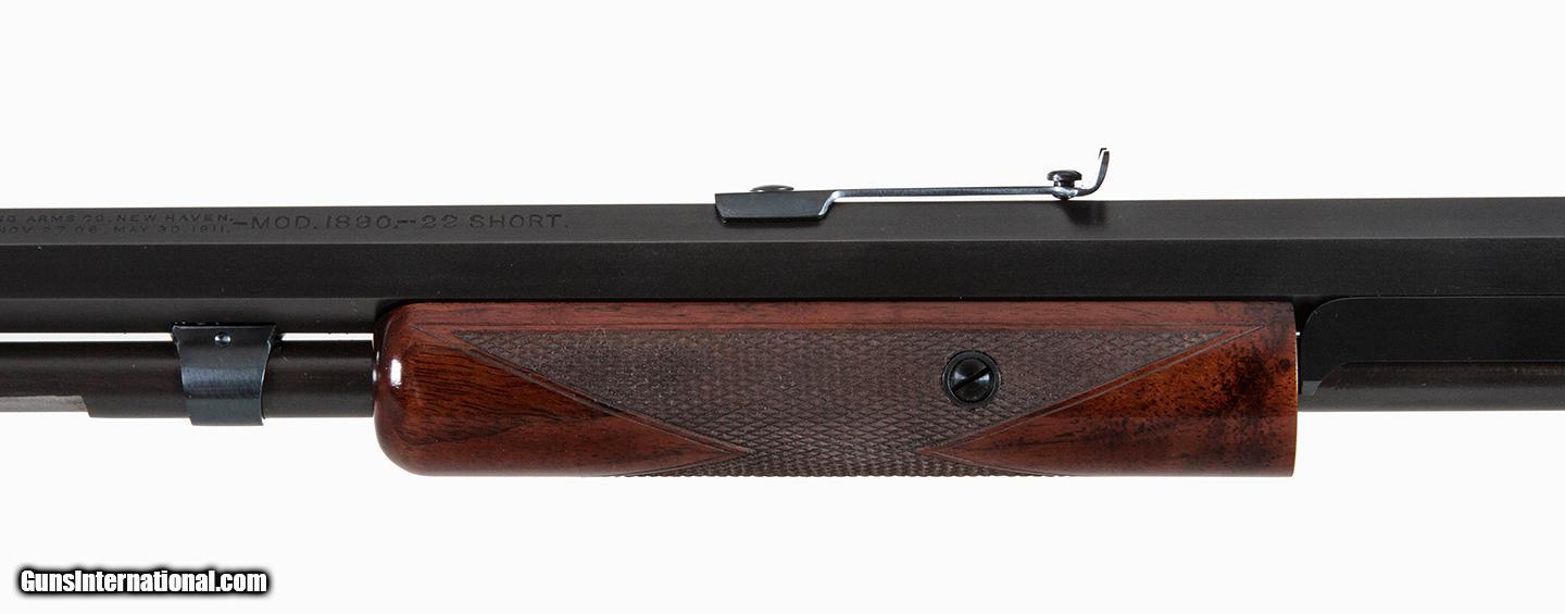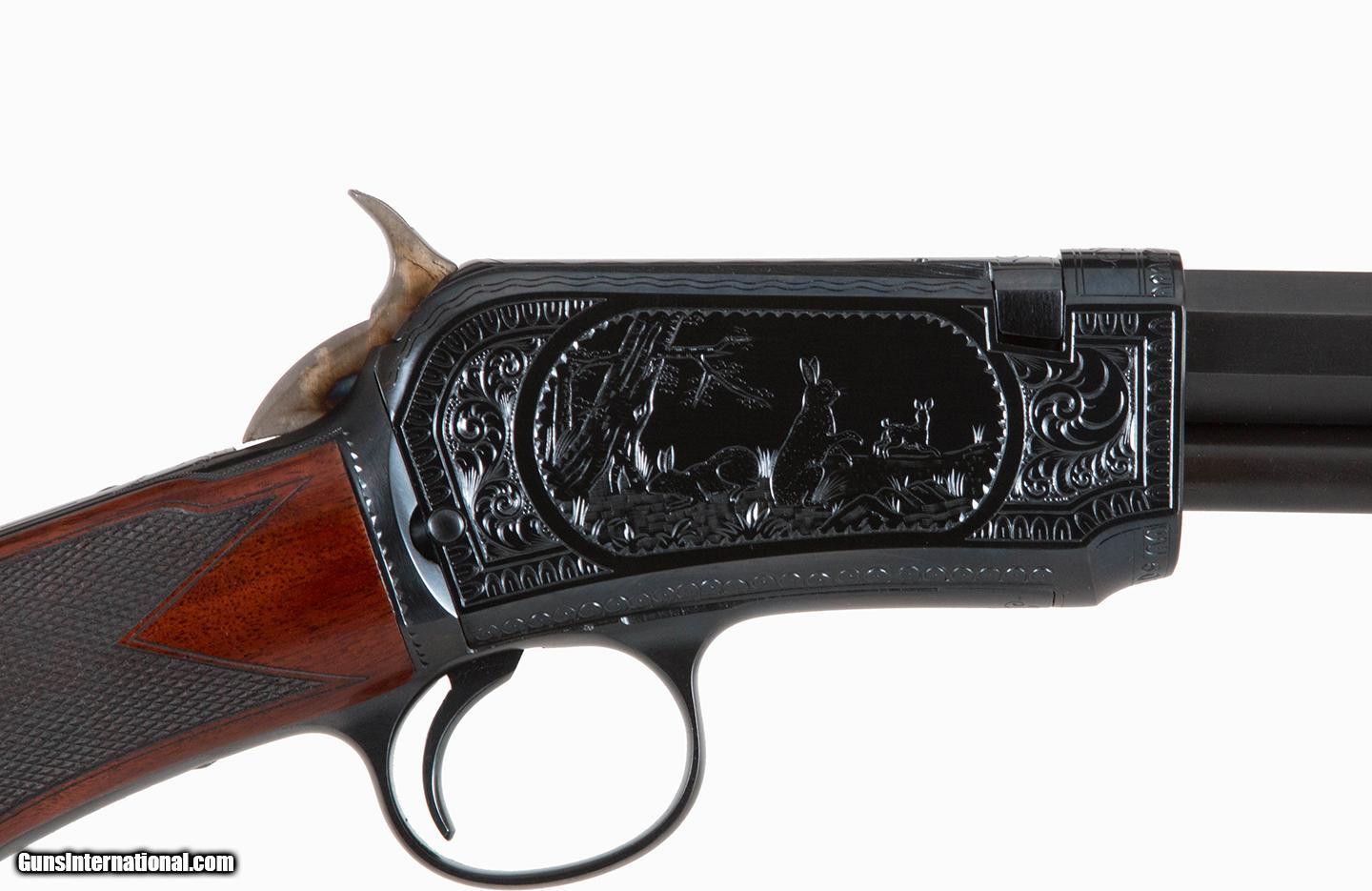 Description: This is an original restored Winchester 1890 Deluxe chambered in .22S and manufactured 1918. All the metal on this gun are original, and the wood has been upgraded to have H pattern checkered pistol grip and fore end. All restoration work was done by Turnbull Restoration. This Winchester 1890 Deluxe has a 24'' blued octagon barrel. The barrel, receiver, trigger, butt plate and parts have been blued using time period correct finish, and the hammer has been case colored. The rifle has also been upgraded to have the Winchester #8 engraving pattern on the receiver. The engraving depicts animals on both sides, with rabbits on the right side and squirrels on the left. For additional information or photos, please call 585-657-6338. SOLD Manufacturer: Winchester Model: 1890 Deluxe Serial Number: 608720 Caliber Info: .22 Short Condition: Restored Barrel Type: Octagon Action: Pump Butt Pad: Crescent Manufacture Date: 1918 Engraving: Winchester #8 Item Location: NY |