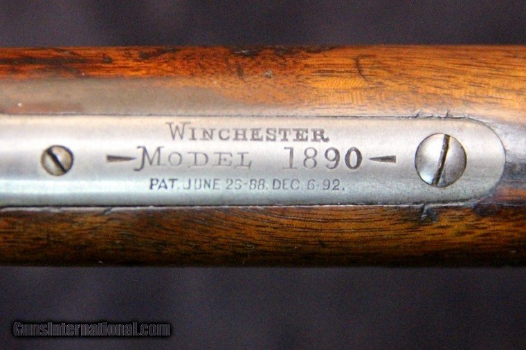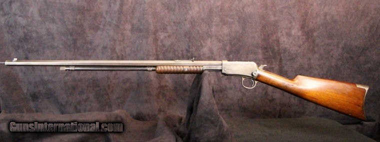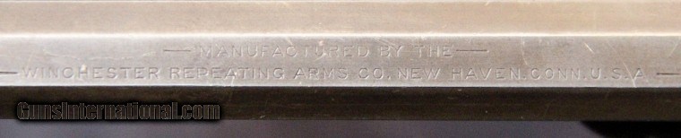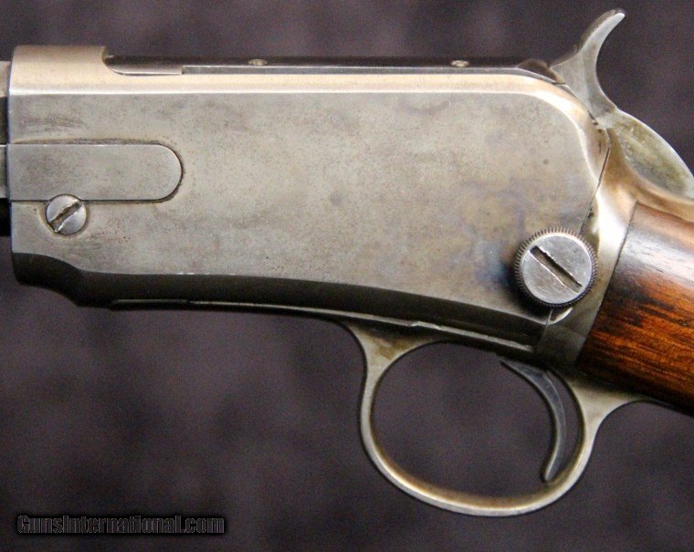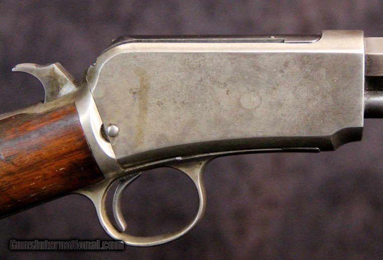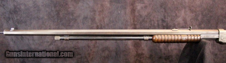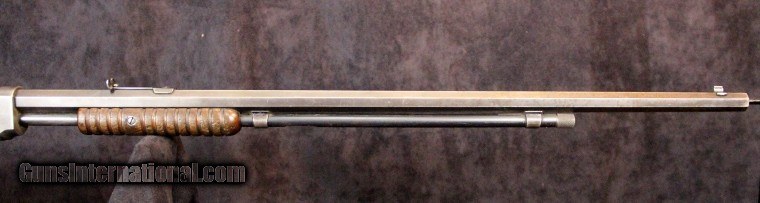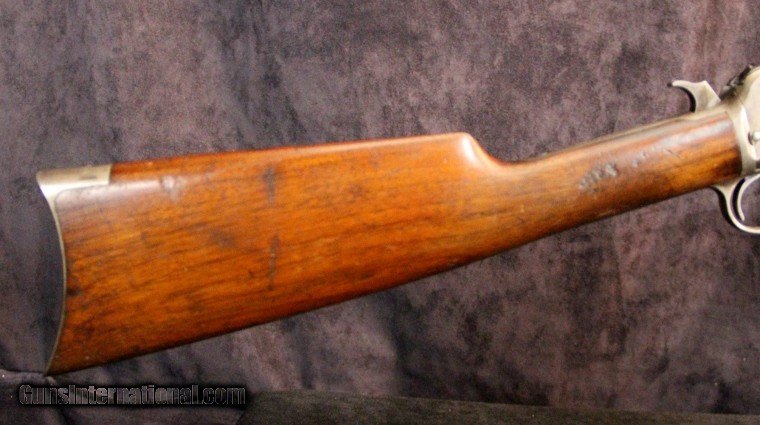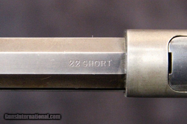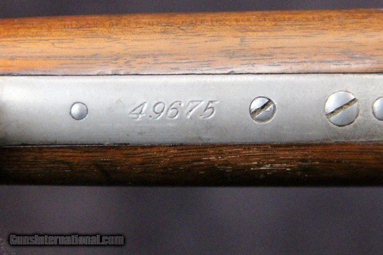 Description: .22rf, short, #49675, 24 inch barrel, blue and case color finish, walnut stock and forearm, original sights, 1897. Condition: very good bore with some frosting, 70% barrel blue thinning, 50% case color on frame fading, excellent wood with use dings, excellent mechanically, excellent marks. SOLD Antique: Yes |