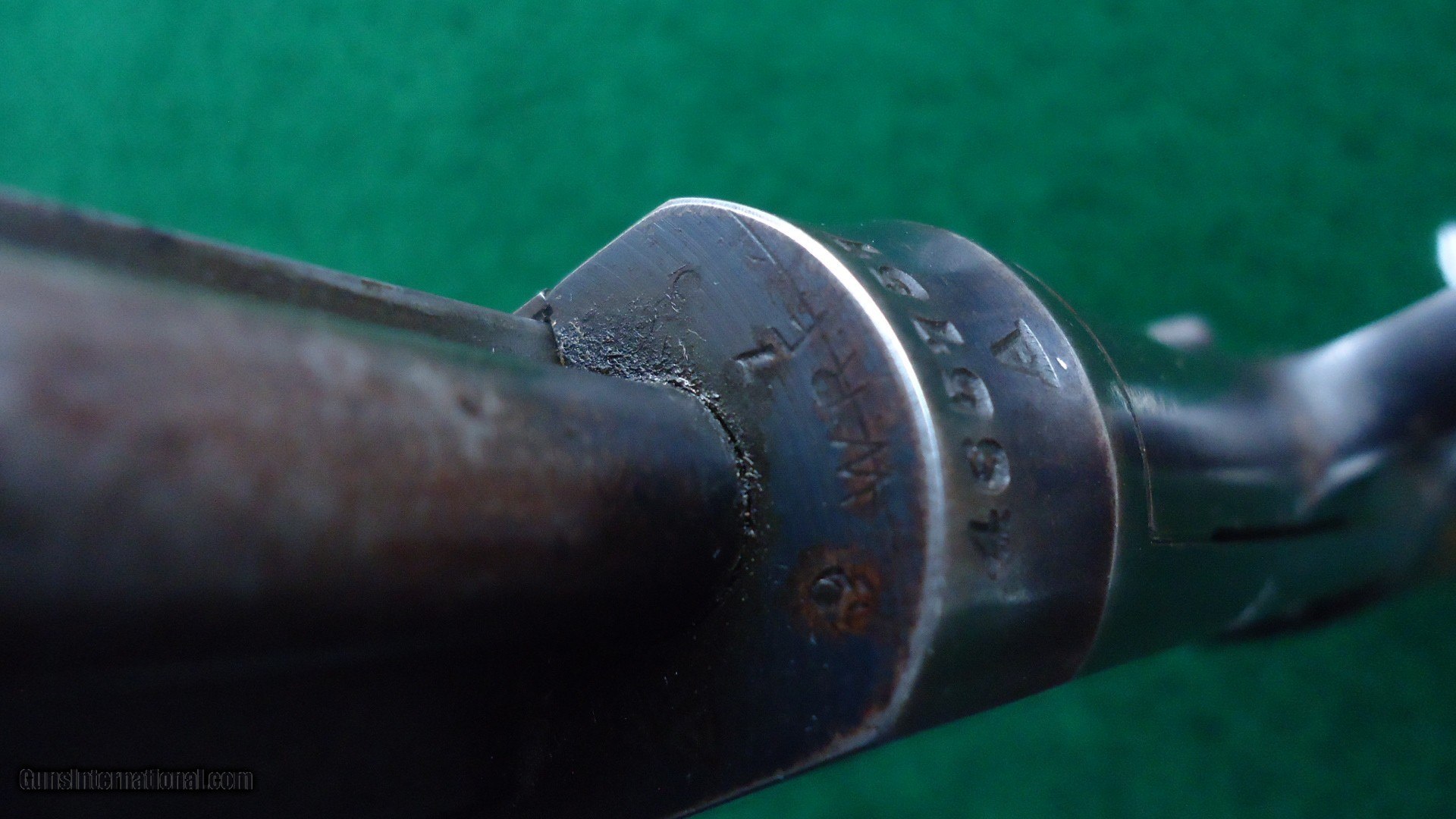 Description: Standard length 24 inch octagon barrel chambered in 22 WRF caliber with a very good shiny bore. Original sights include a bead front and a sporting rear with a folding tang sight. Most barrel and mag blue remain with sharp corners and good markings. About 80% receiver blue remains with some carry wear and spots of very light pitting. Dark traces of case color on the hammer. Walnut stocks show some wear scattered scratches and handling mars. Tight crisp action. Not a bad looking Winchester that was made in 1912. Leroy Merz Antique Firearms specializes in antique and vintage Winchesters and other fine American firearms. Since 1965 Mr. Merz has taken part in the world of firearms and has been a contributor to many well known reference books. We have hundreds of additional guns in every price range at our home online. Search for Merz Antiques in google. SOLD Curio/Relic: Yes Rifle Caliber: .22 WRF |
