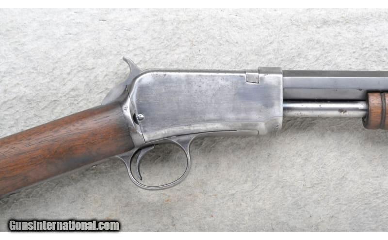 Description: This Winchester Model 90 is a right hand pump action rifle in .22 W.R.F. Cal. It has 24 inch octagon barrel. A blade front sight and an adjustable notch middle sight. The butt stock is a smooth grip walnut straight grip. The forearm is a grooved grip walnut. Serial Number 384185 (1909). .22 WRF SOLD Curio/Relic: Yes Chambers: Tube magazine. Metal Condition: "Fair. Has blue wear, handling marks and freckling. Wood Condition: Good. Handling marks and wear. Bore Condition: Very Good. Barrels: 24 inch octagon. Stock Dimensions: LOP 12 3/4 inches. Fore End: Grooved walnut. Butt Pad: Smooth steel crescent. Weight: 5 lb. 10 oz. Sights: Blade front. Adjustable notch middle. Item Location: Richfield, WI |
