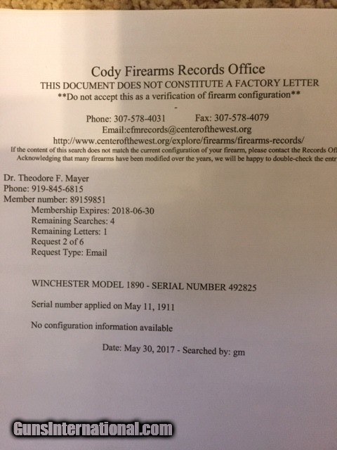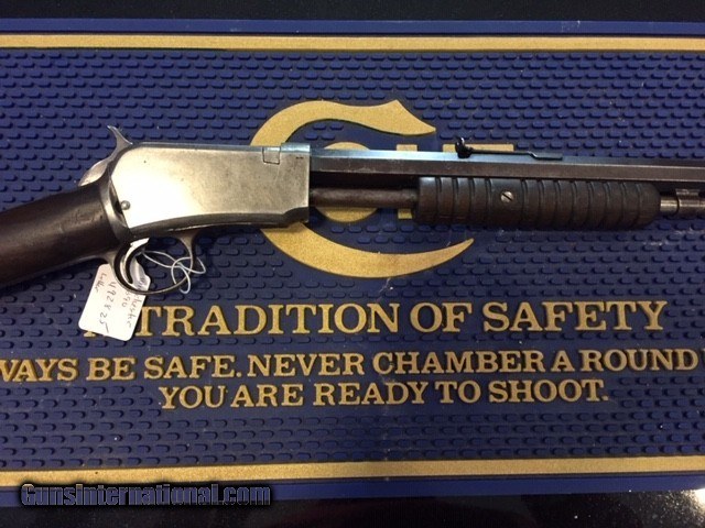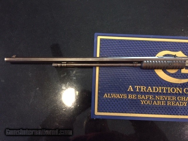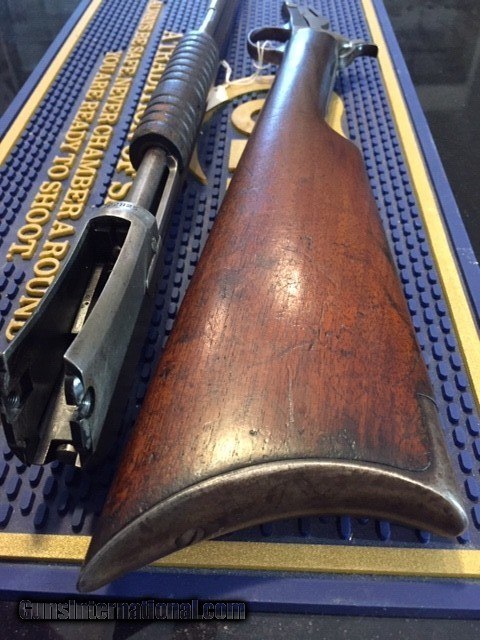Description: WINCHESTER Model 1890 22 long rifle Description: Winchester Model 1890 Description: .22 lr 492825 24 inch octagonal barrel with a lot of blueing turning plum / brown walnut stock and forearm original sights. Excellent markings Appears to have been converted to 22lr - cheaper to shoot. Bore is frosty, but shoots well and accurately. Cody Firearms record look up letter included: Serial number applied on May 11, 1911. Condition: good wood see rear left forearm behind screw, excellent mechanically, excellent marks, bluing turning plum/bown, no pitting $599 plus $40 shipping insured to your FFL. C&R eligible if legal to ship to your state and jurisdiction - know your laws. SOLD Curio/Relic: Yes Manufacturer: WINCHESTER Model: 1890 Serial Number: 492825 Caliber Info: 22lr Bore: worn/frosted Condition: used Metal Condition: no pitting Wood Condition: good Barrel Type: Octagon Action: Slide Action / Pump |
