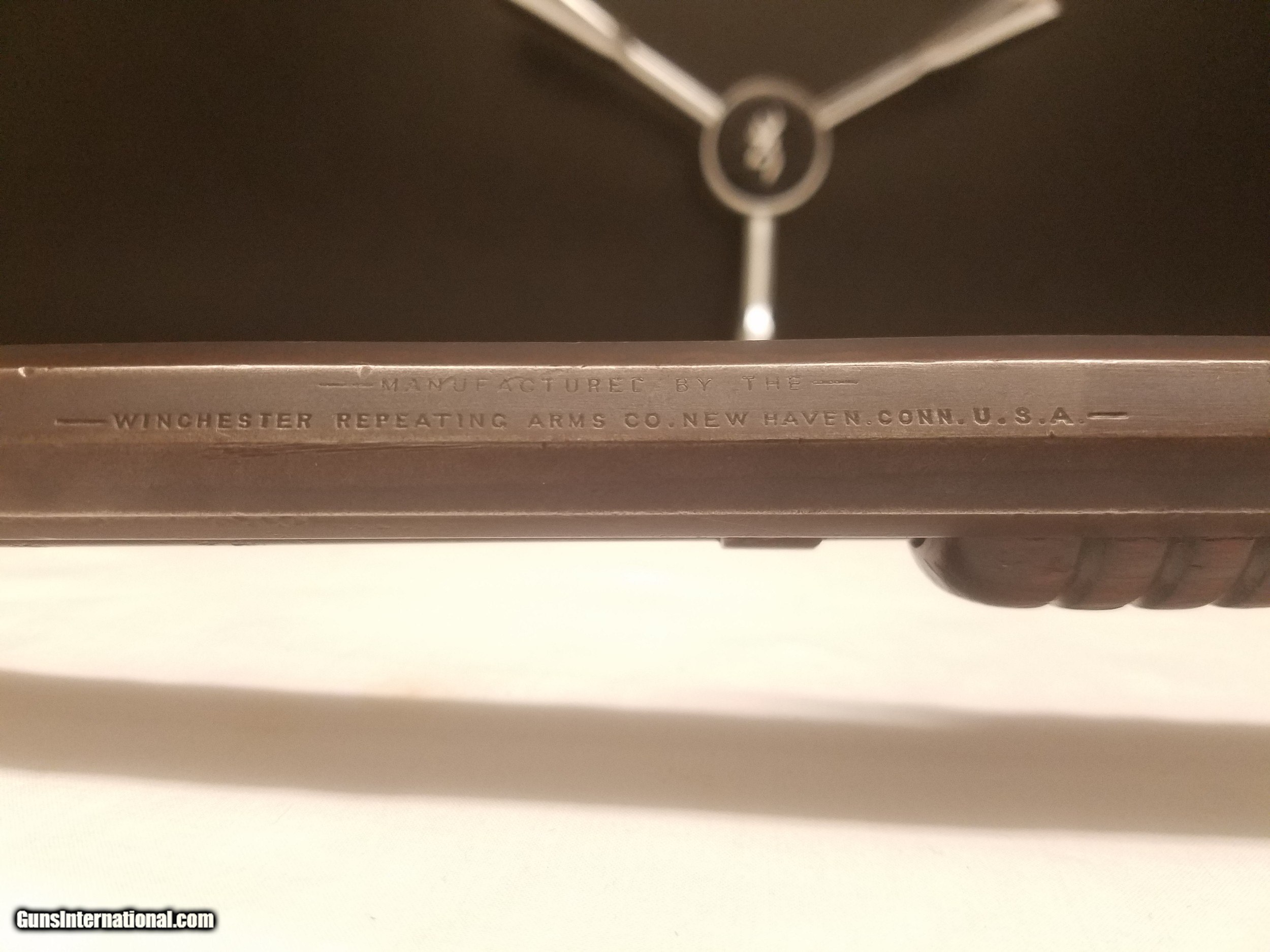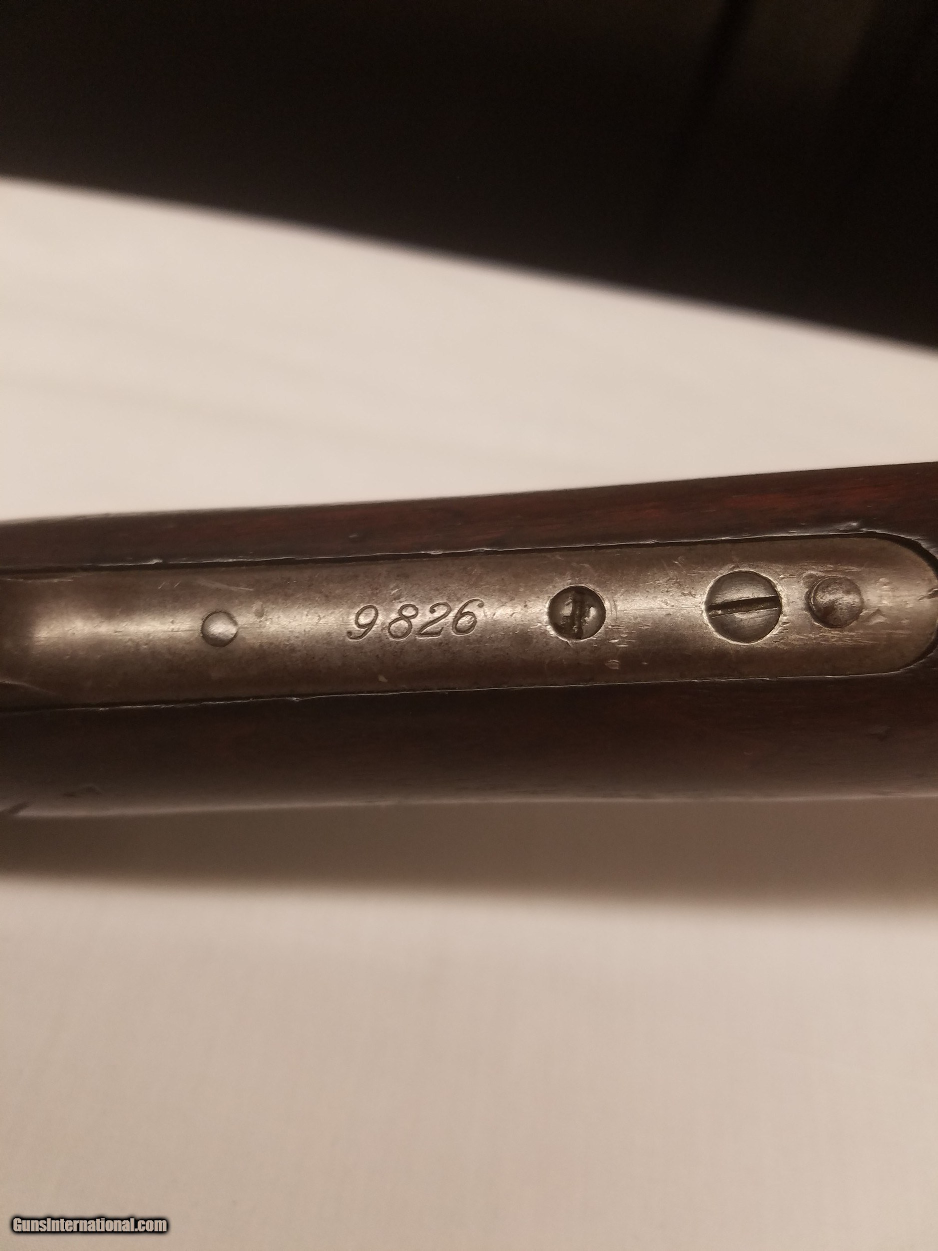 Description: Winchester model 1890 manufactured in 1891. Serial # 9826. Solid frame first model. Condition is very good but has some wear from use. Has correct broken D barrel address for first year models. All script is crisp and legible. Wood has original finish and in excellent condition. Only flaw is that initials BP were carved into the left side of the stock.These initials have been there a very long time. Condition of the metal is good but has faded to a patina. Case hardened colors are visible along the trigger guard. Barrel does show a mixture of original bluing and patina. Comes with a factory letter from the Cody Firearms Museum. Call or email with any questions. SOLD Antique: Yes Manufacturer: Winchester Model: 1890 Serial Number: 9826 Caliber Info: .22 Short |