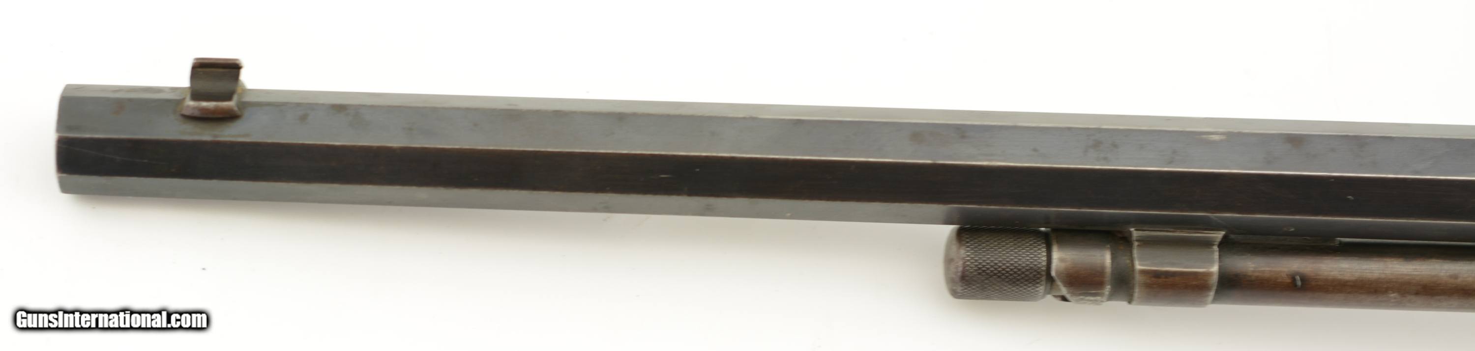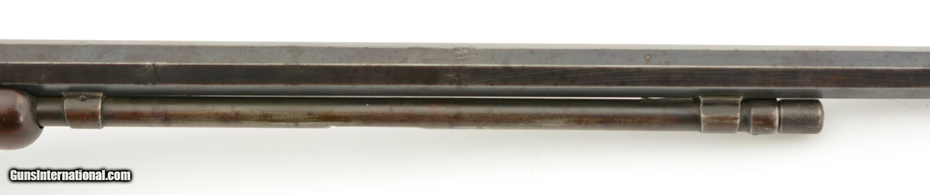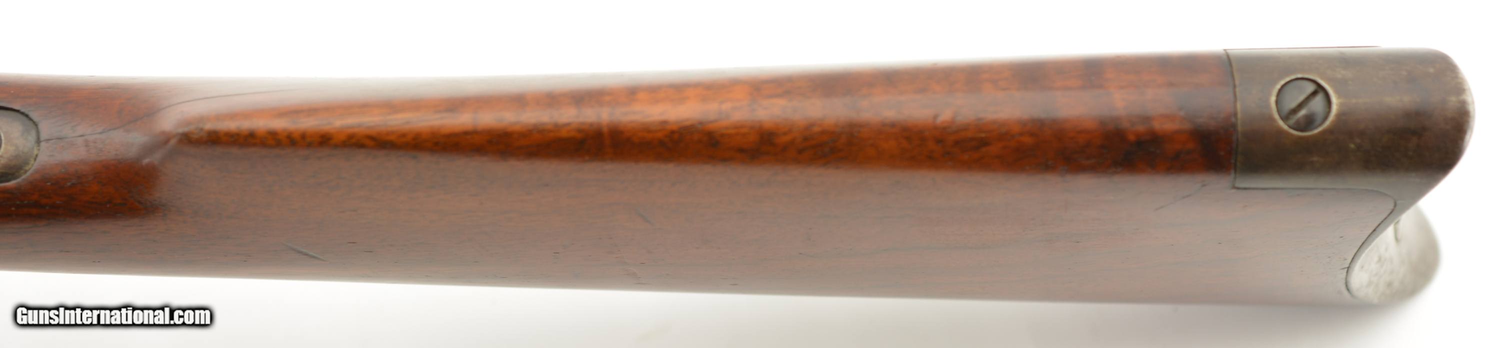Description: Serial #771895, .22 WRF, 24" octagon barrel with an excellent, bright bore. This is a 3rd Model rifle that has retained about 50-60% of the original blue on the barrel, with the balance having faded to a mellow plum-brown color, and silvering along the edges of the barrel facets. The frame has a more ruddy brown patina with patches of thin surface freckling scattered about, and mottled gray metal is present on the wrist tangs. The grooved walnut forend is in fine shape, with some minor handling marks in the original oil finish. The buttstock has some further handling marks and surface blemishes on either side, as well as a single hairline drying crack running back from the tip of the bottom tang. This is a very nice example of a late production Model 90, in very good condition, and would make a good representative example for a collection. FFL or C&R SOLD Manufacturer: Winchester Model: 90 Serial Number: 771895 Caliber Info: .22 Gauge Info: .22 |