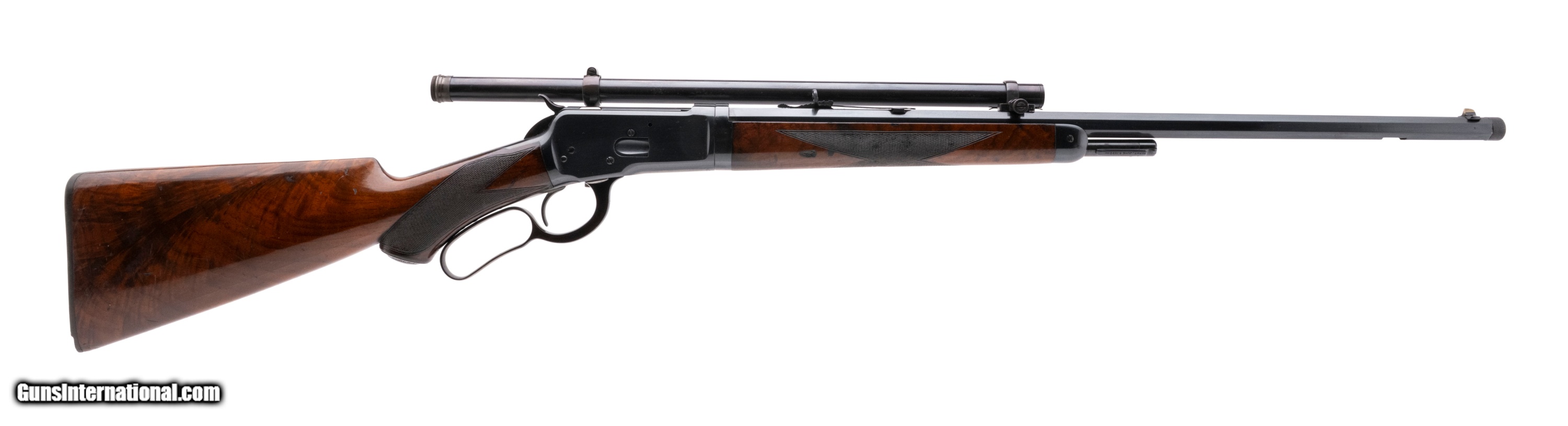 Description: "Serial number 419600. Made in 1907. 25-20 caliber with a 24" barrel. This is a beautiful deluxe takedown in excellent condition as factory refinished. This gun is too late of a serial number for there to be factory records. The wood is excellent with beautiful deluxe burl walnut. The checkering is nice and sharp. The metal is all factory refinished. There is a dovetail on the underside of the barrel for a magazine hanger. It appears this gun was returned to the factory to have the barrel threaded for a maxim silencer and probably had the scope installed as well. This is truly a beautiful deluxe gun that has many special order features. SOLD Curio/Relic: Yes |