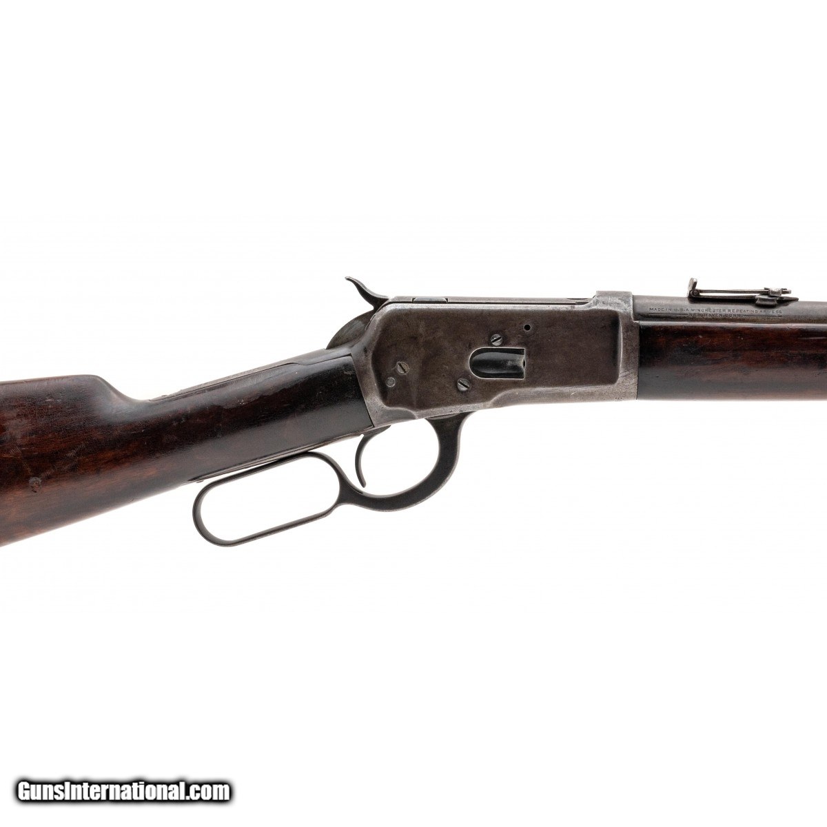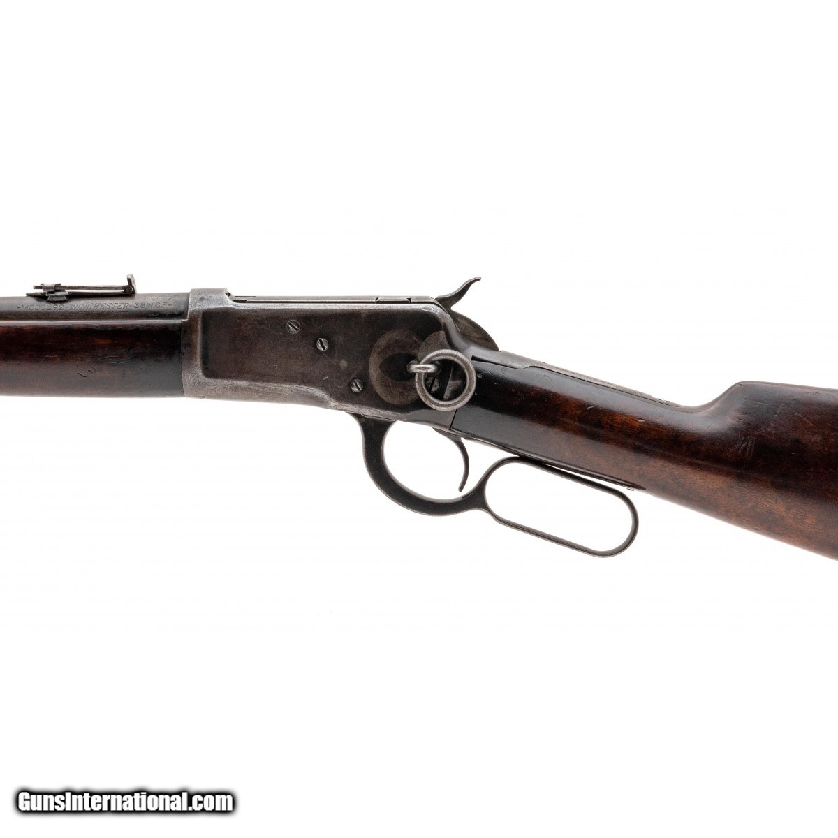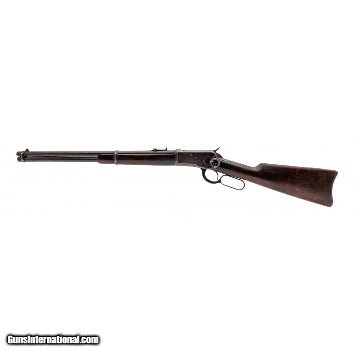 SN: 946308. Manufactured circa 1920's. .38 W.C.F. with a 20"" barrel. Bore is good to fair. Pre-war cowboy lever action carbine with grey-brown patina and saddle ring on receiver. Original wood grips have been revarnished and are in good condition. Overall condition is good.
