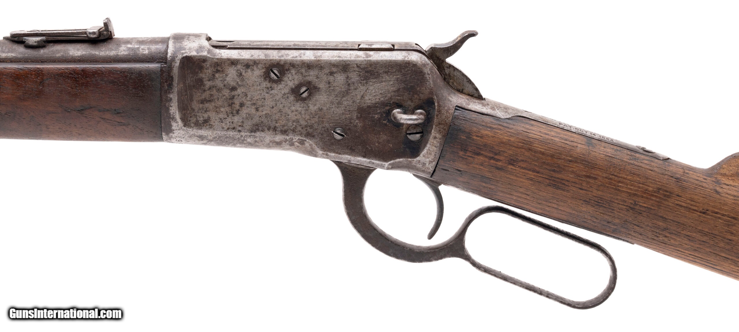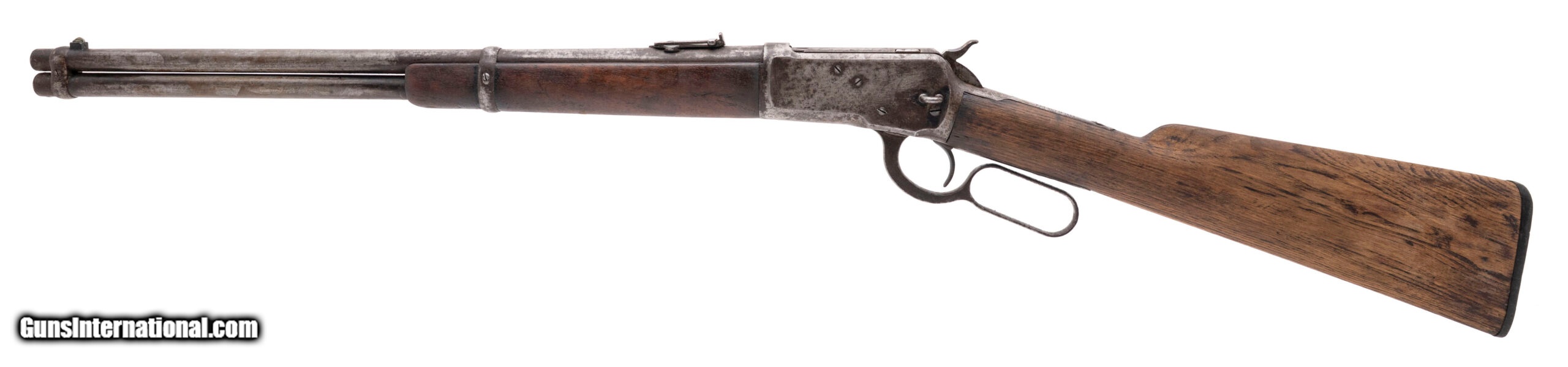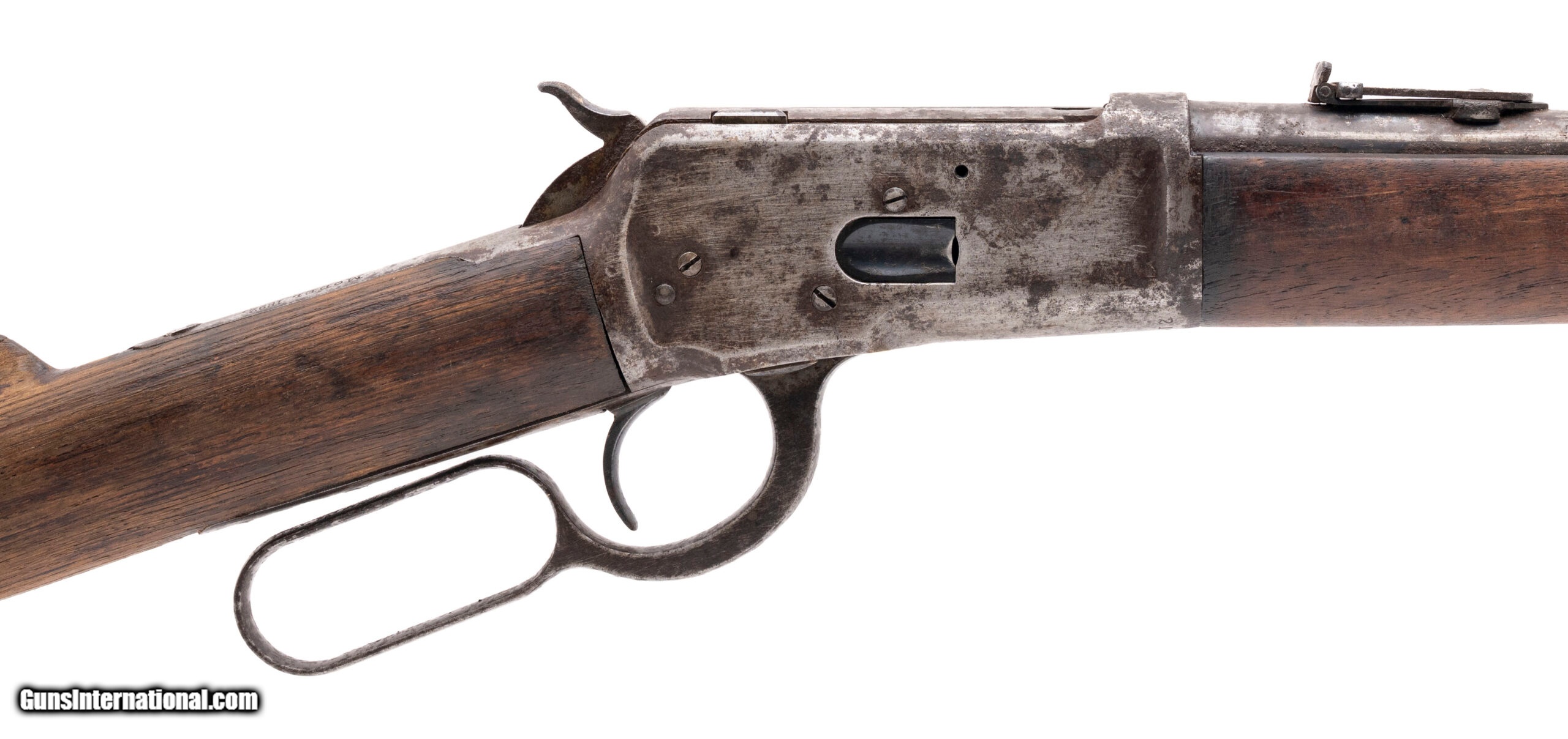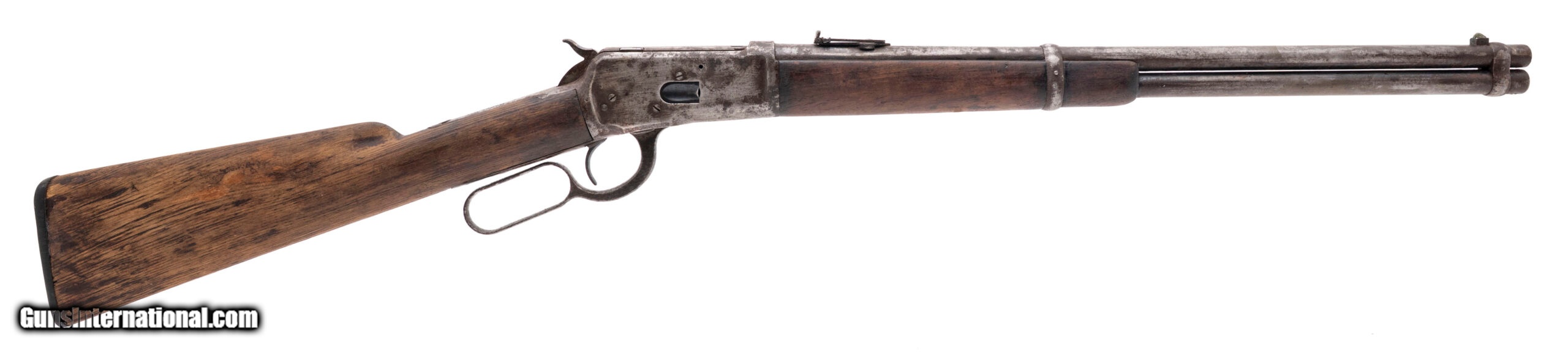 Description: "Serial number 214086. Made in 1903, .44 W.C.F. (.44-40 Winchester) with a 20-inch round barrel and a 38-inch overall length. Bore is bright with strong visible rifling but there is frosting between the grooves. Extensive oxidation is present on the receiver, barrel, magazine tube and lever. Wood forearm is in good condition but the buttstock is slightly bleached from sun exposure although there are no cracks in it. Original factory tangent rear sight assembly is present although the retaining screw is missing. The saddle ring is also missing although the mounting loop remains attached to the receiver. SOLD Curio/Relic: Yes |