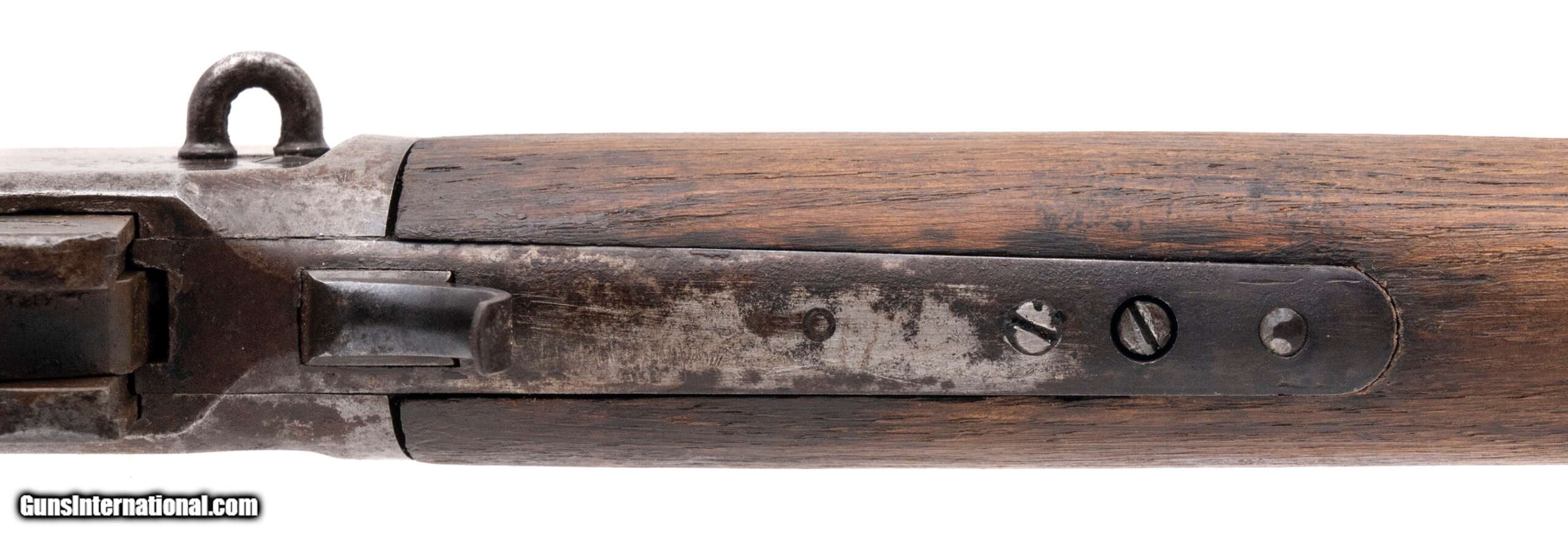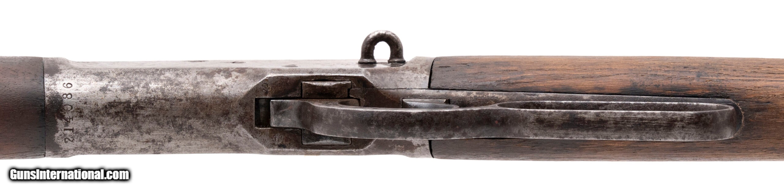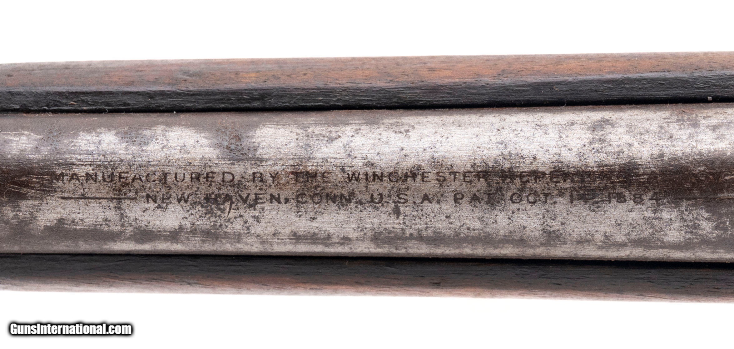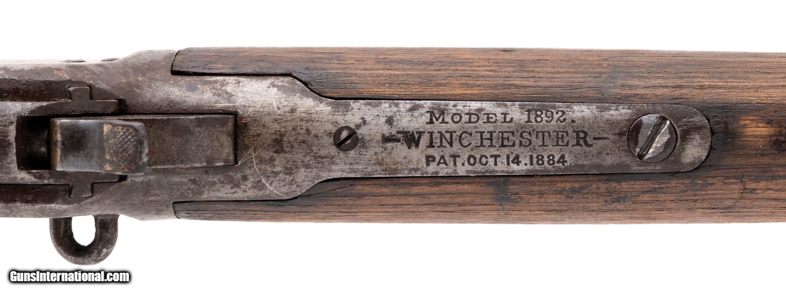 Description: "Serial number 214086. Made in 1903, .44 W.C.F. (.44-40 Winchester) with a 20-inch round barrel and a 38-inch overall length. Bore is bright with strong visible rifling but there is frosting between the grooves. Extensive oxidation is present on the receiver, barrel, magazine tube and lever. Wood forearm is in good condition but the buttstock is slightly bleached from sun exposure although there are no cracks in it. Original factory tangent rear sight assembly is present although the retaining screw is missing. The saddle ring is also missing although the mounting loop remains attached to the receiver. SOLD Curio/Relic: Yes |