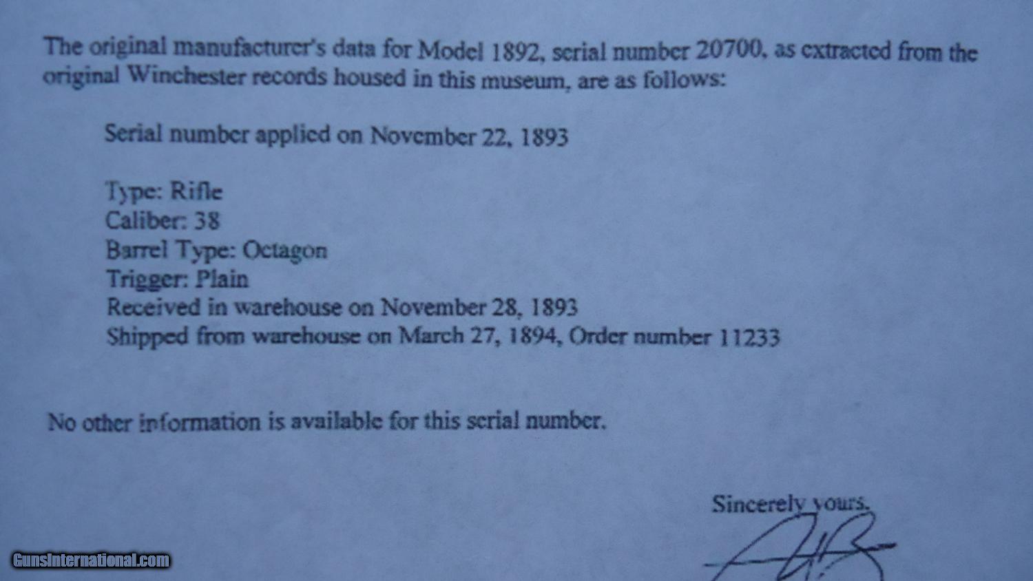Description: Nice early gun at just over 20k serial number. Oct bbl, full mag, crescent buttplate and cal 38 WCF. A good eye appealing gun with a nice vintage look. Bbl is blue towards the muzzle end and a more brown color towards the frame. Don't quite know if someone has put a little bit of finish on it. No sanding or anything has been done but color is just a bit different. Mag tube has no dents and has an aged color to it as does the frame. There is about 25% blue on the frame with the rest being a silver mostly at the carry point. Nice fitting wood with all 4 corners good. The forearm does not have the often seen crack. On the bottom of the stock behind the lower frame is a brass circle that looks like it may have had a letter on it at one time. Don't quite understand what that was? All in all this is a very nice Winchester 92. Antique 92's and 94's are seen for sale less and less. Here is your chance to own one at a reasonable price. Comes with a copy of a Winchester Letter. Leroy Merz Antique Firearms specializes in antique and vintage Winchesters and other fine American firearms. Since 1965 Mr. Merz has taken part in the world of firearms and has been a contributor to many well known reference books. Just recently we mailed the 126th edition of our privately-published catalog. We have hundreds of additional guns in every price range at our home online. Search for Merz Antiques in google. SOLD Antique: Yes |