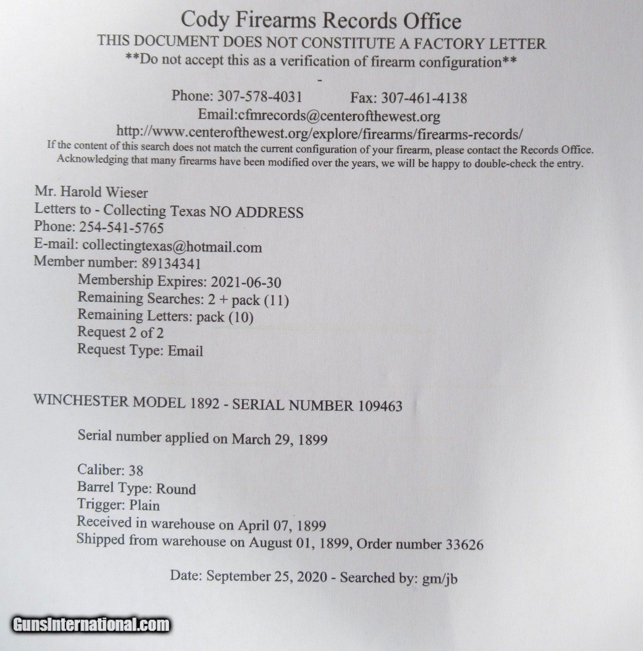 Description: SOLD--Winchester Model 1892; Serial No. 109463; Made 1896; Shipped August 1, 1899 per Cody Records; 38 W.C.F. (38/40) Caliber; 24” Round Barrel; Decent Amount of Original Wood and Metal Finish Present; Perfect Action and Very Strong Bore with light even chattering throughout; Should be Good 125 Year-Old Shooter/Collector Rifle; See All Photos for Condition; No Texts; Call (254)541-5765 or Email Only; PERSONAL PROPERTY of Harold Wieser; Price: $1,200 + $75 S&H Via UPS Ground; Payment Address: Harold Wieser - 1466 U.S. Hwy 77 - Rosebud, TX 76570; SEND PAYMENTS VIA USPS PRIORITY MAIL; SOLD Antique: Yes Manufacturer: Winchester Model: 1892 Serial Number: 109463 |