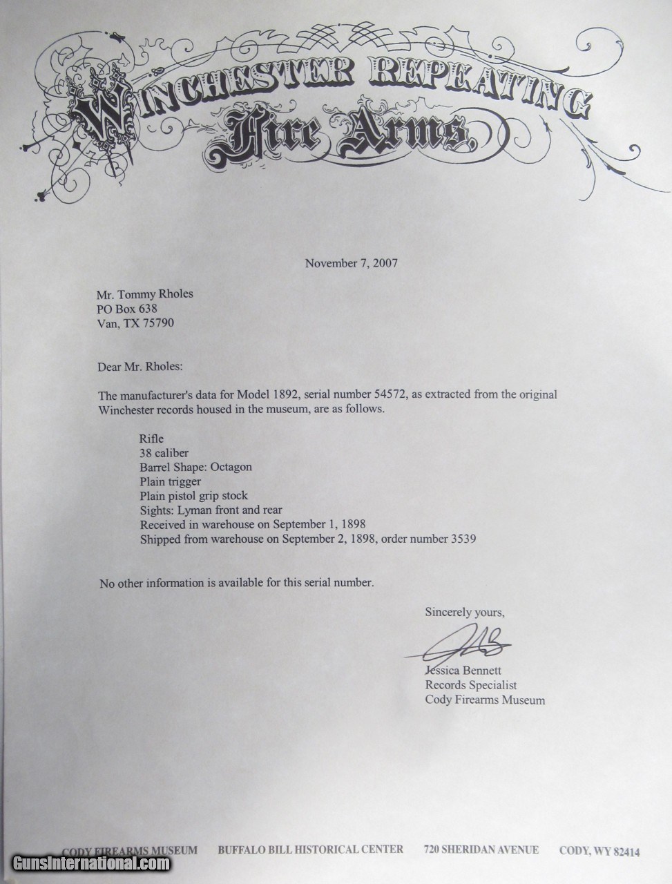 Description: Winchester Model 1892 Lever Action Rifle; Serial No. 54572; Made 1894 but Per Included Factory Letter: Shipped September 2, 1898 (Order Number 3539); Specs: .38 W.C.F. Caliber; 24” Octagon Barrel; Plain Trigger; Plain Pistol Grip Stock; Lyman Front and Rear Sights; Gun Has Nice Flip Up Tang Sights; Most All of Original Wood and Metal Finish Remains; PERFECT ACTION and BORE; I got this gun from One of Tommy Rholes East Texas Customers who said Tommy Got it From Hank Williams, Jr.; .38/40 Was his Favorite Caliber and Hank and Tommy Were Long Time Friends; Great Rare 1892 Special Order Winchester Rifle; 129 Year-Old Rifle with Great History; See All Photos for Condition; No Texts; Call (254)541-5765 or Email Only; PERSONAL PROPERTY of Harold Wieser; NOTICE: We Do Not Do Any Consignments - All Items Listed are Owned by Us - NO SALES to New Jersey or New York City - Antiques Only to Massachusetts and California; Price: $8,975 + $75 S&H Via USPS PRIORITY MAIL; Payment Address: Harold Wieser - 1466 U.S. Hwy 77 - Rosebud, TX 76570; SEND PAYMENTS VIA USPS PRIORITY MAIL; BEWARE of SCAMS!!! – DO NOT SEND MONEY or CORRESPONDENTS ELECTRONICALLY UNLESS YOU HAVE SPOKEN to HAROLD WIESER FIRST! 254-541-5765 SOLD Antique: Yes Manufacturer: Winchester Model: 1892 Serial Number: 54572 |