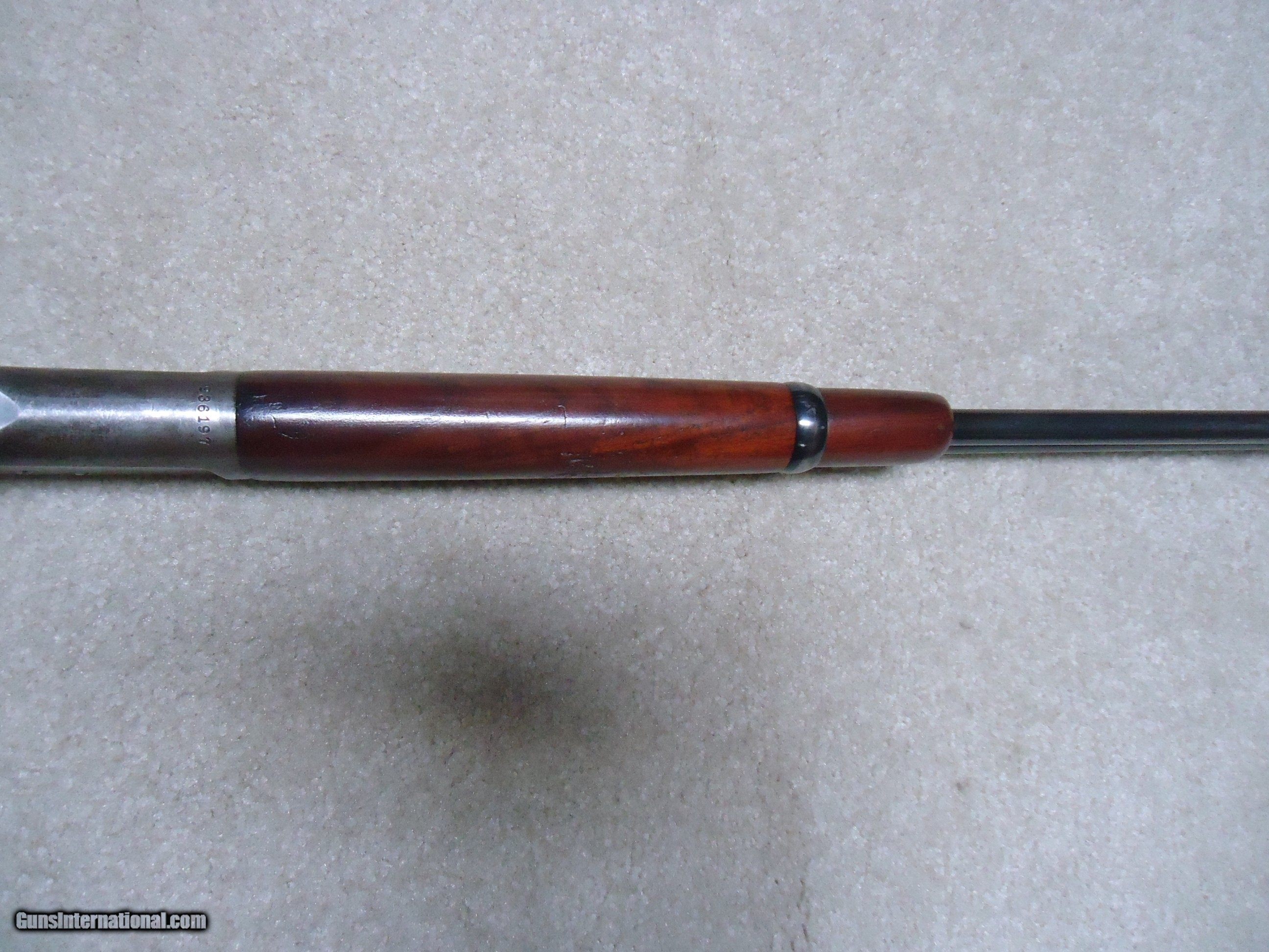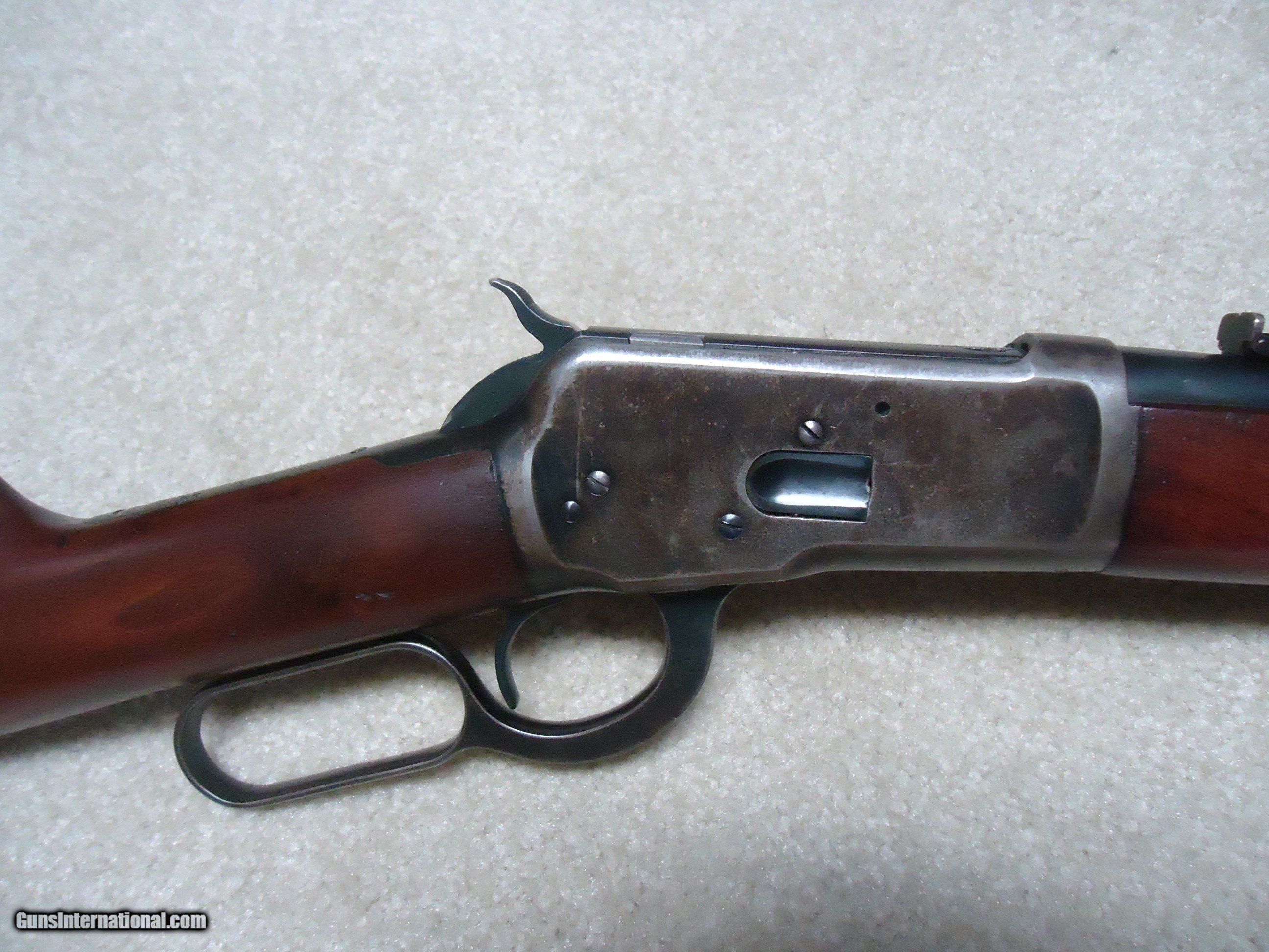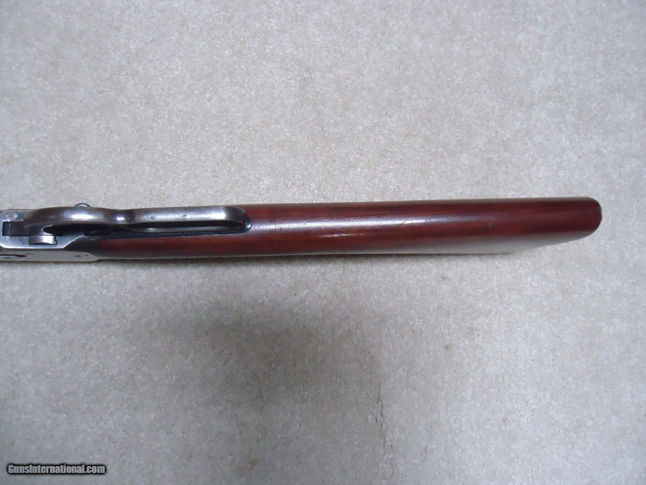 Description: FINE CONDITION 1892 SADDLE RING CARBINE, .32-20, #936XXX, MADE 1924. This is a surprisingly difficult caliber to find in a carbine. I tend to see more in .25-20 and .38-40 than in this caliber. Fine barrel and mag blue with some areas of light thinning toward the muzzle end. As is typical of 1920s vintage 1892s, the receiver shows some flaking of the blue, but still retains some blue in the more protected areas, on the bolt and loading gate. Correct original carbine rear sight with slide intact, exc. screws, fine+ walnut stock and forend with tight wood to metal fit and a few normal handling marks, tight action with strong safety half-cock, bore is fairly bright with strong rifling and some light scattered surface corrosion that is minor. Nice appearance. SOLD Curio/Relic: Yes Rifle Caliber: .32-20 Winchester Manufacturer: WINCHESTER Model: 1892 CARBINRE Serial Number: 936XXX Barrel Length: 20 Condition: FINE |