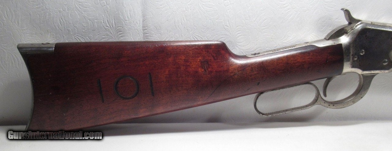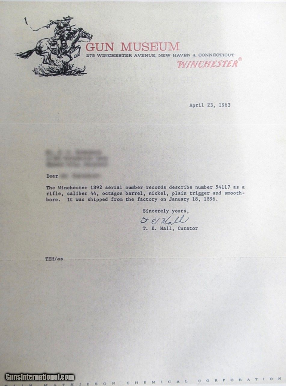 Description: Winchester 1892 Lever Action Rifle; Serial No. 54117; 44 WCF Cal. (44/40); Factory Nickel Plated; Factory Smooth Bore; 24” Barrel; Nearly All Original Factory Nickel Remains; Nice Walnut Wood with “101” Marked on Stock; Perfect Crisp Action; Bore pitted with a ring about 4” back from muzzle; From the Fabulous “101 Ranch” Collection of Buddy King of Canadian, Texas; Very Rare 124 Year-Old Winchester; PERSONAL PROPERTY of Harold Wieser; Price: $12,750 + $60 S&H; Price includes insured shipping; return policy: three days inspection from the date the item is received; full refund of shipping both ways ONLY IF THE ITEM IS MISREPRESENTED. SOLD Manufacturer: Winchester Model: 1892 Serial Number: 54117 |