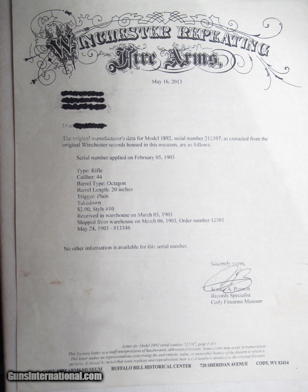 RARE ONE-OF-A-KIND WINCHESTER MODEL 1892 SHORT RIFLE from COLLECTING TEXAS – SHIPPED 1903 – FACTORY LETTER