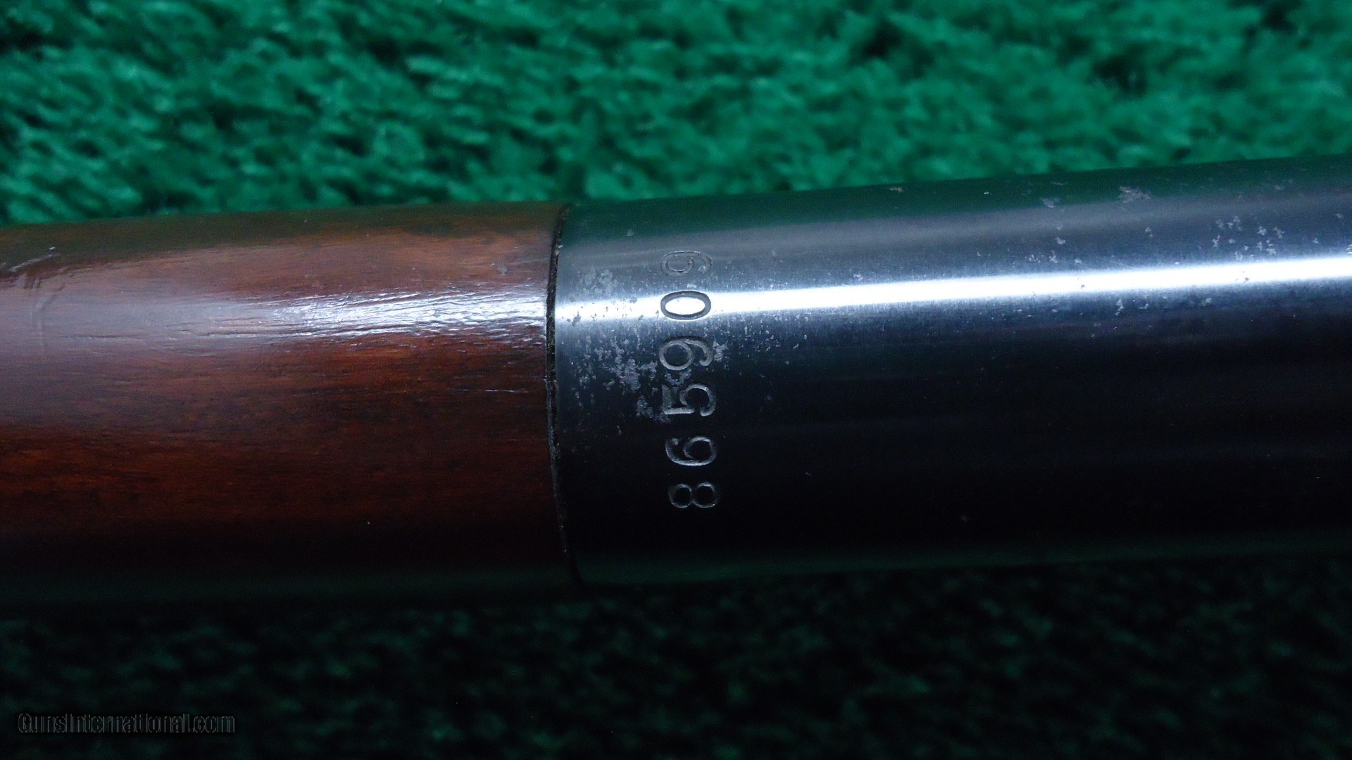Description: 24 inch round barrel chambered in 25-20 WCF caliber with a dovetail blade front sight and an elevation adjustable flat top sporting rear sight. Button magazine is a special order feature. A Winchester factory oval proof is stamped on top of the barrel and receiver at the breech. The straight grip stock is fitted with a solid crescent buttplate and is marked with the period carved initials "CJM" on the right side near the buttplate. The barrel, receiver, bolt and hammer retain about 80% original blue finish with the balance a smooth brown patina. There are a few scattered patches of pitting. The wood is also fine with five notches near the toe, a repaired chip and absent chip at the upper tang and some mild handing marks. Crisp action and an excellent bright shiny bore. Made in 1918. Leroy Merz Antique Firearms specializes in antique and vintage Winchesters and other fine American firearms. Since 1965 Mr. Merz has taken part in the world of firearms and has been a contributor to many well known reference books. We have hundreds of additional guns in every price range at our home online. Search for Merz Antiques in google. SOLD Curio/Relic: Yes Rifle Caliber: .25-20 Winchester |