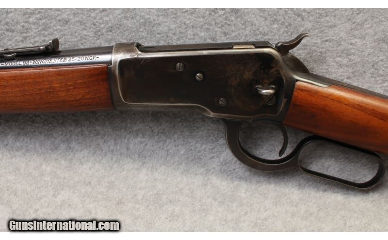 Description: Winchester 1892 rifle chambered in .25-20 Winchester. Sights are a rear ladder sight and front blade sight. Barrel is 20 inches, blued. Bore is bright with strong rifling. Metal is in very good condition with light handling marks on barrel and bluing loss on receiver. Walnut stock and fore end are in very good condition with light handling marks throughout. Rifle is in overall very good condition. Made between 1921-1928. .25-20 WCF SOLD Curio/Relic: Yes Chambers: .25-20 Winchester. Metal Condition: "Very good with light handling marks on barrel, and bluing loss on receiver. Wood Condition: Very good with light handling marks throughout. Bore Condition: "Excellent, bright with strong rifling. Barrels: "20 inches, blued. Fore End: Walnut fore end. Butt Pad: Crescent metal buttplate. Weight: 6 lbs. 6 oz. Sights: Rear ladder sight and front blade sight. Item Location: Tualatin, OR |