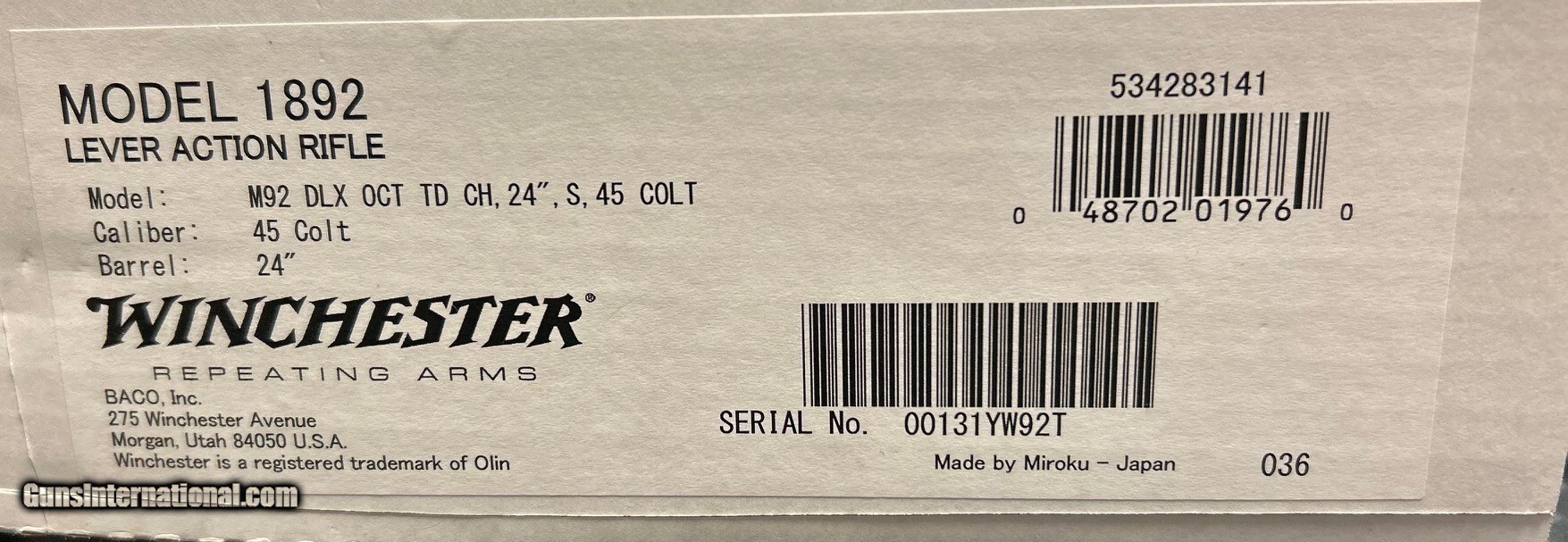 Description: Gorgeous Winchester 1892 Deluxe Takedown .45 Colt. 24 inch barrel. Gorgeous wood with beautiful case color. Hard to get. Serial Number #00131YW92T (NOTE: ADD 3% TO ALL CREDIT CARDS) BUYER PAYS ACTUAL SHIPPING COST SOLD Rifle Caliber: .45 Colt Manufacturer: Winchester Model: 1892 Deluxe Takedown Serial Number: 00131YW92T Barrel Length: 24 Condition: Factory New |