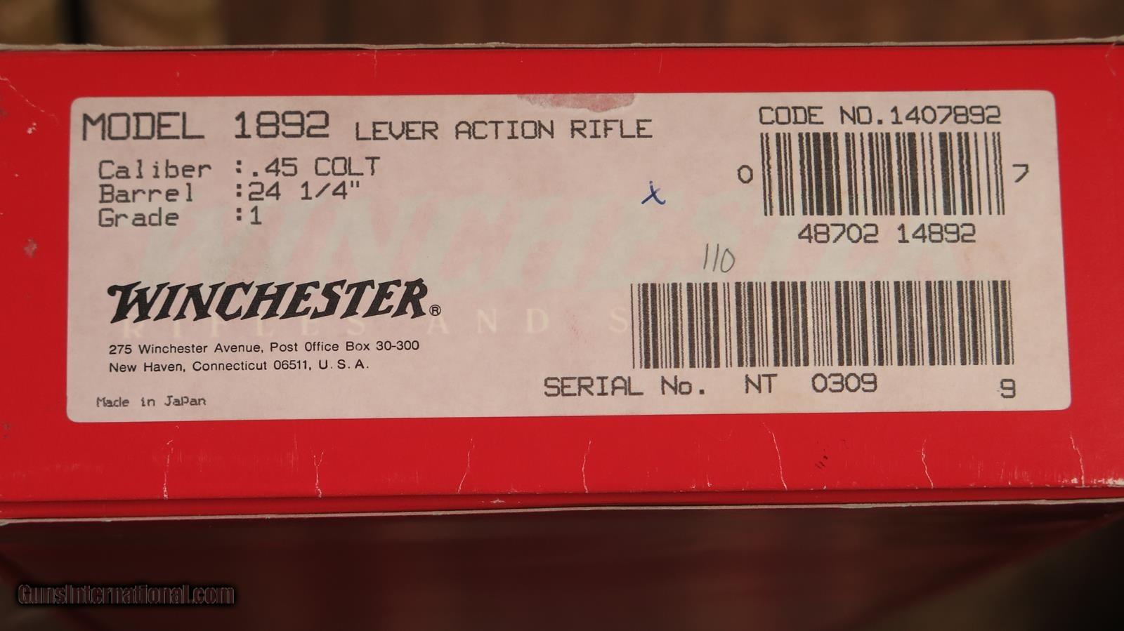 Description: Winchester 1892 Grade 1 45 Colt. 24 1/4 inch barrel. Engraved receiver. 98% condition in original box. SOLD |