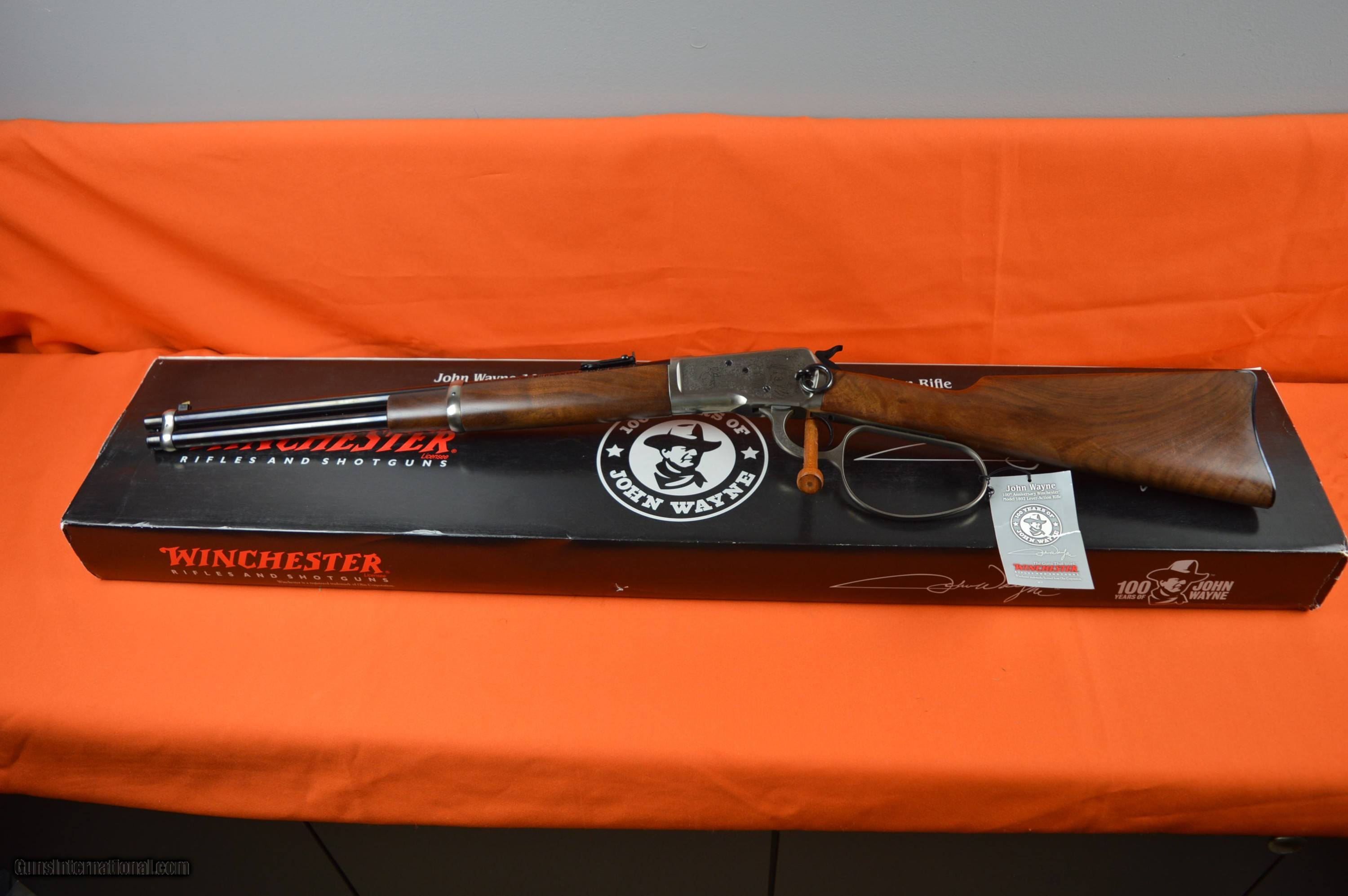 Description: NO SALES TAX ON OUT OF STATE SALES Winchester 1892 John Wayne Edition Carbines - Matched Set Both have serial# 319 - Rare to have both rifles with matching #'s Chambered in 44-40 18 1/2" barrels High Grade has Silver Nitride Receiver Custom Grade is blued with Gold Highlights Both guns are highly engraved with John Wayne portrait Both guns are New In Box - Unfired Condition Both have original boxes & paperwork. Custom grade has Custom Leather Case More pictures available SOLD Rifle Caliber: .44-40 Winchester Manufacturer: Winchester Model: 1895 Serial Number: 319 Condition: NIB |