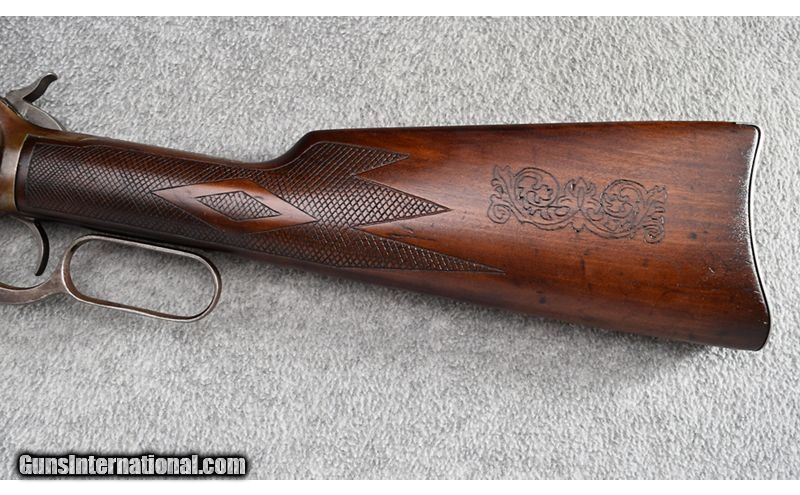 Description: This Winchester Model 1892 was manufactured in 1916 and remains in good overall condition. Wood is solid and has been carved with checkering on forend and butt, and oak leaf designs on both sides of stock by unknown artist. Forend has some freckling on both sides like it has been next to a heat source. Blue is very good but does show some light oxidation in places. Front sight appears to have been replaced, and rear sight elevator is missing. Full length magazine tube. Receiver and lever show no case color or blue and have patinaed with oxidation. Receiver has been drilled long ago for a side mount scope and ring is missing from saddle ring. Function appears good. No box. .25-20 WCF SOLD Curio/Relic: Yes Metal Condition: Good Wood Condition: Good Bore Condition: Very Good Barrels: 20 Triggers: Factory Stock Dimensions: 12 3/4" LOP Fore End: Checkered Walnut Straight Grip - Checkered Walnut Forend Butt Pad: Crescent Metal Butt Plate Weight: 6 lbs. Sights: Post & Bead Front - Marbles Buckhorn Rear with missing Elevator Item Location: Wheeling |