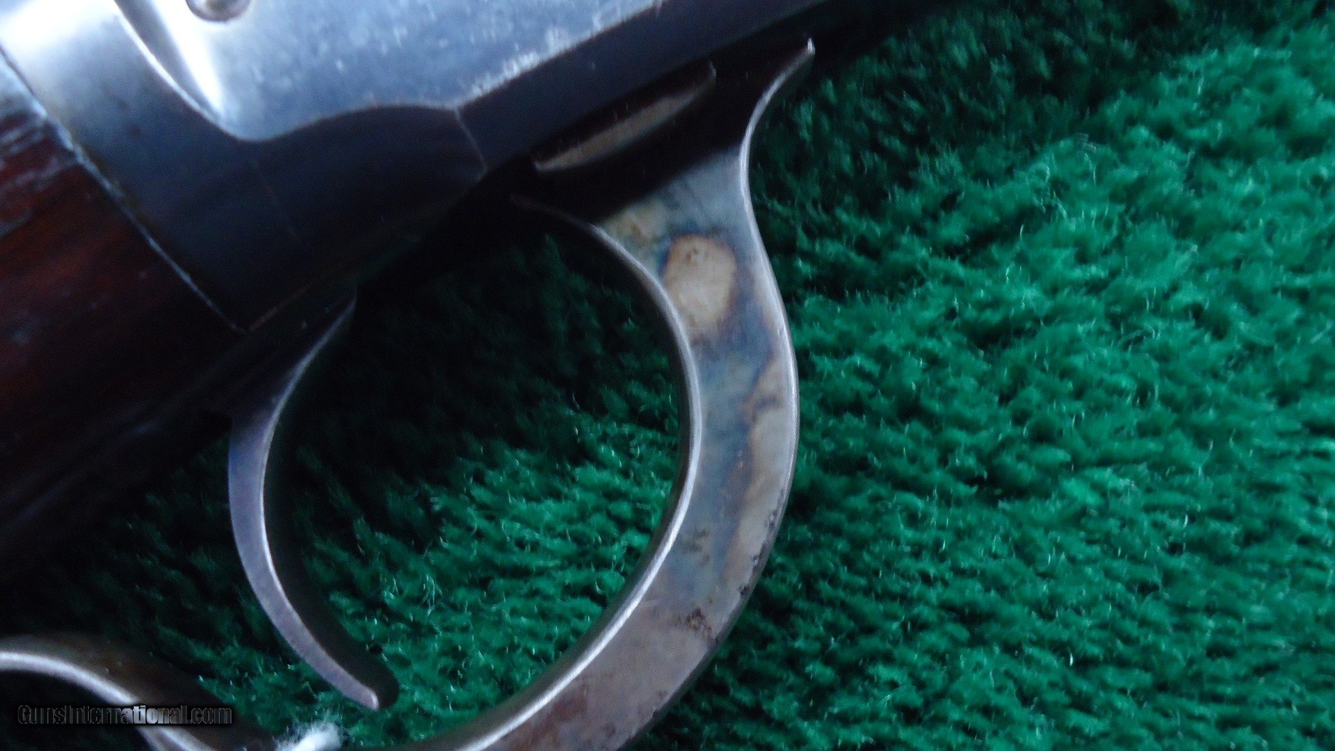 Description: 20 inch barrel with full length magazine. Excellent bore that is bright and shiny with strong rifling. Sights include a Nickel Silver pinned blade front and folding ladder rear. Overall metal surfaces appear mostly smooth with several areas of light to moderate pitting scattered here and there. Barrel, magazine and receiver retain about 80-90% deep dark blue finish with vivid case colors on the hammer and lever. There are British proofs on the left of the barrel at the breech and on the receiver. Walnut stocks are excellent showing near all original finish with only light handling marks. Carbine buttplate. Action is crisp and tight. Manufactured in1903. Nice 44 WCF caliber Carbine showing very little use overall. Leroy Merz Antique Firearms specializes in antique and vintage Winchesters and other fine American firearms. Since 1965 Mr. Merz has taken part in the world of firearms and has been a contributor to many well known reference books. We have hundreds of additional guns in every price range at our home online. Search for Merz Antiques in google. SOLD Curio/Relic: Yes Rifle Caliber: .44-40 Winchester |