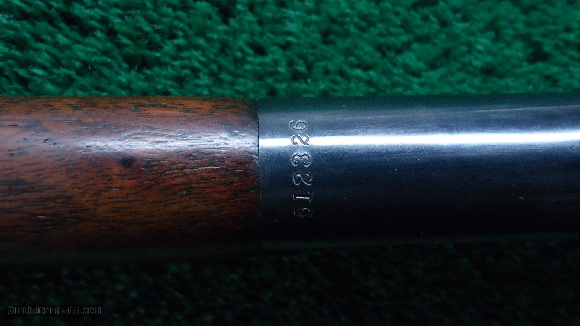 20 inch barrel shows 95% original blue. Excellent bore is bright and shiny with strong rifling. Upgraded sights include an Ivory bead pinned blade front, a Lyman two leaf folding rear and a Lyman combination tang sight. Receiver is marked MOD./1892 on upper tang behind the hammer and shows 85% blue with light wear and handling marks having only a faint ghost ring from saddle ring wear. Lever and hammer show a good deal of the color case hardened finish. Walnut stocks are solid and full fitting with only minimal wear and light handling marks. It’s hard to find carbines in this high condition. Manufactured in 1909.