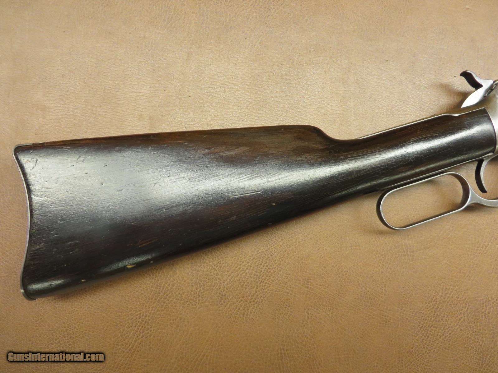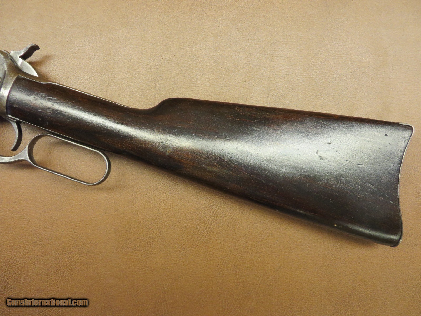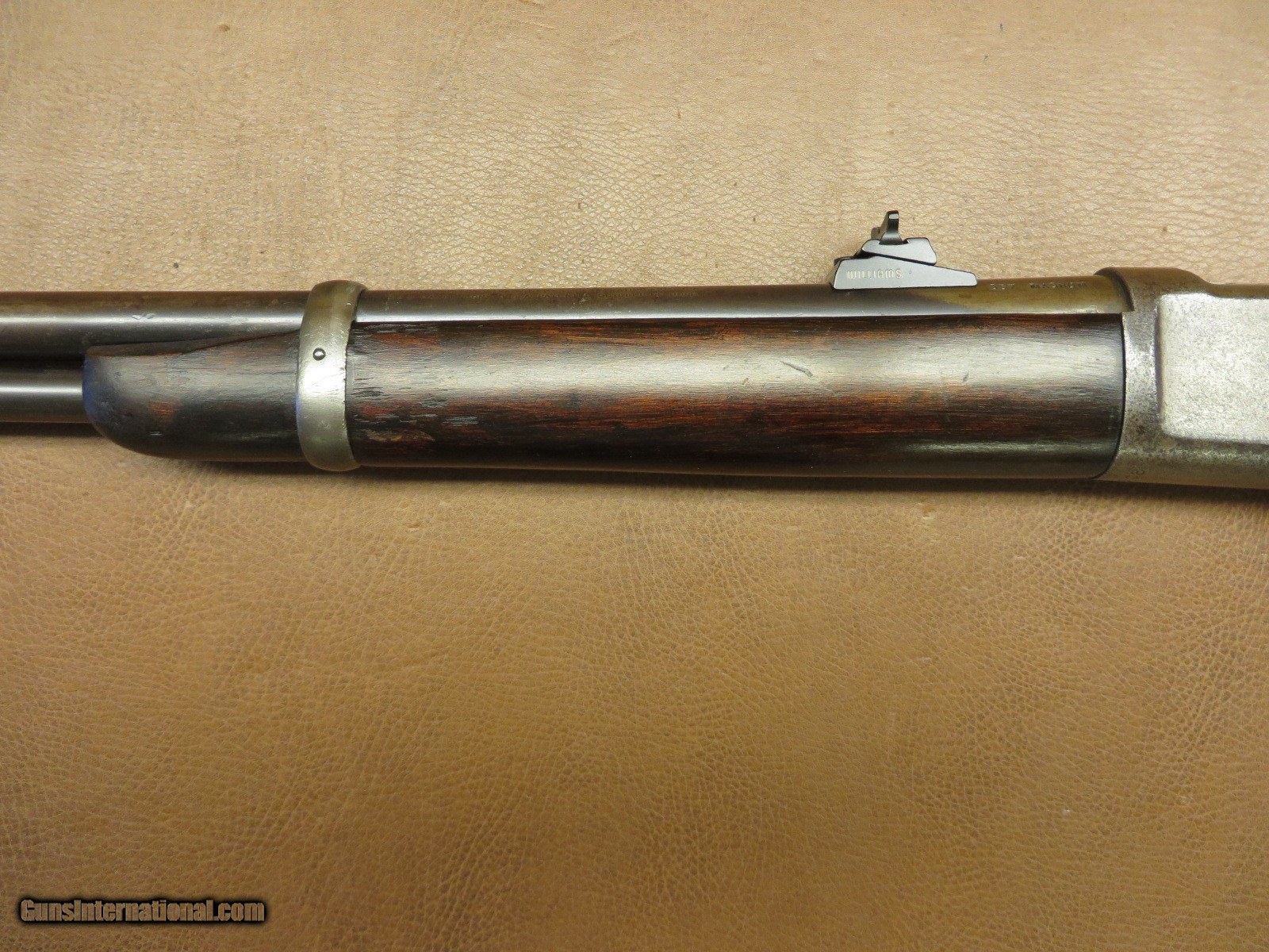 Description: Made in 1909 and converted to .357 Magnum with original 20 inch rebored barrel. Williams adjustable sights. Serial number 491xxx. Stud for saddle ring has been cut and ring removed. Export model with Mod. 1892 across the tang behind the hammer. Refinished non checkered wood with original steel carbine butt plate. Sliver of wood missing on left side of forend in front of band. Metal mostly gray. SOLD Rifle Caliber: .357 Magnum |