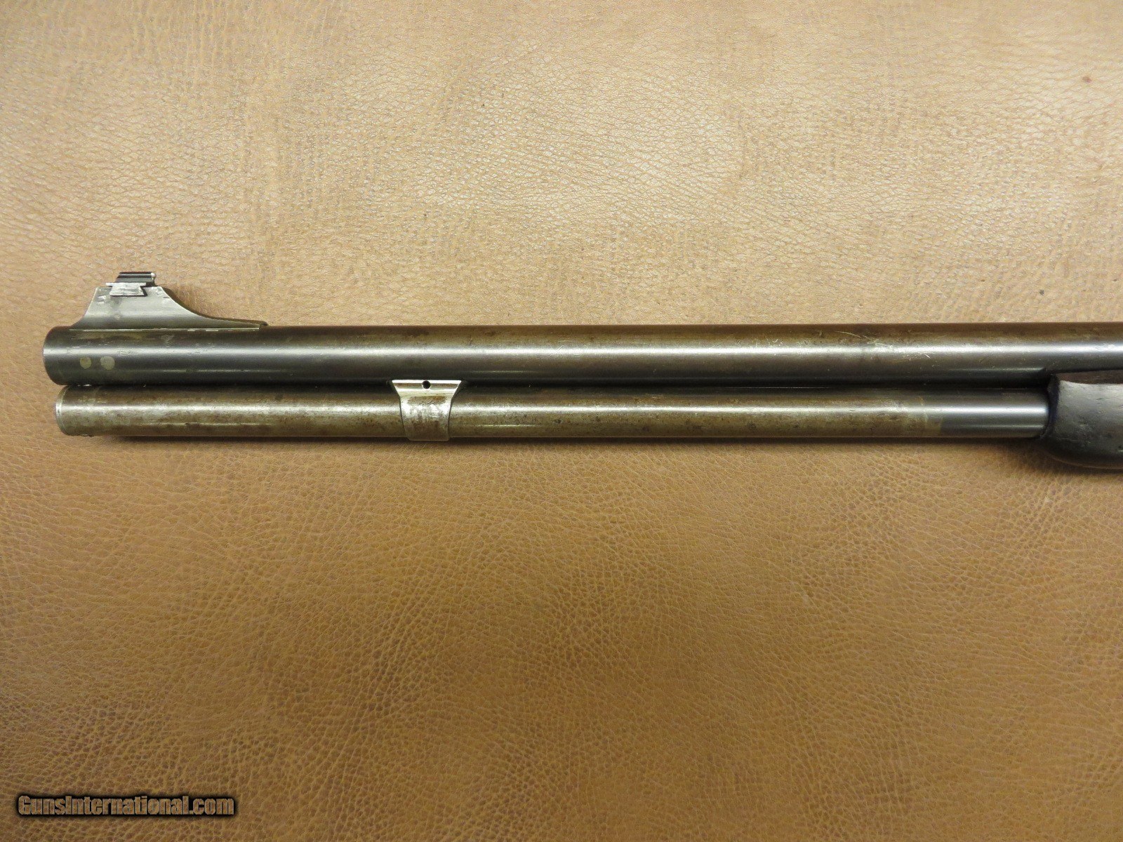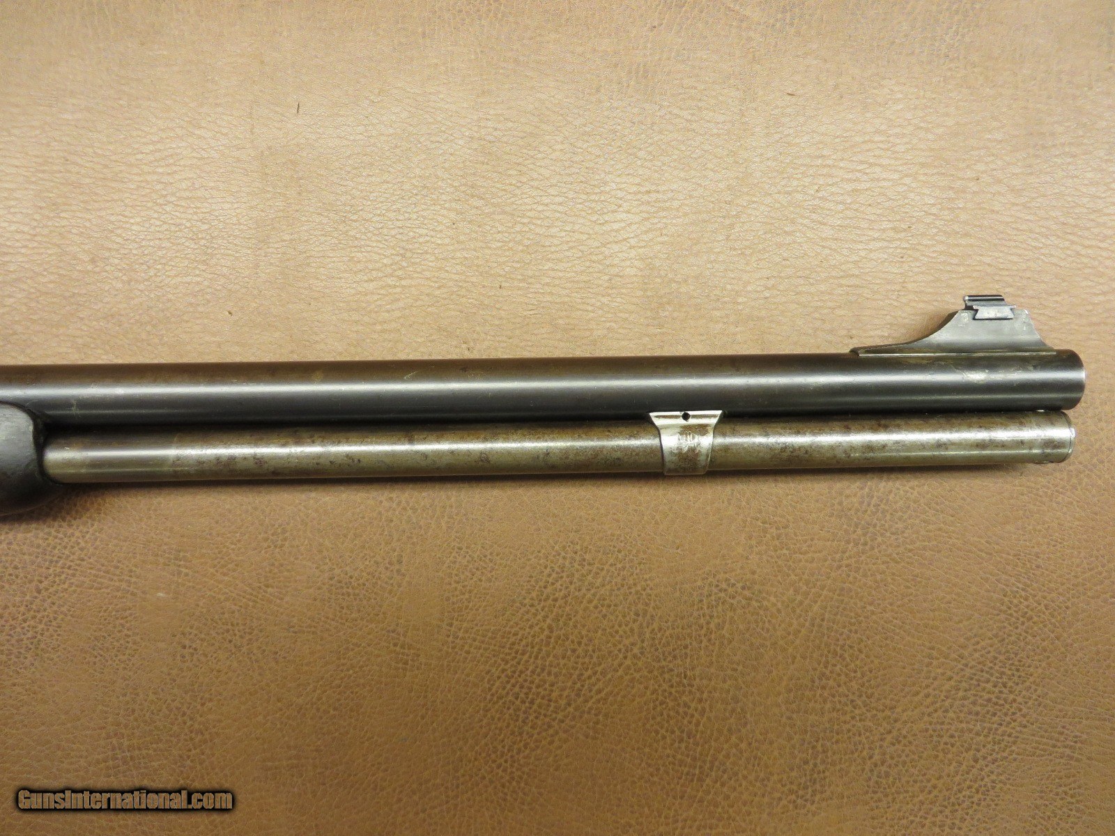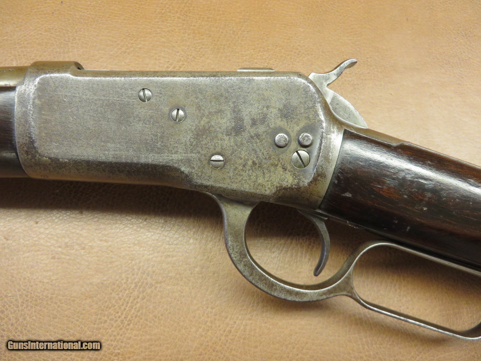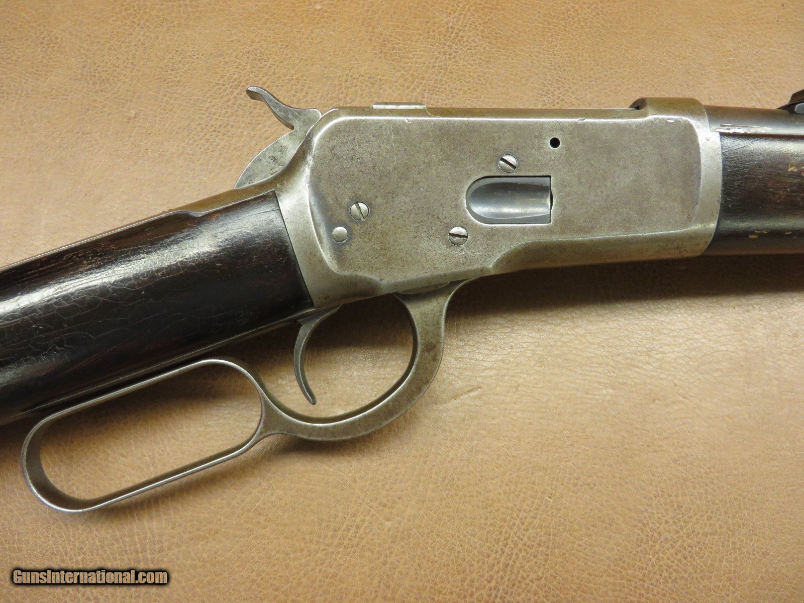 Description: Made in 1909 and converted to .357 Magnum with original 20 inch rebored barrel. Williams adjustable sights. Serial number 491xxx. Stud for saddle ring has been cut and ring removed. Export model with Mod. 1892 across the tang behind the hammer. Refinished non checkered wood with original steel carbine butt plate. Sliver of wood missing on left side of forend in front of band. Metal mostly gray. SOLD Rifle Caliber: .357 Magnum |