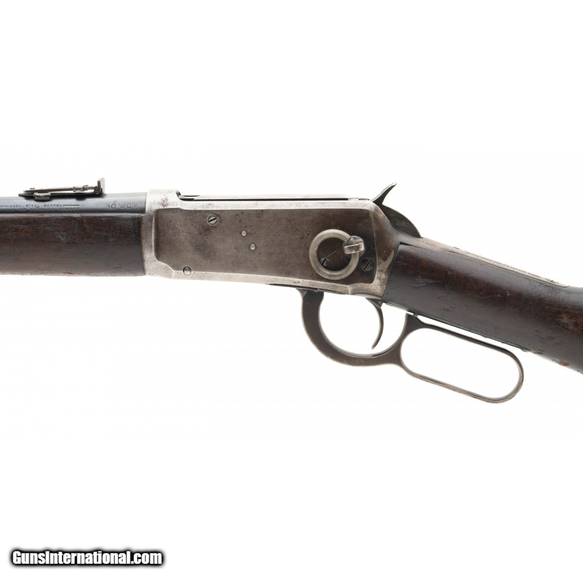 Description: "Serial number 831080. Made in 1918. 30-30 caliber with 20" barrel. The barrel has 90% of the original blue. The frame has mostly turned to a gray patina. Wood is very good but does show normal use. The butt plate has pitting. The action works perfectly and the bore has strong rifling but is dark. Very fine Winchester 1894 saddle ring carbine! SOLD Curio/Relic: Yes |