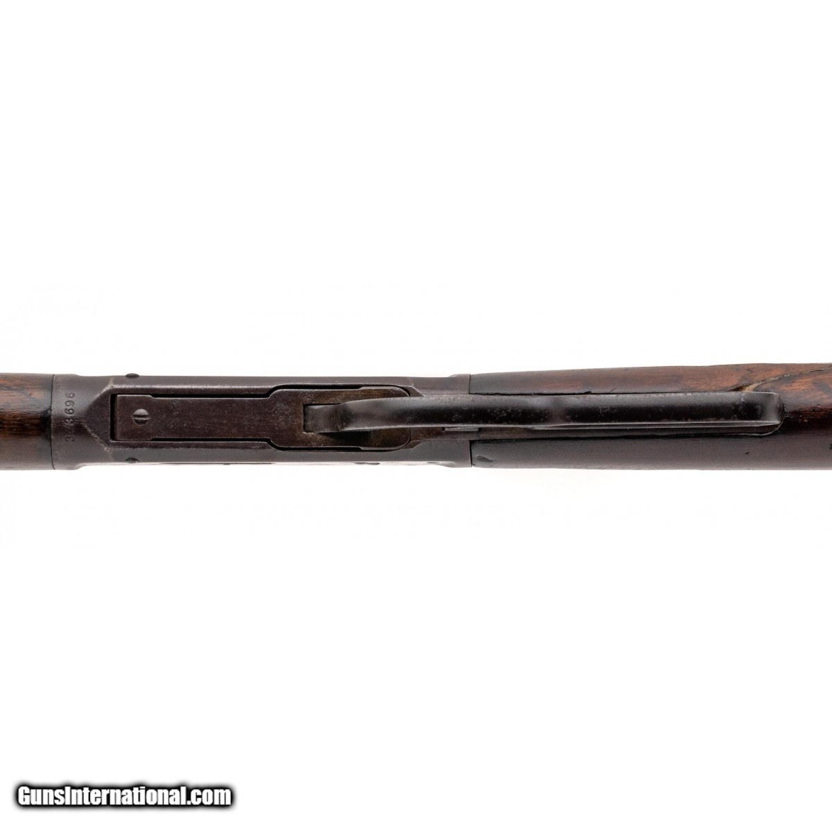 SN: 343696. Made in 1906. .30 WCF with a 24"" inch barrel. Bore is in fair condition . Pre-war lever action rifle with wood stock showing signs of wear and repair and two holes drilled in wood. Brown patina on receiver and barrel. Overall good condition.